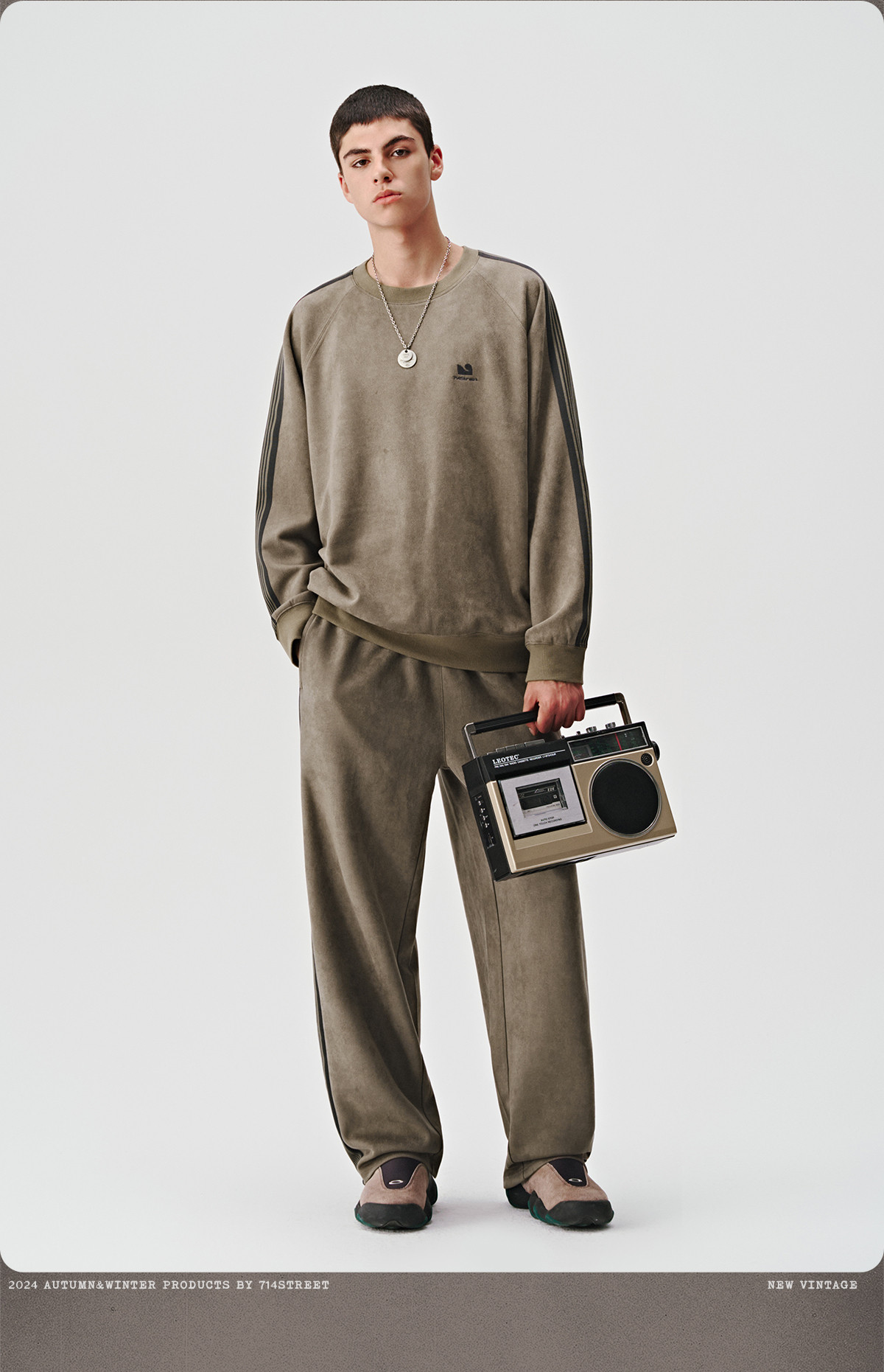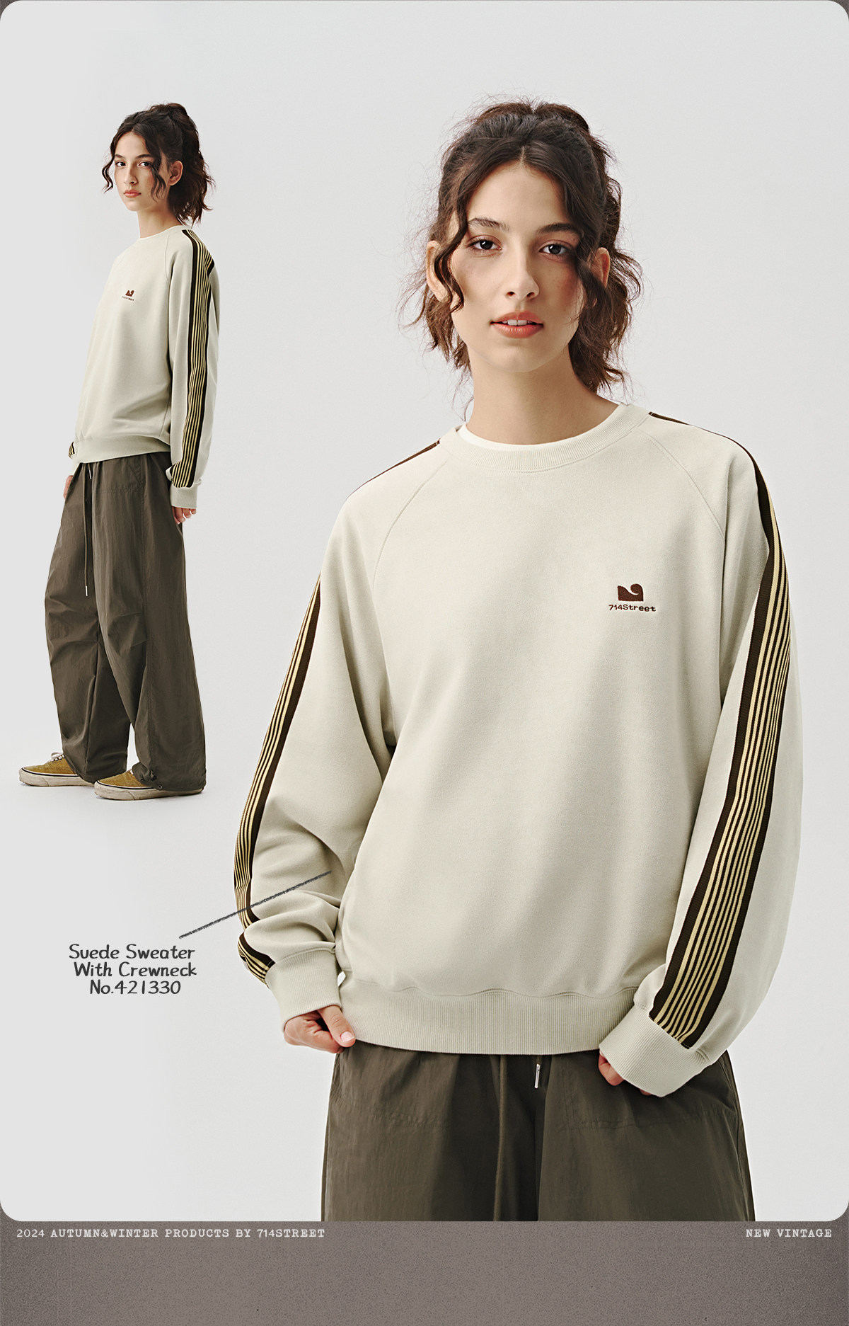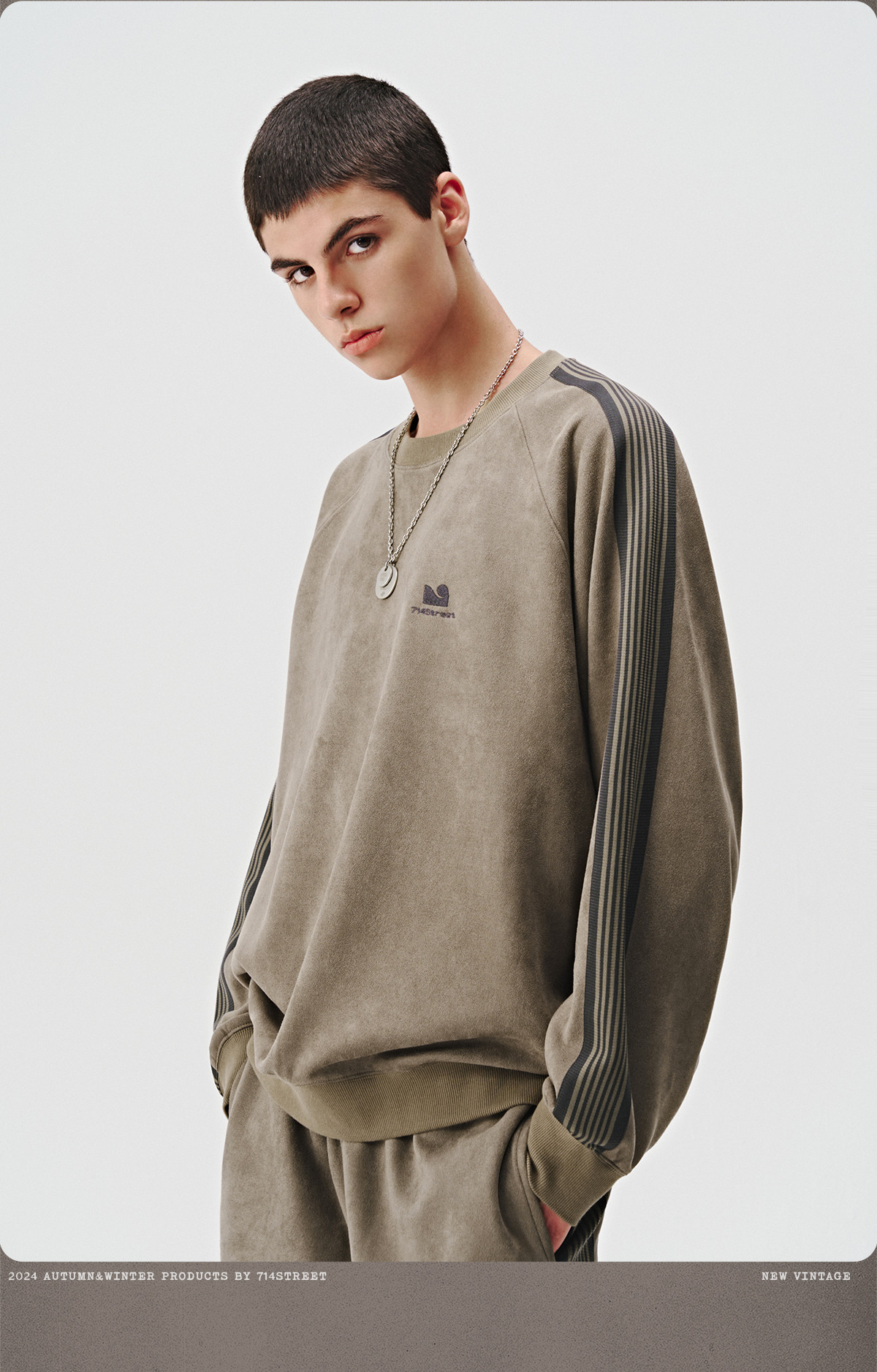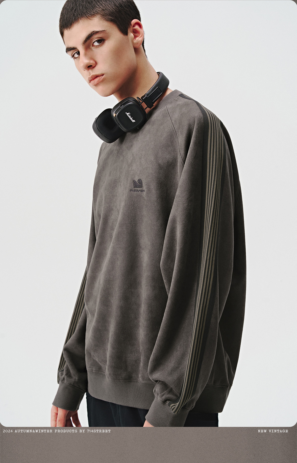 714street麂皮绒织带美式复古卫衣男女同款套装2024秋季新款上衣