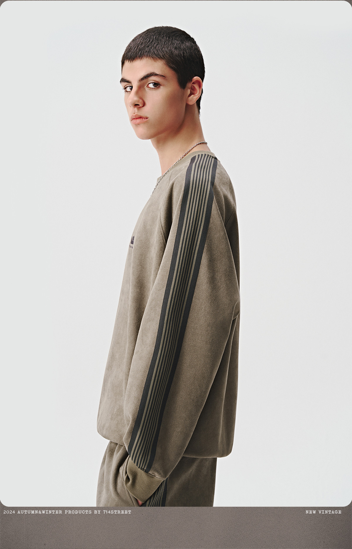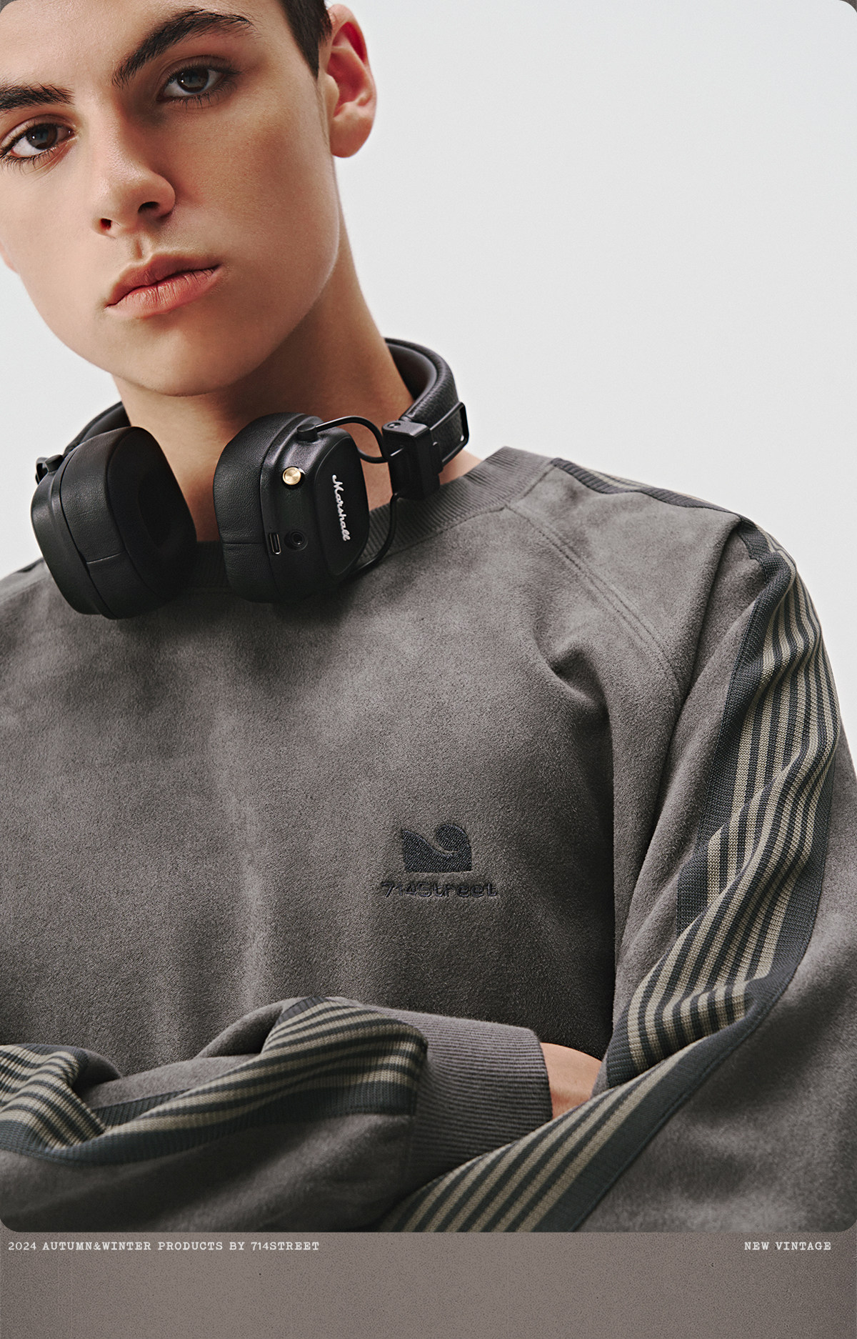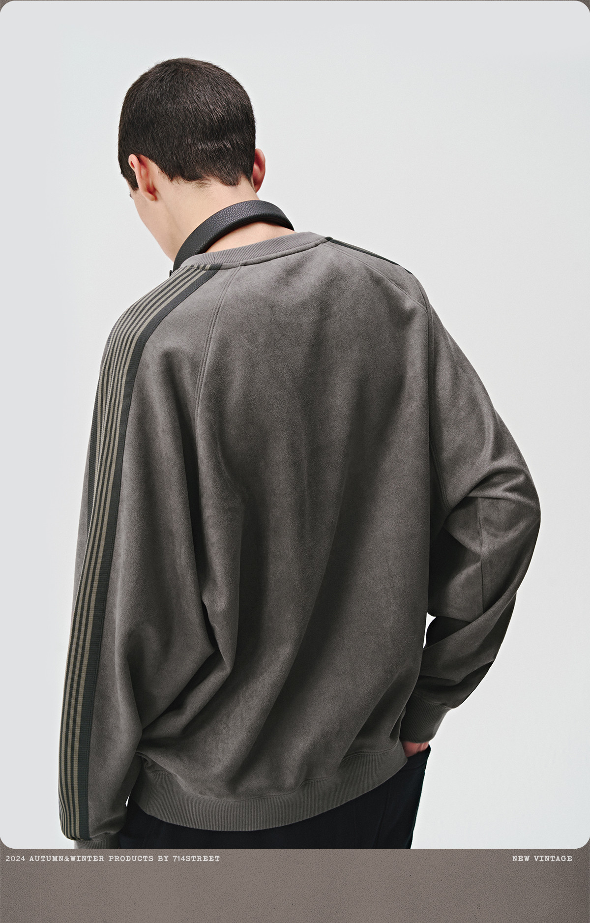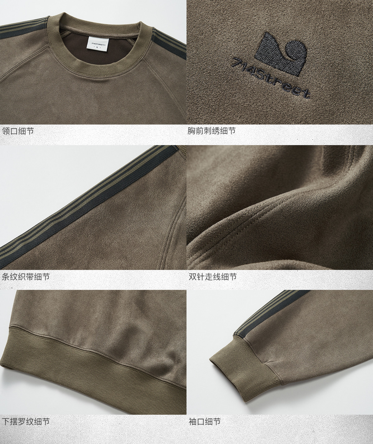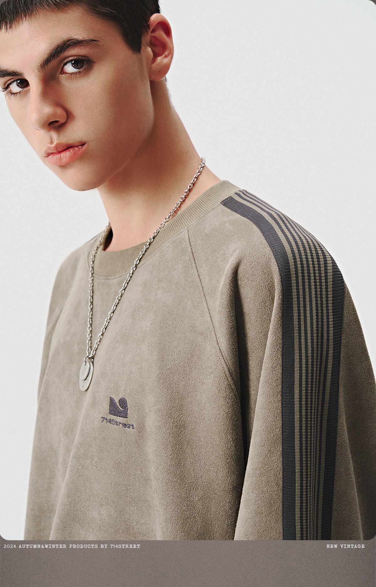 714street麂皮绒织带美式复古卫衣男女同款套装2024秋季新款上衣