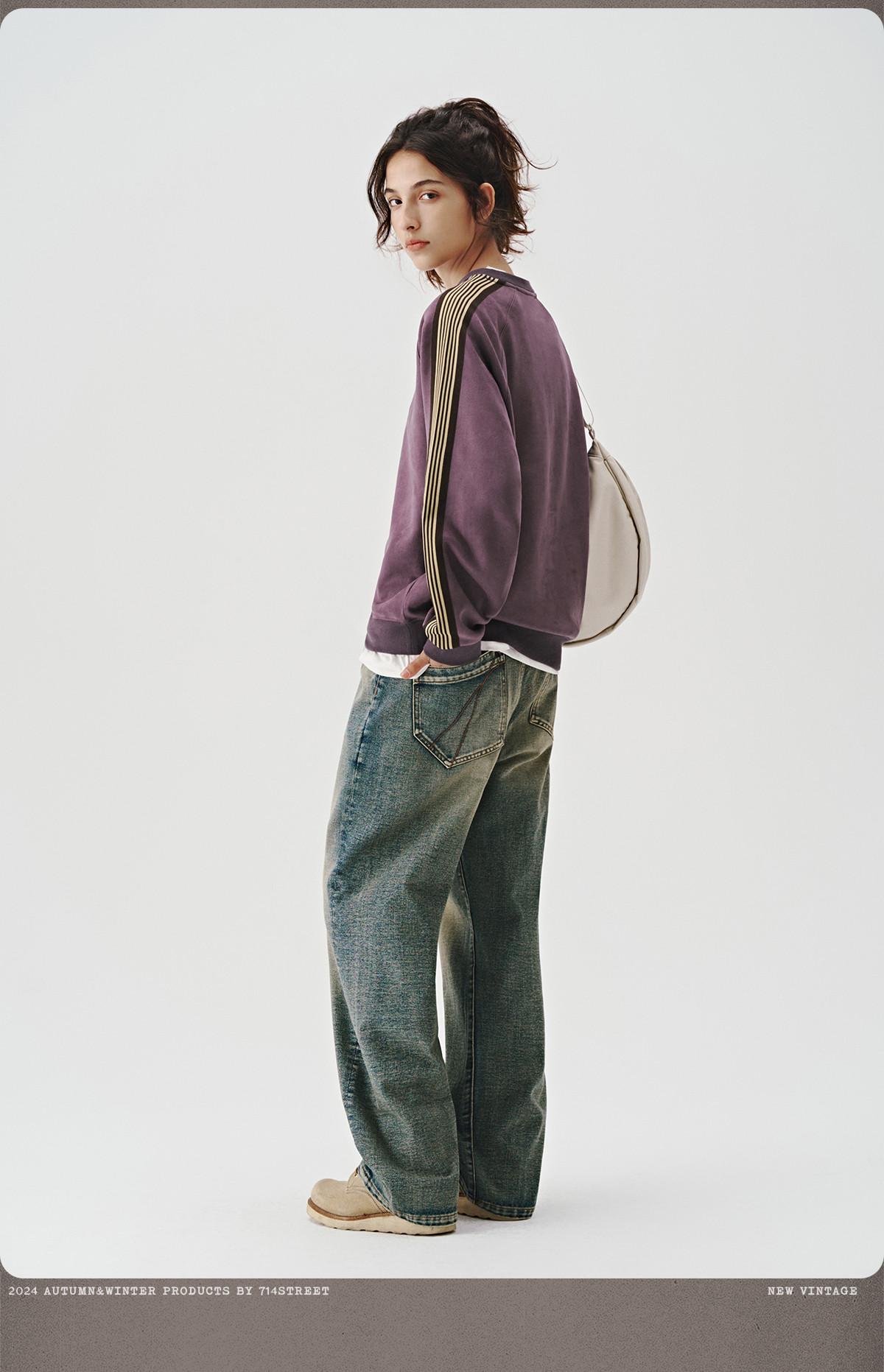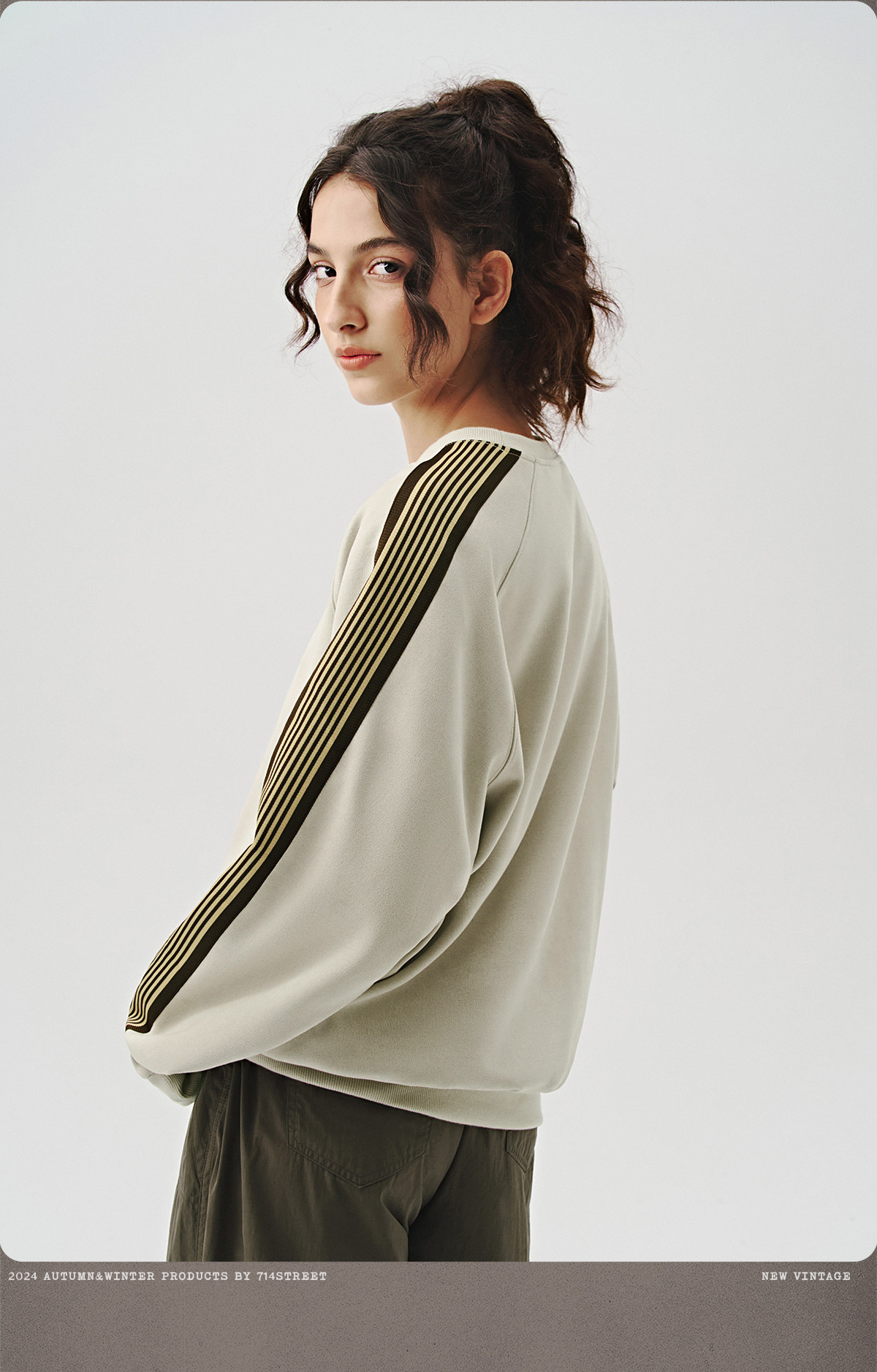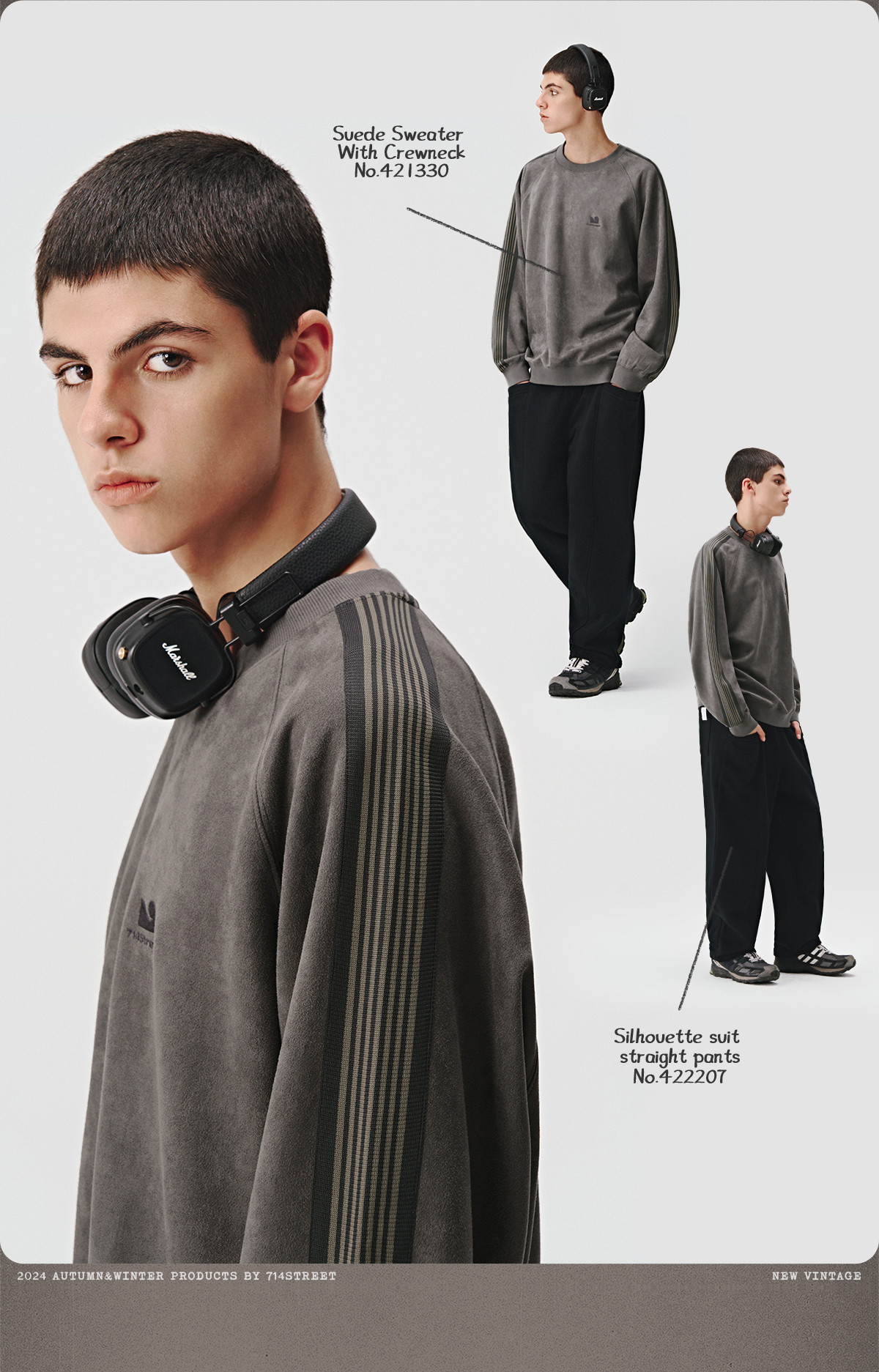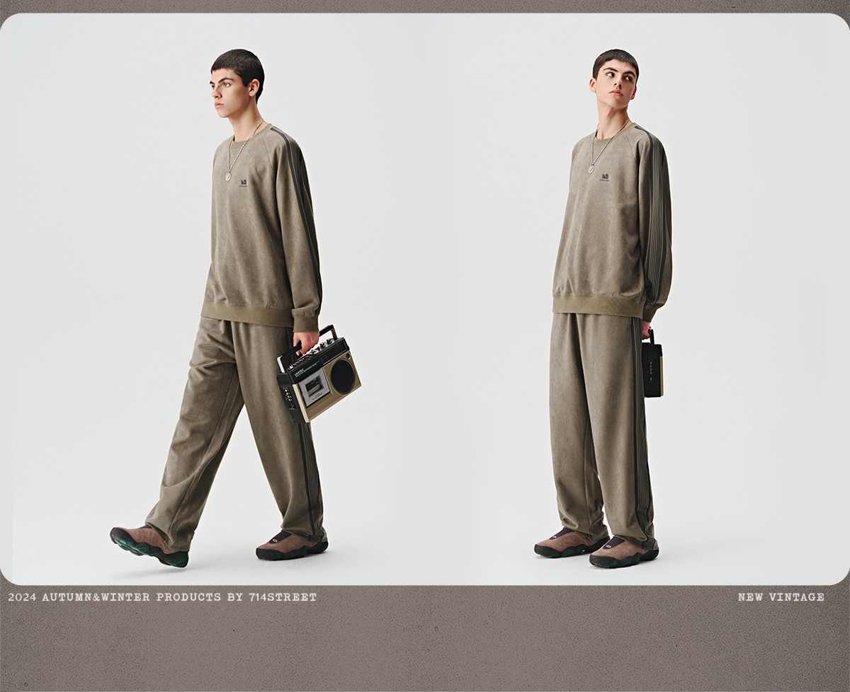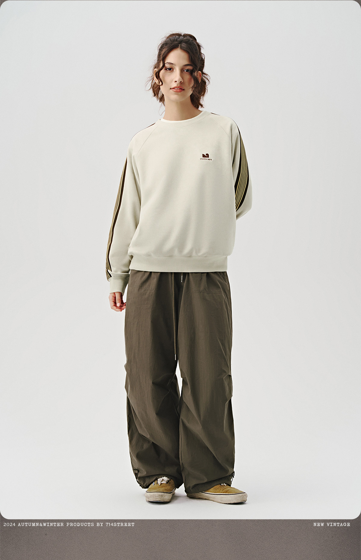 714street麂皮绒织带美式复古卫衣男女同款套装2024秋季新款上衣