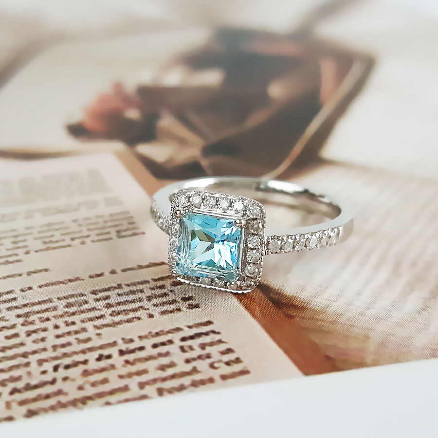 【天然正品】AU750白金镶钻天然公主方型0.726克拉海蓝宝石戒指11号(戒圈可改)女士081025TJ13现售价:3880