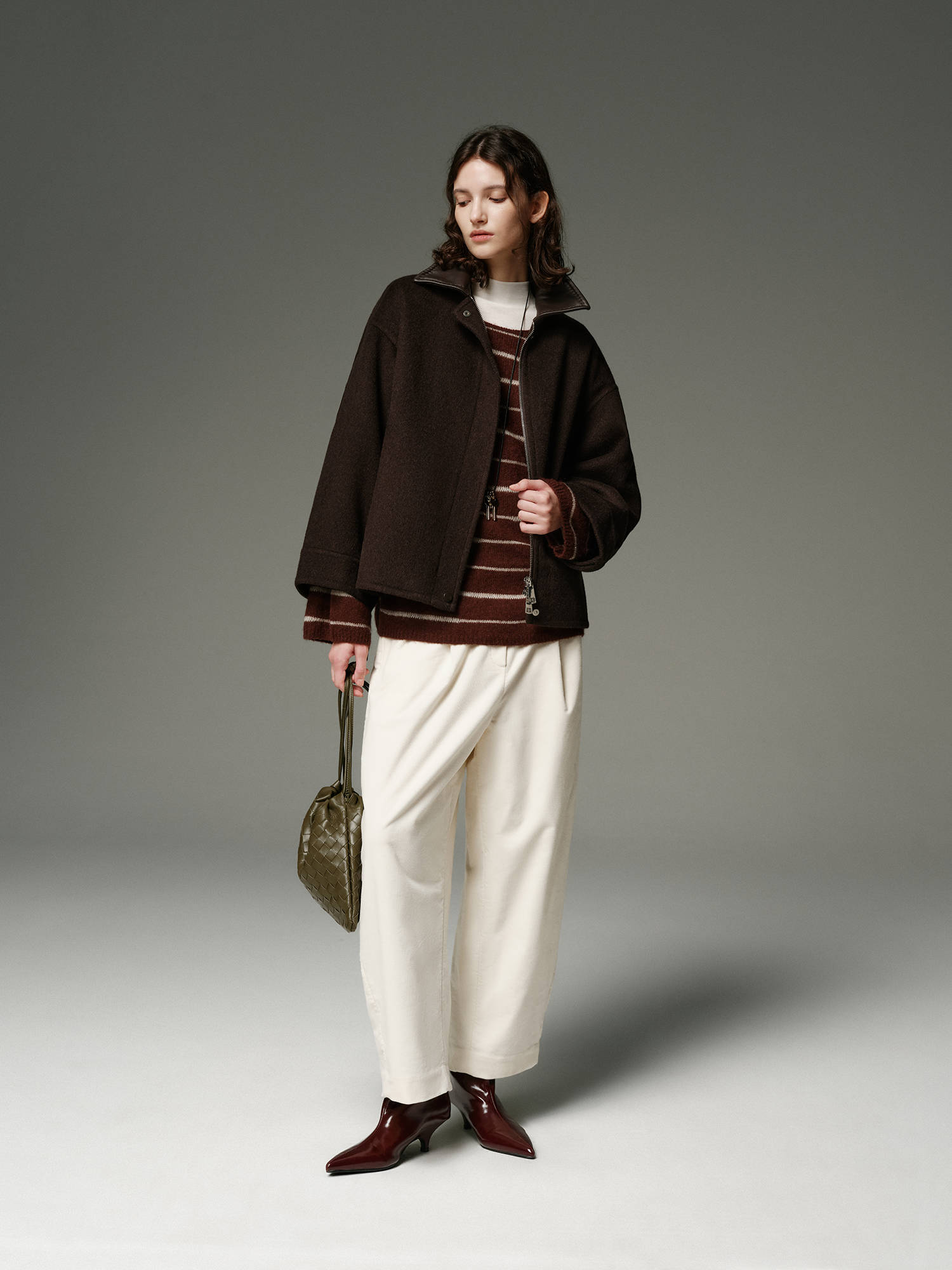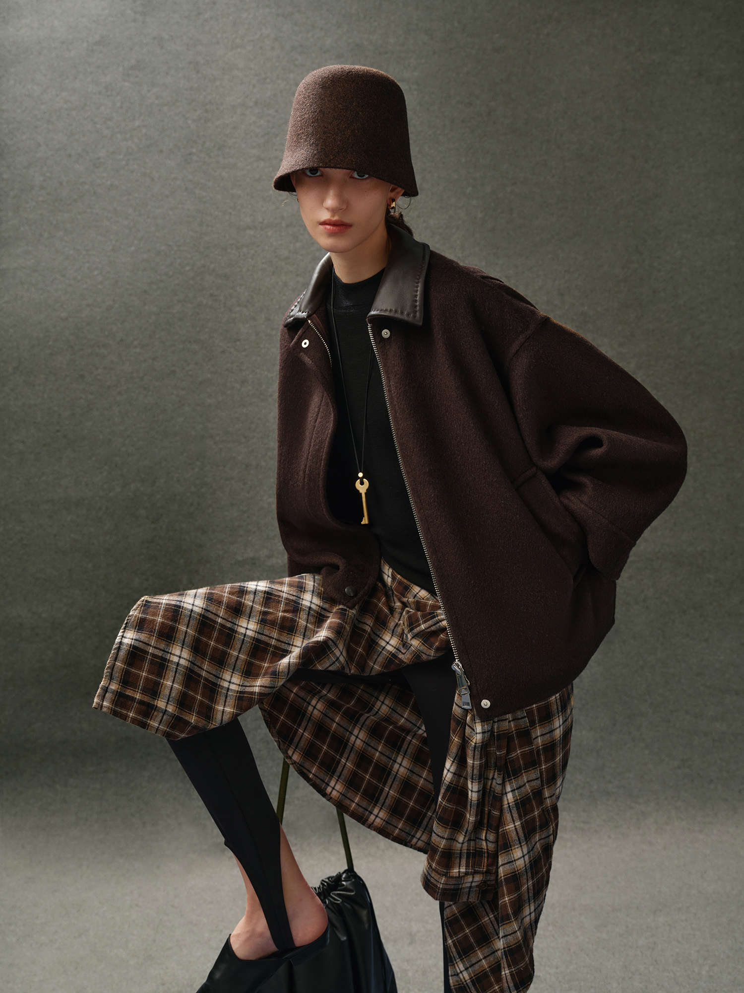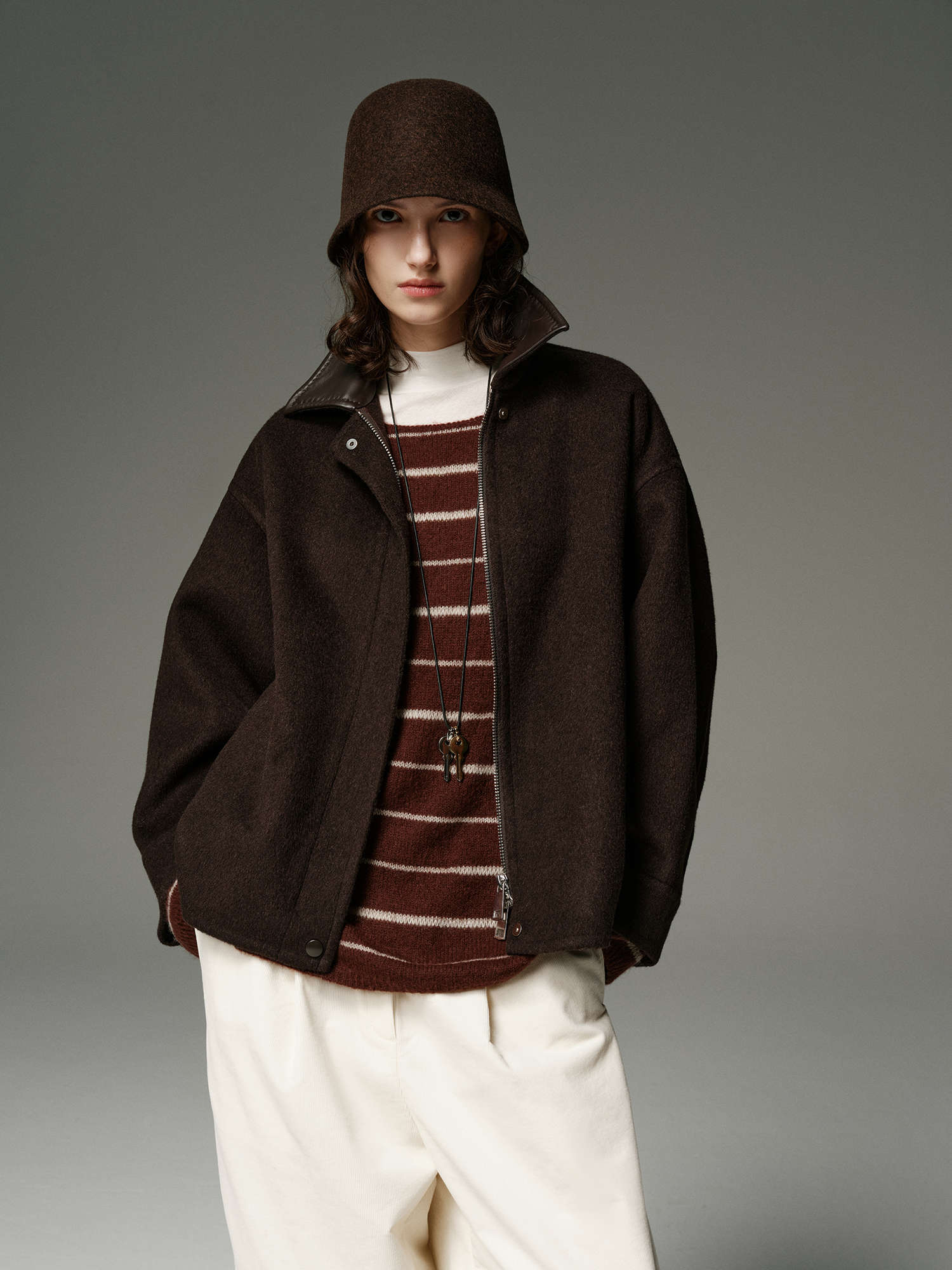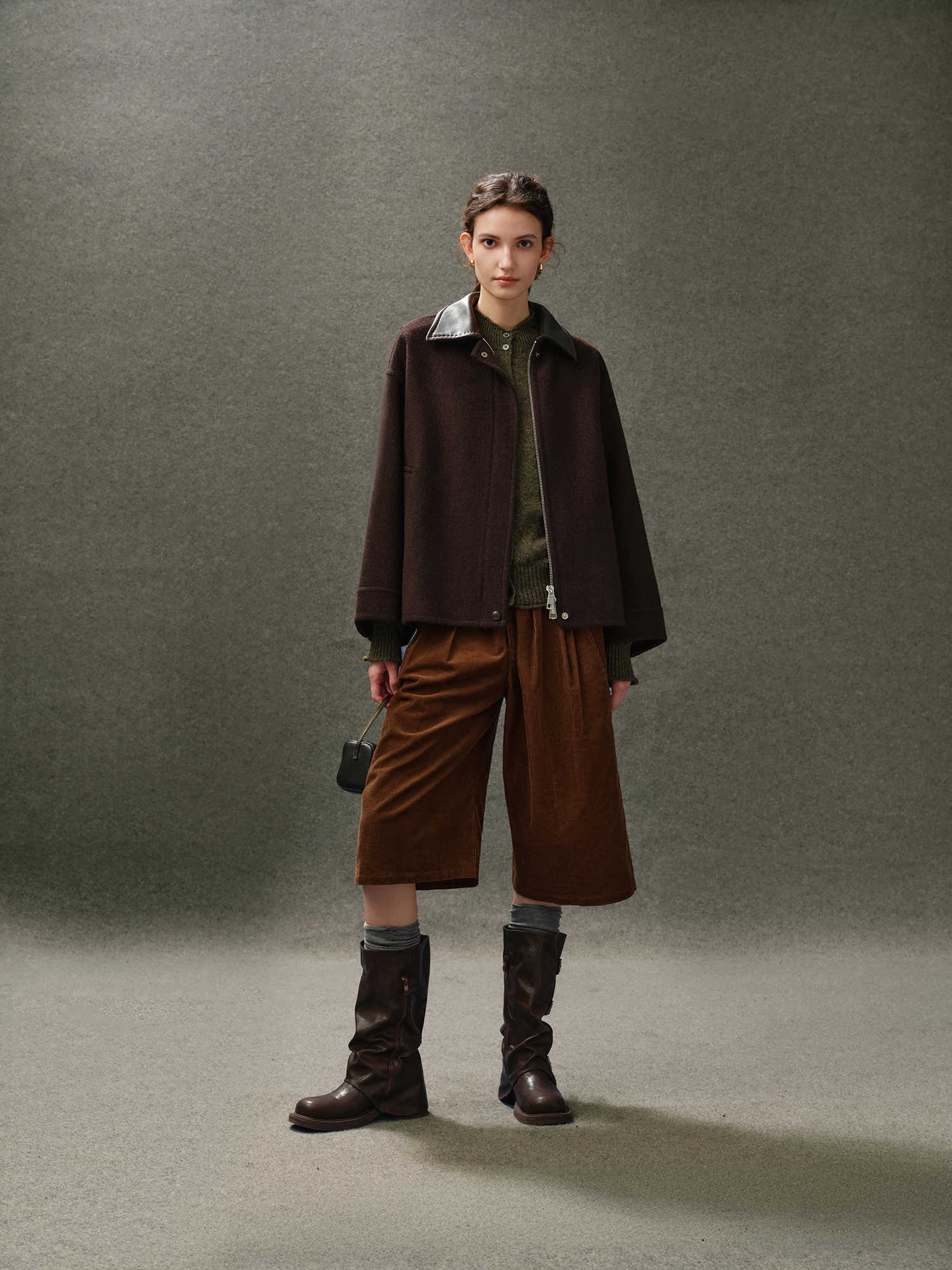 N°28【零压感】秋冬季山羊绒短外套女皮质拼接翻领羊毛夹克上衣8855A1D727