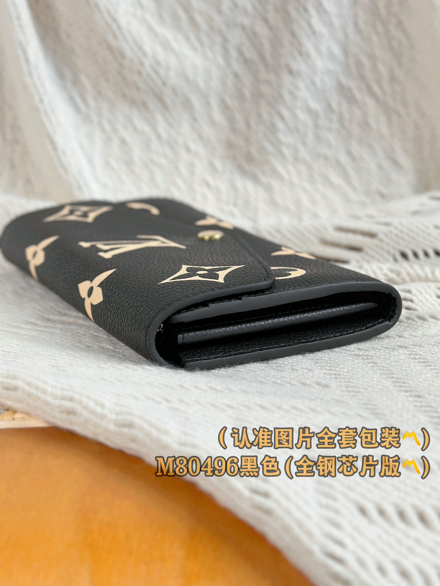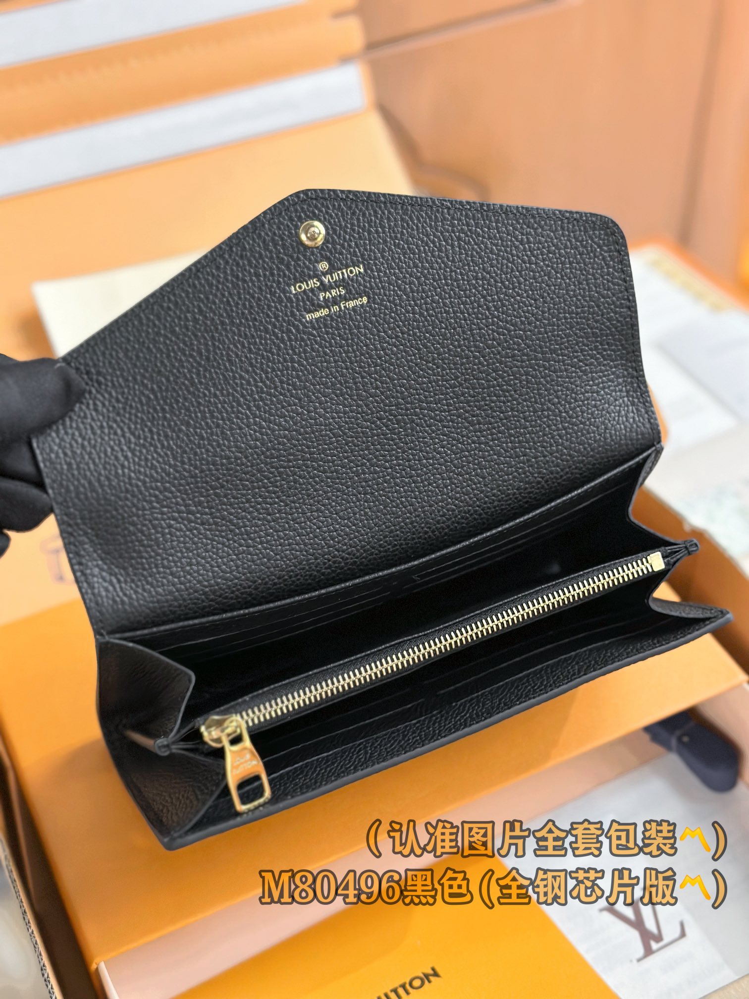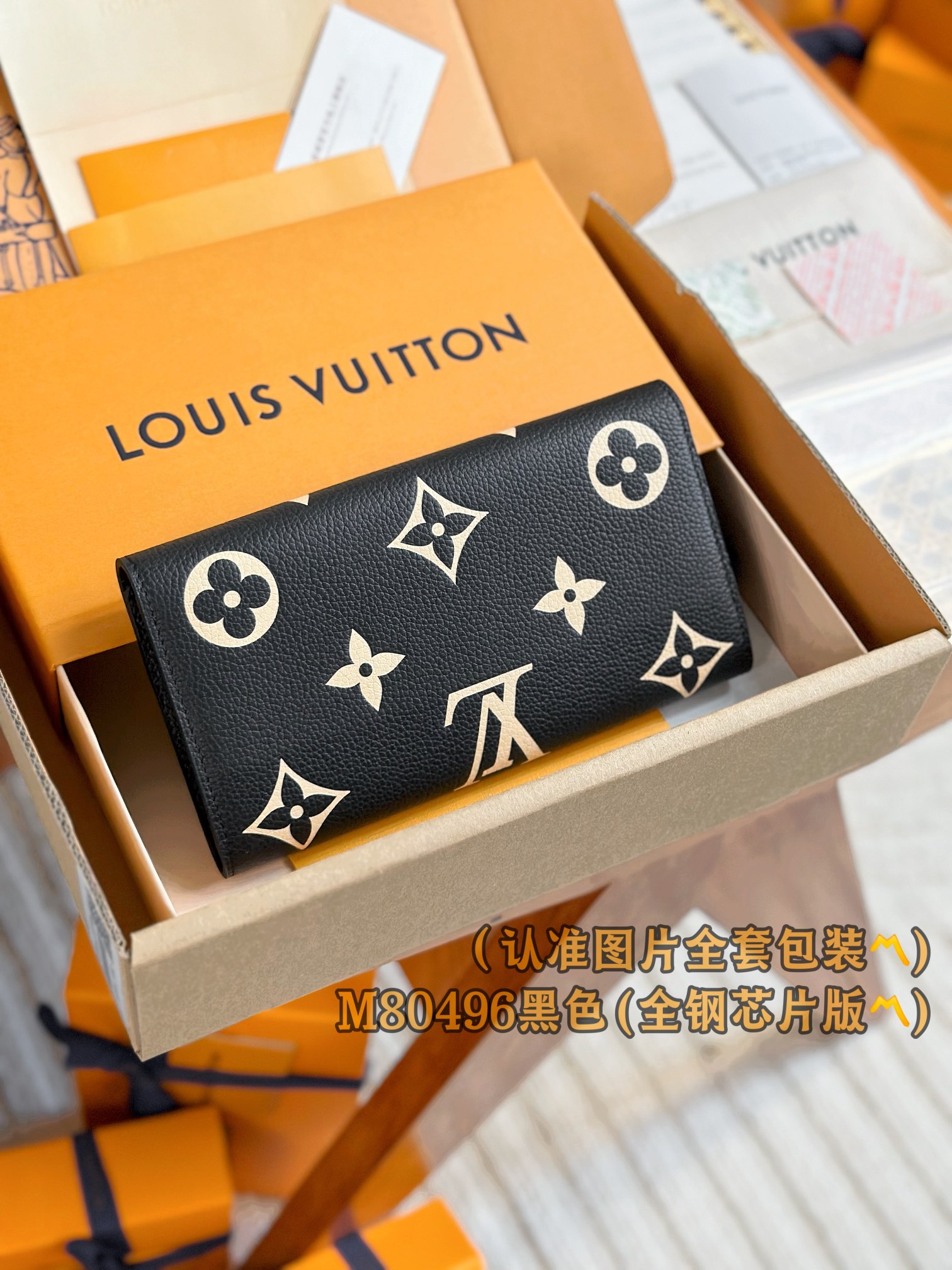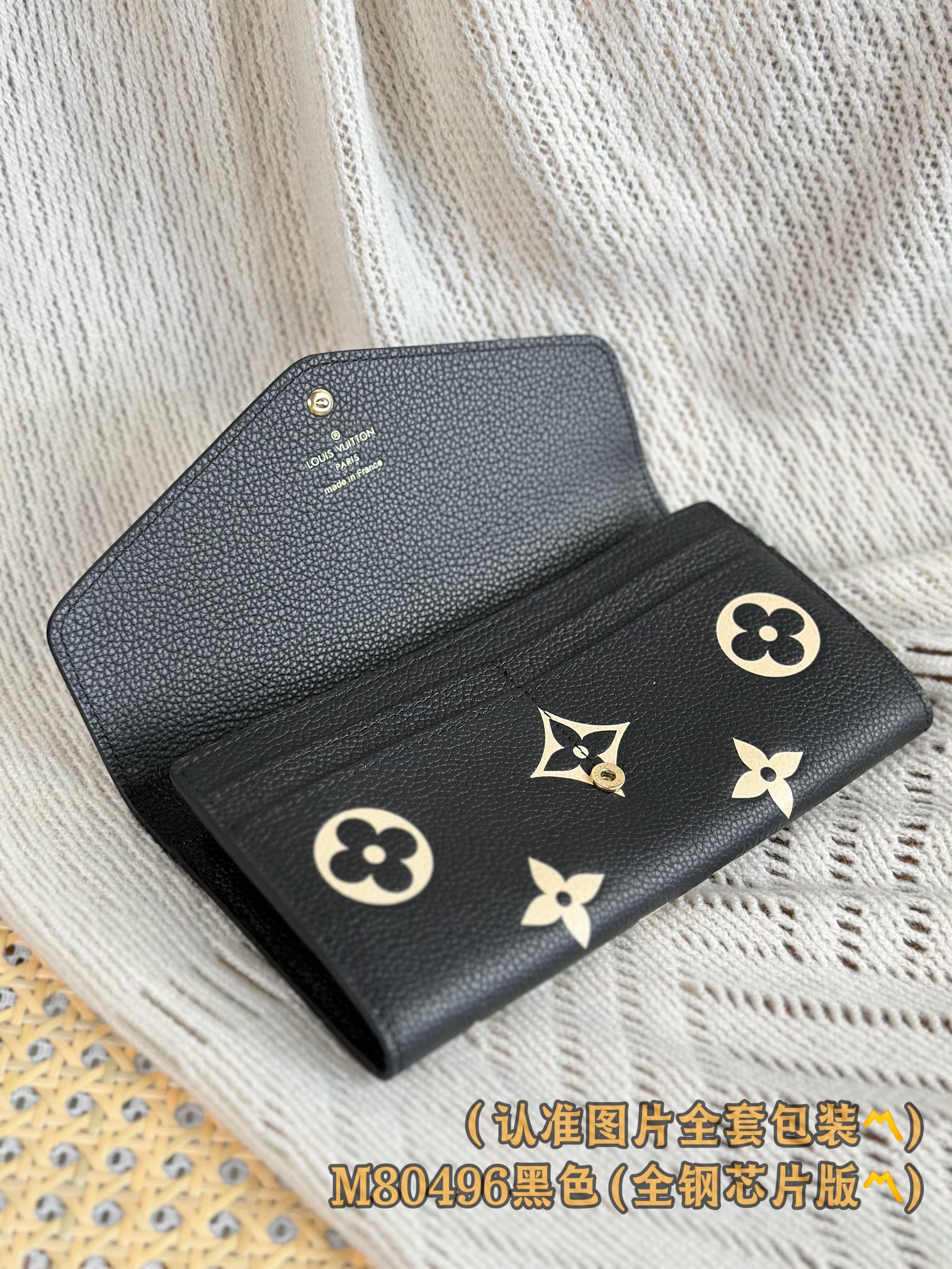 M80496 黑色 (〽️A级全钢〽️)个性化定制版! (全部采用进口牛皮材料制作、皮质手感非常细腻🪡👍) Sarah 錢包、這款路易威登經典的Sarah錢包以雙色調Monogram Empreinte皮革打造優雅外形,綴有標誌性的Monogram壓花圖案。信封式袋蓋設計配以金色按扣穩妥開合,掀開即展露井然有序的內部空間 。這款錢包設有兩個大型隔層和多個口袋,更備有16個信用卡夾層。