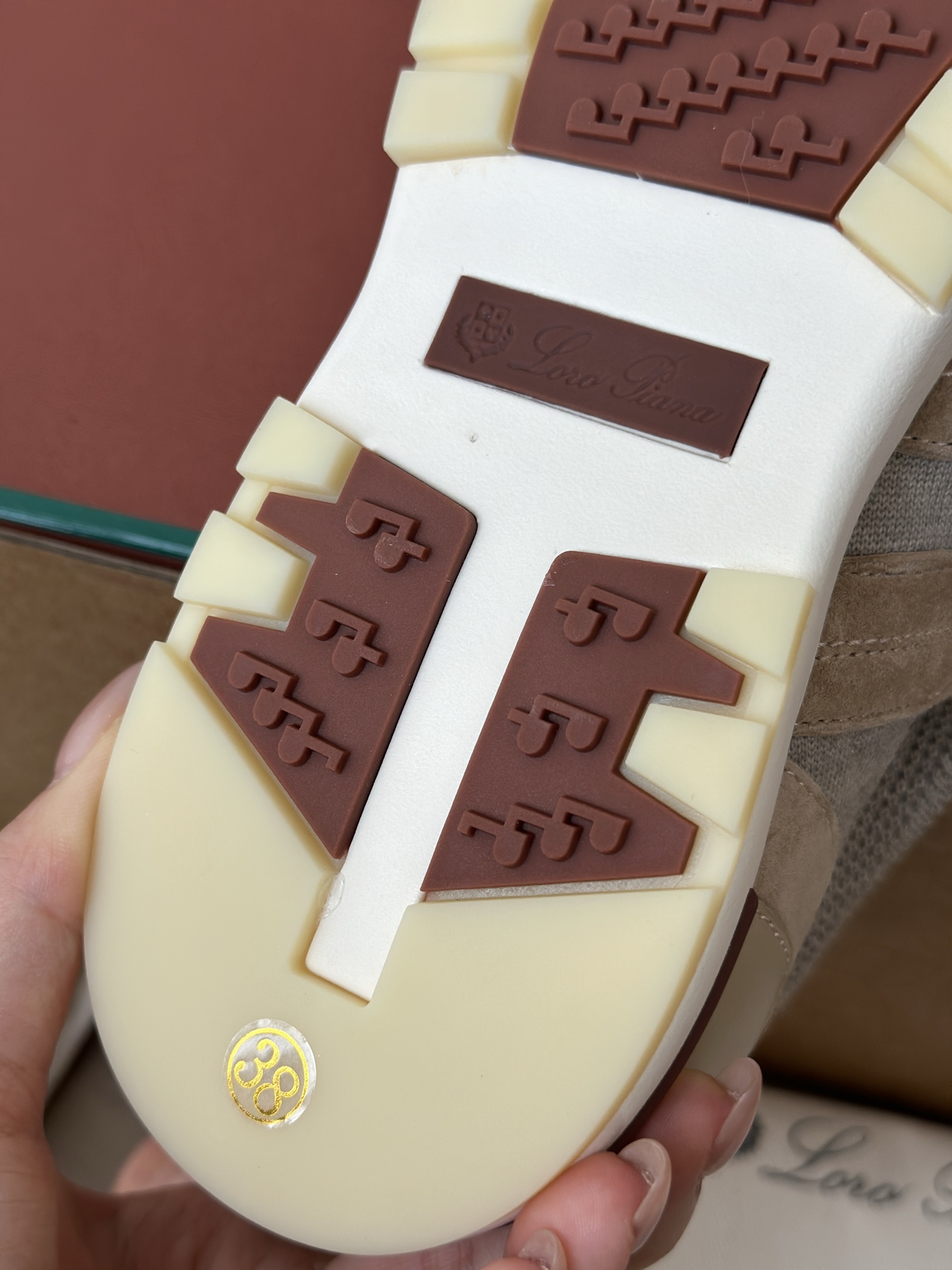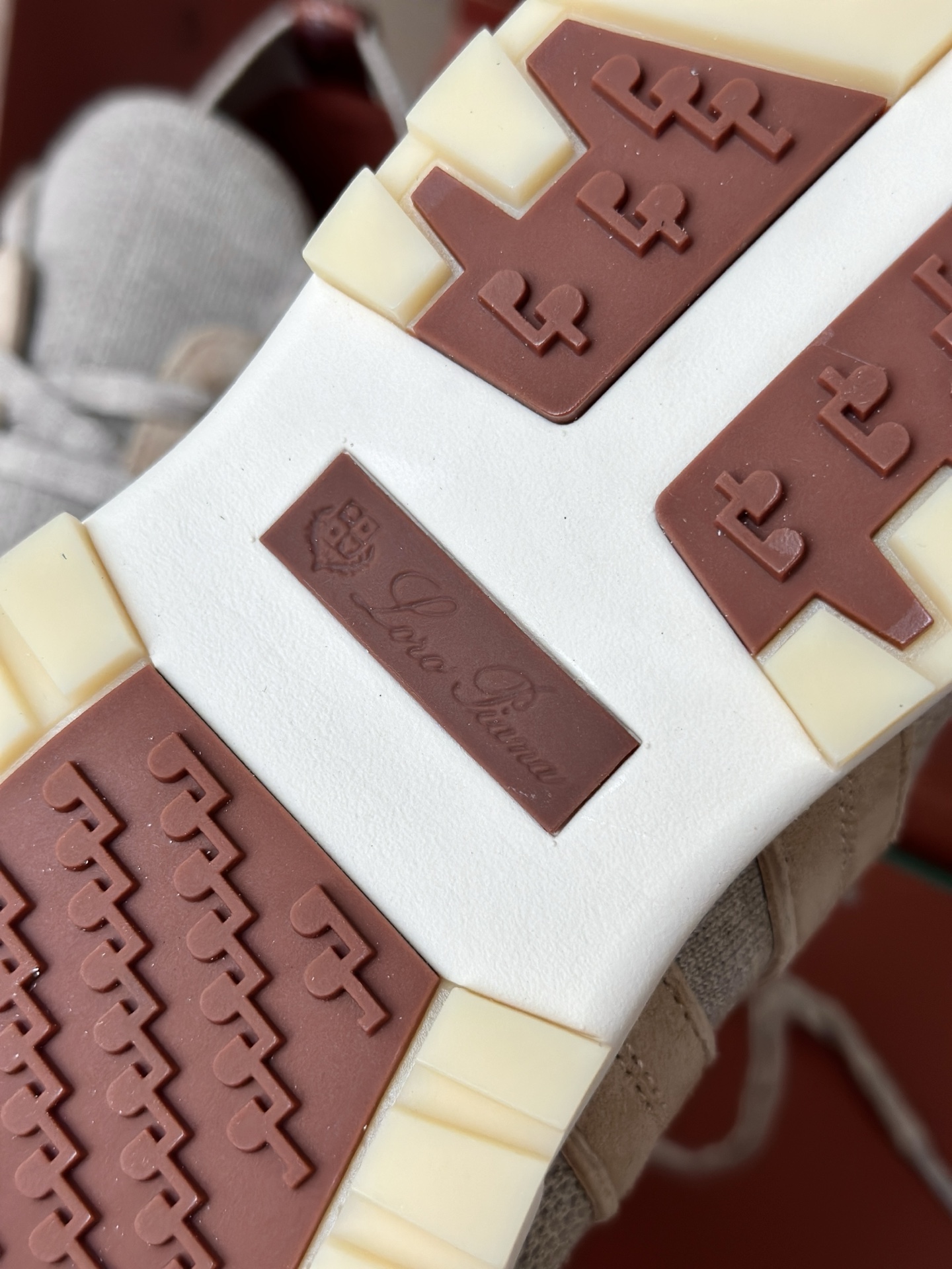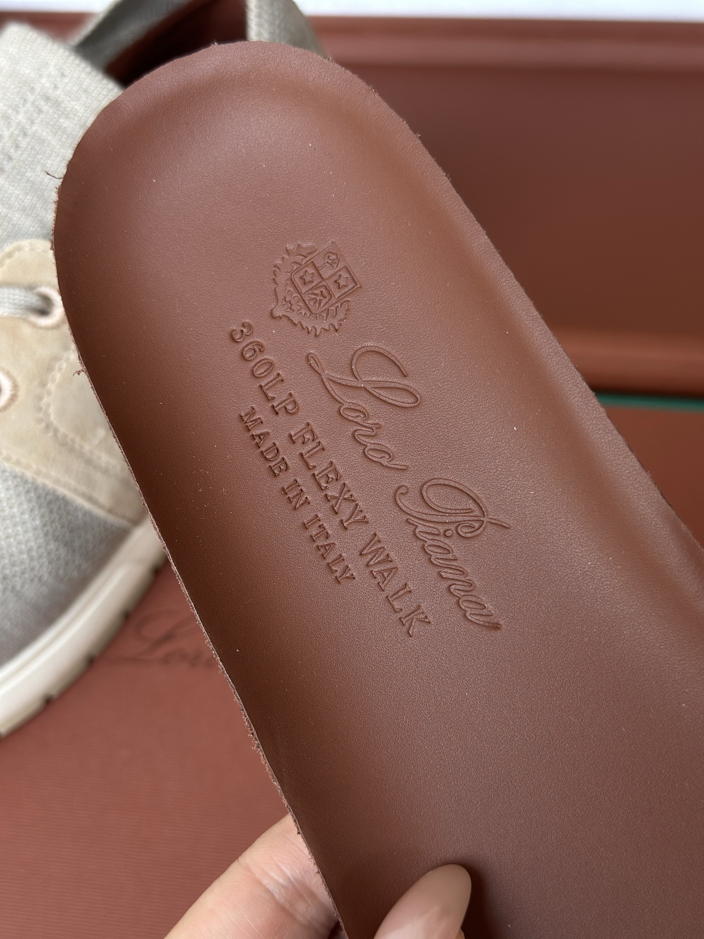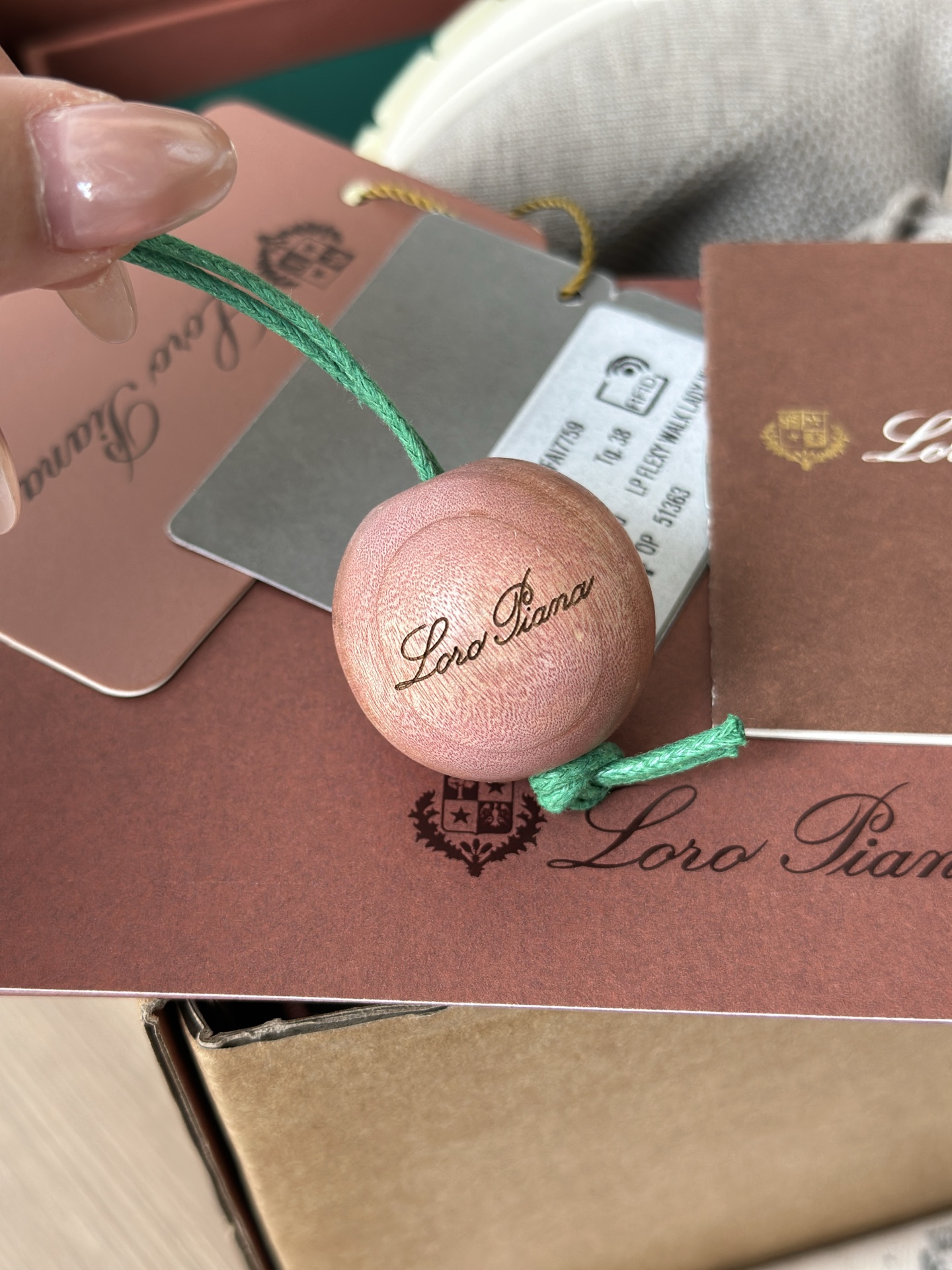 配Kummel 色鞋底,印有Loro Piana首字母缩写重复图案Kummel 色提拉环带有Loro Piana 标识