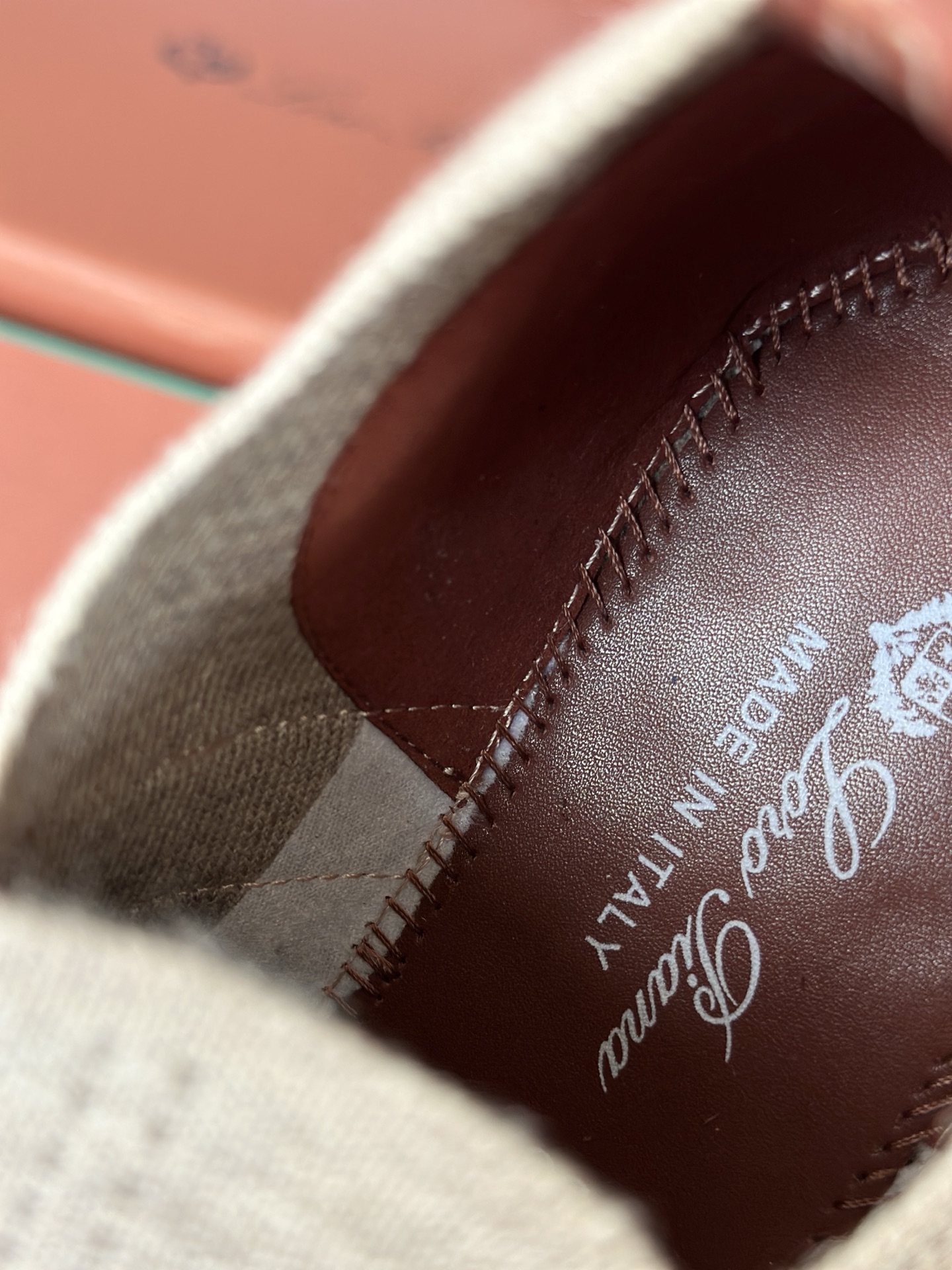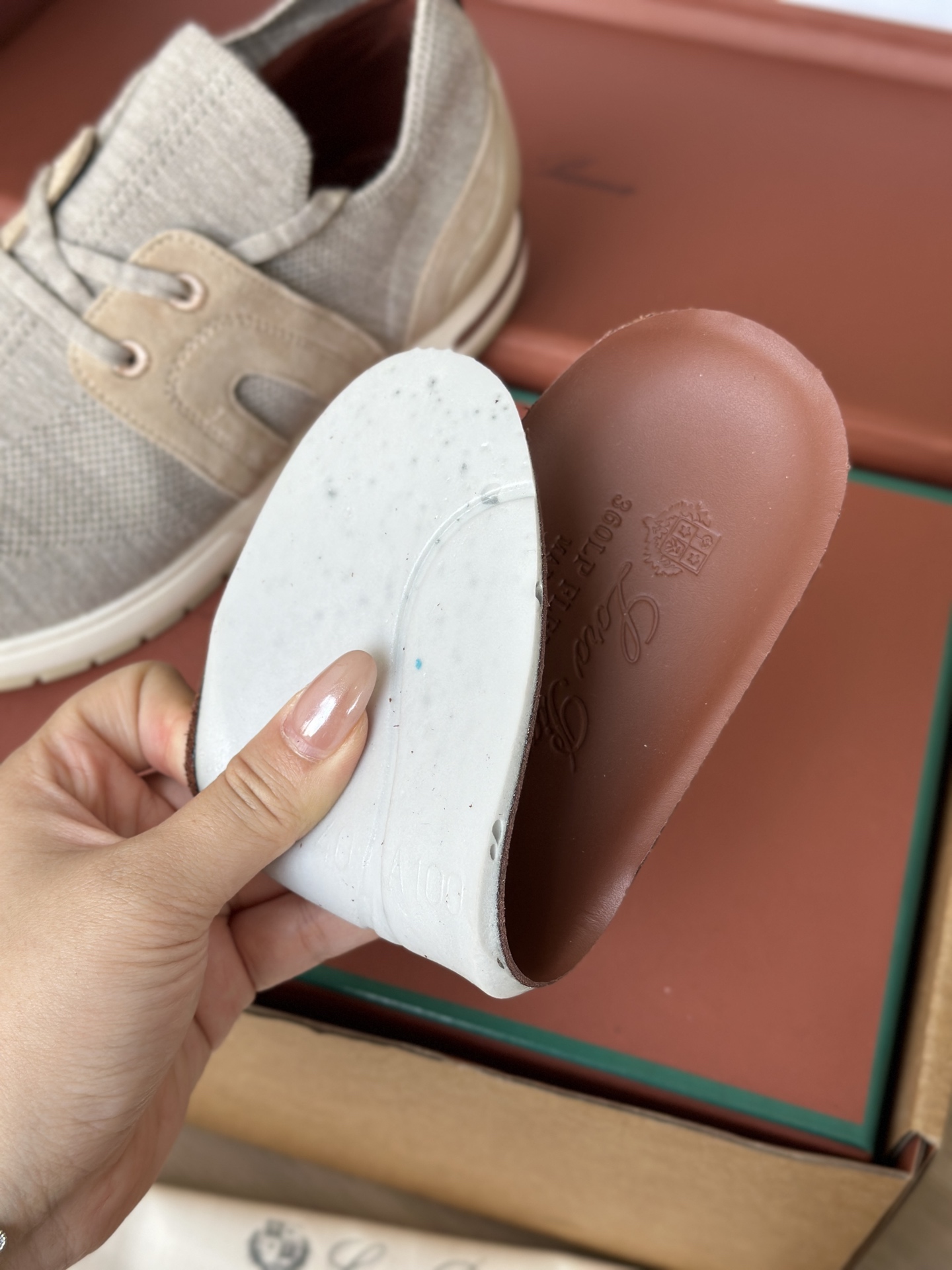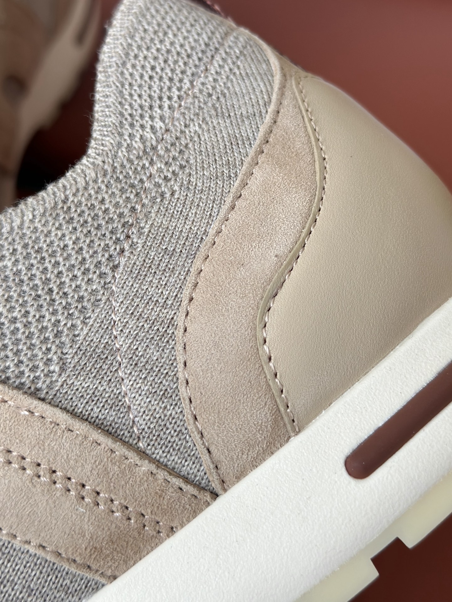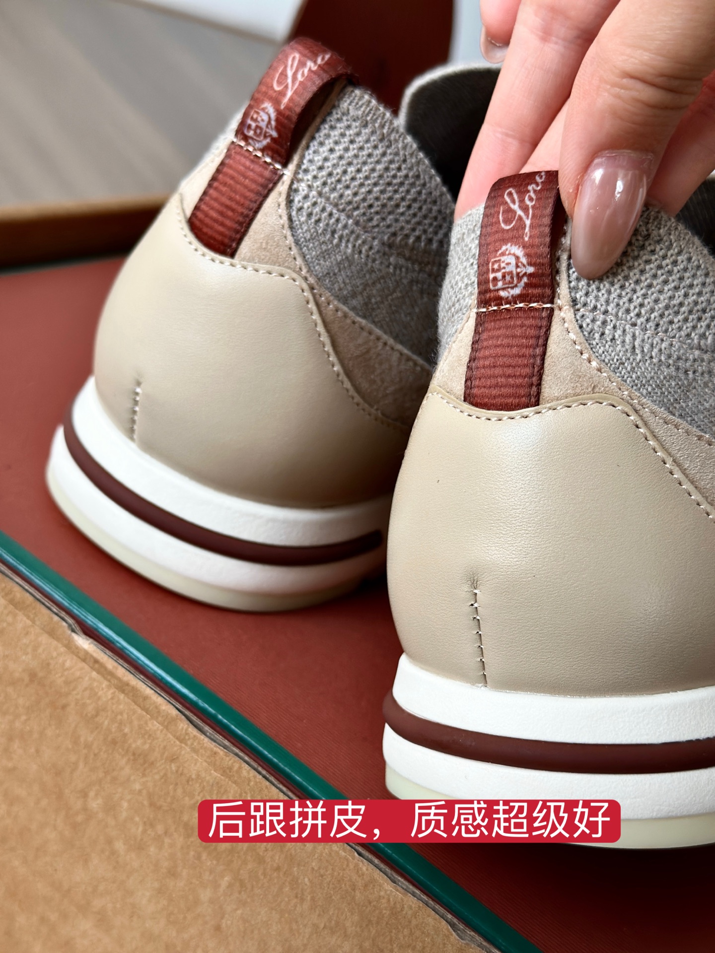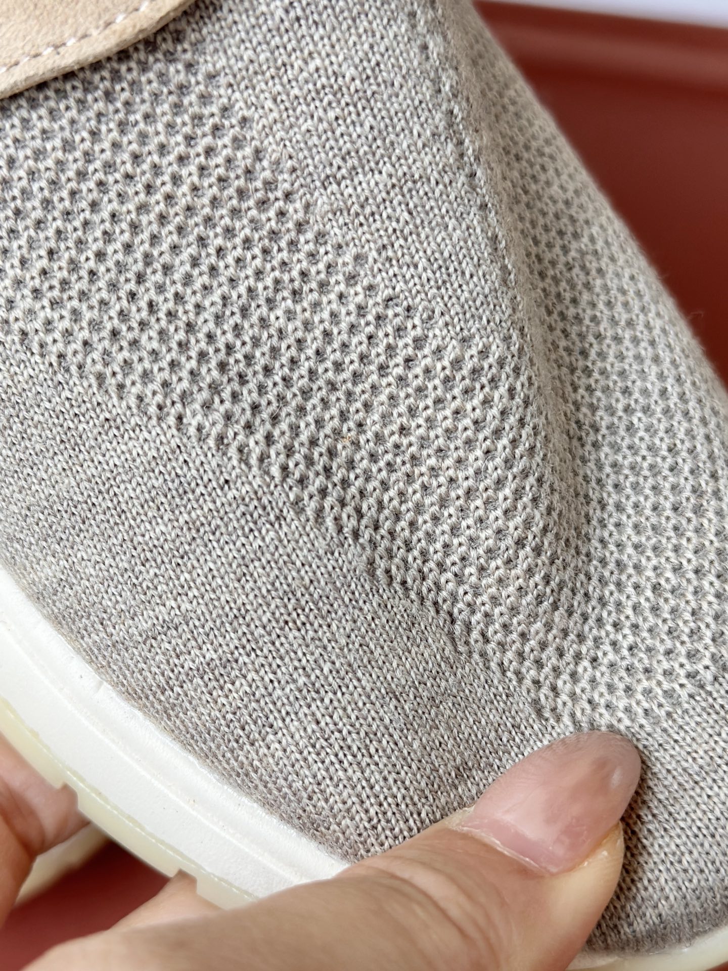 🔸鞋面像毛衣一样在织布机上制成,随后配以轻便鞋底。罗纹松紧带鞋口搭配 Kummel 色饰边 白色鞋外底,配Kummel 色鞋底,印有Loro Piana首字母缩写重复图案Kummel 色提拉环带有Loro Piana 标识