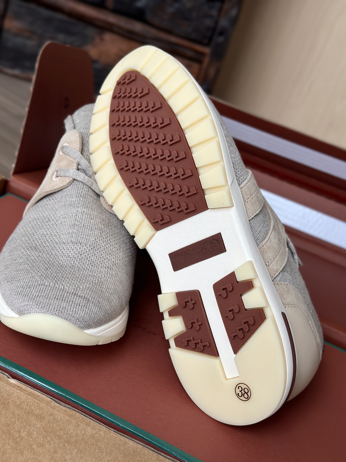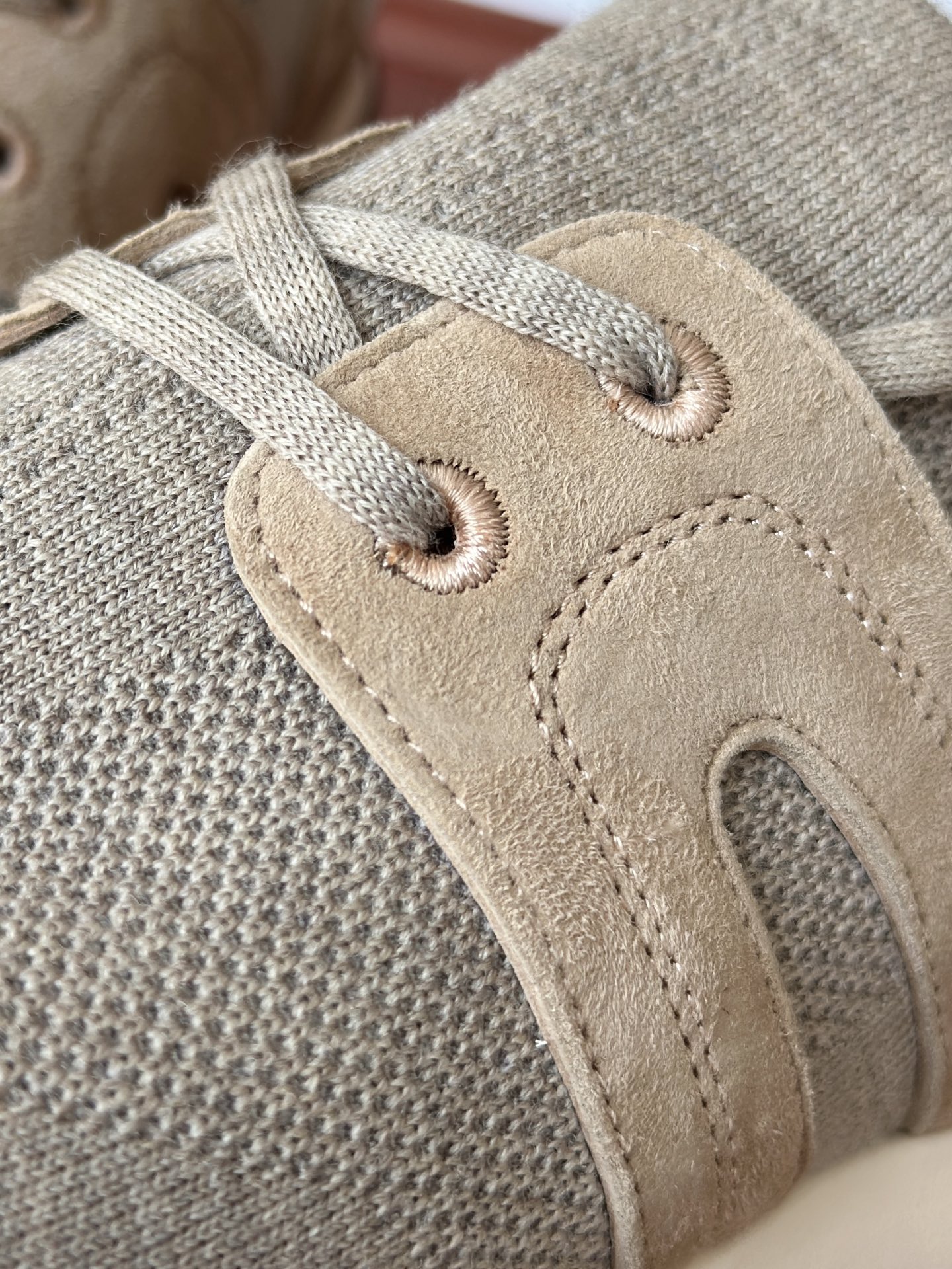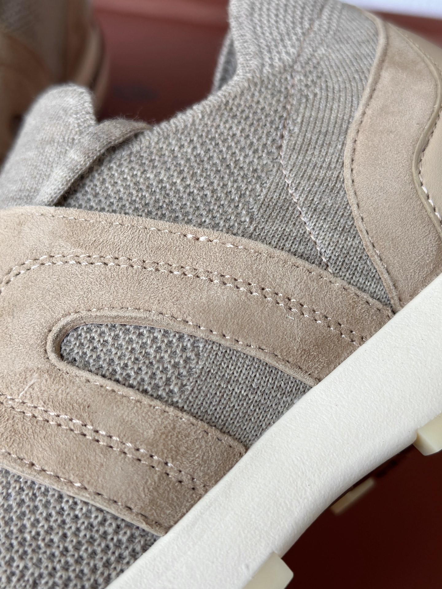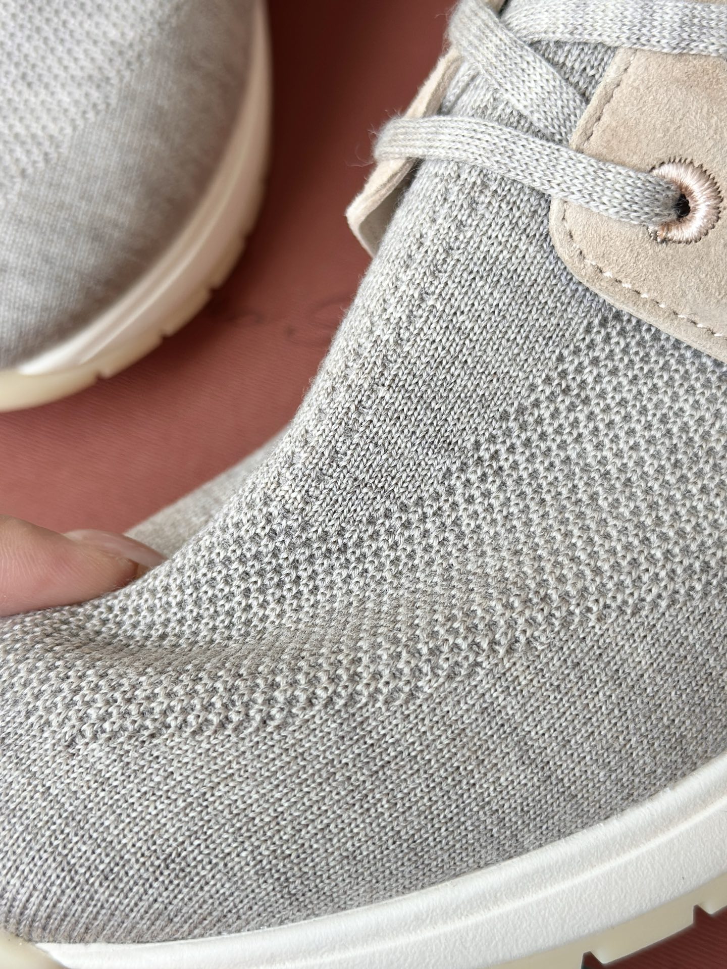 🔸鞋面像毛衣一样在织布机上制成,随后配以轻便鞋底。罗纹松紧带鞋口搭配 Kummel 色饰边 白色鞋外底,配Kummel 色鞋底,印有Loro Piana首字母缩写重复图案Kummel 色提拉环带有Loro Piana 标识