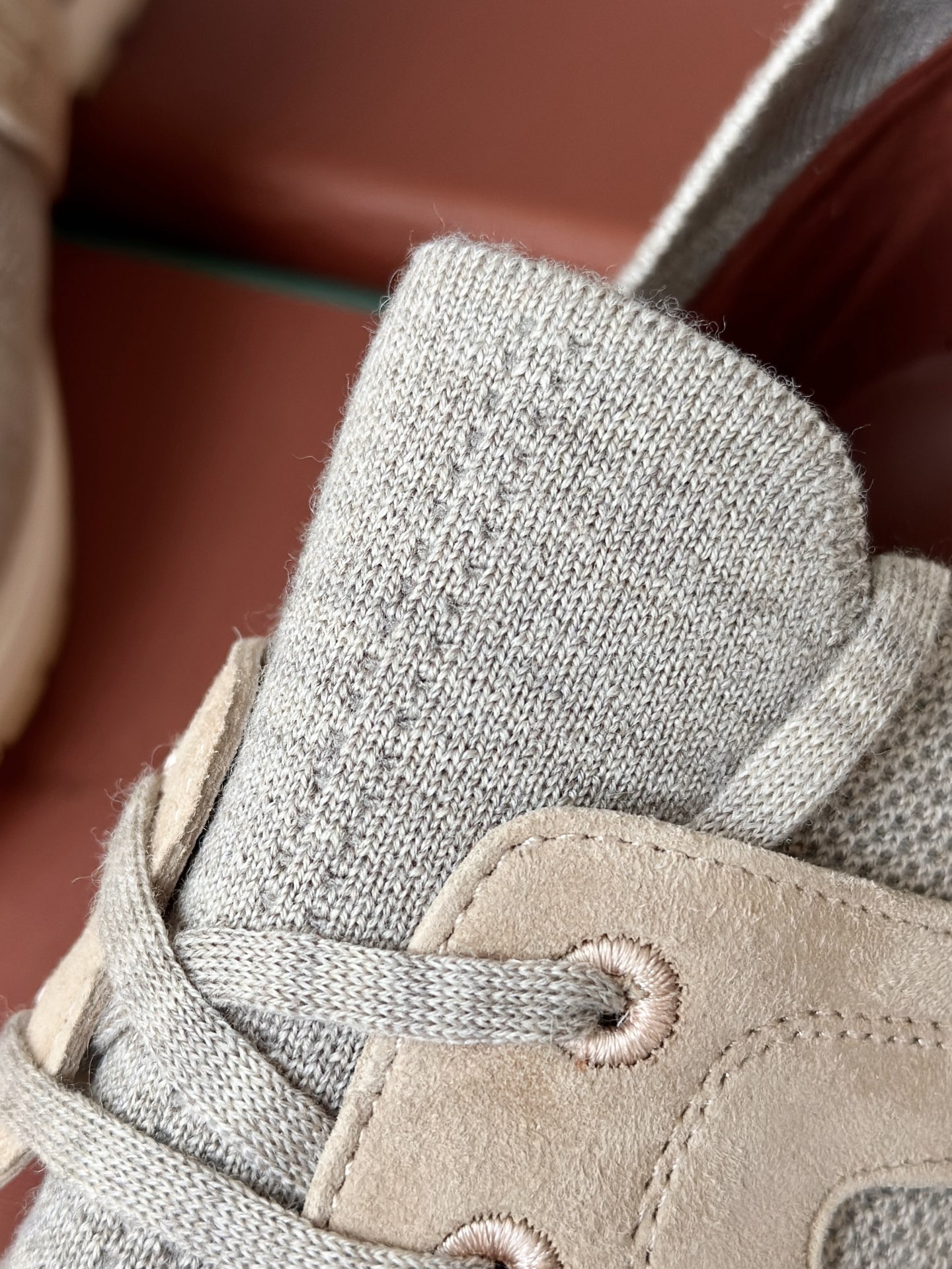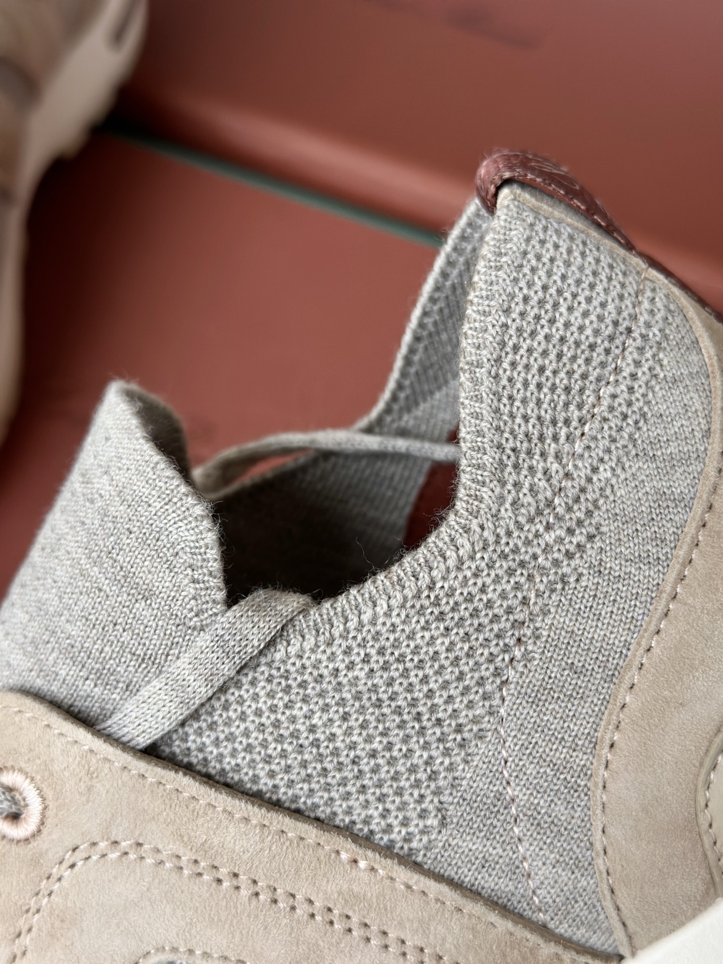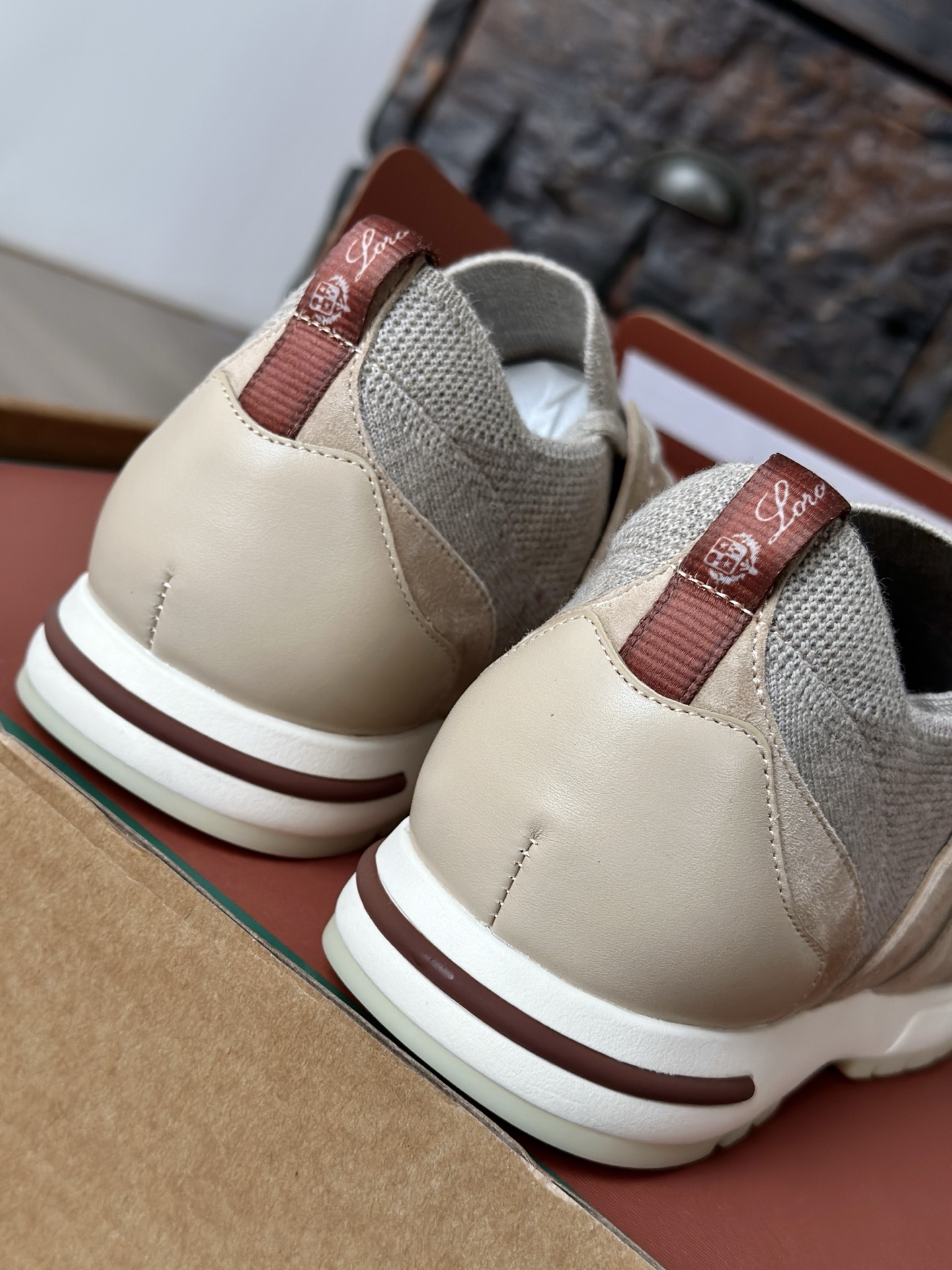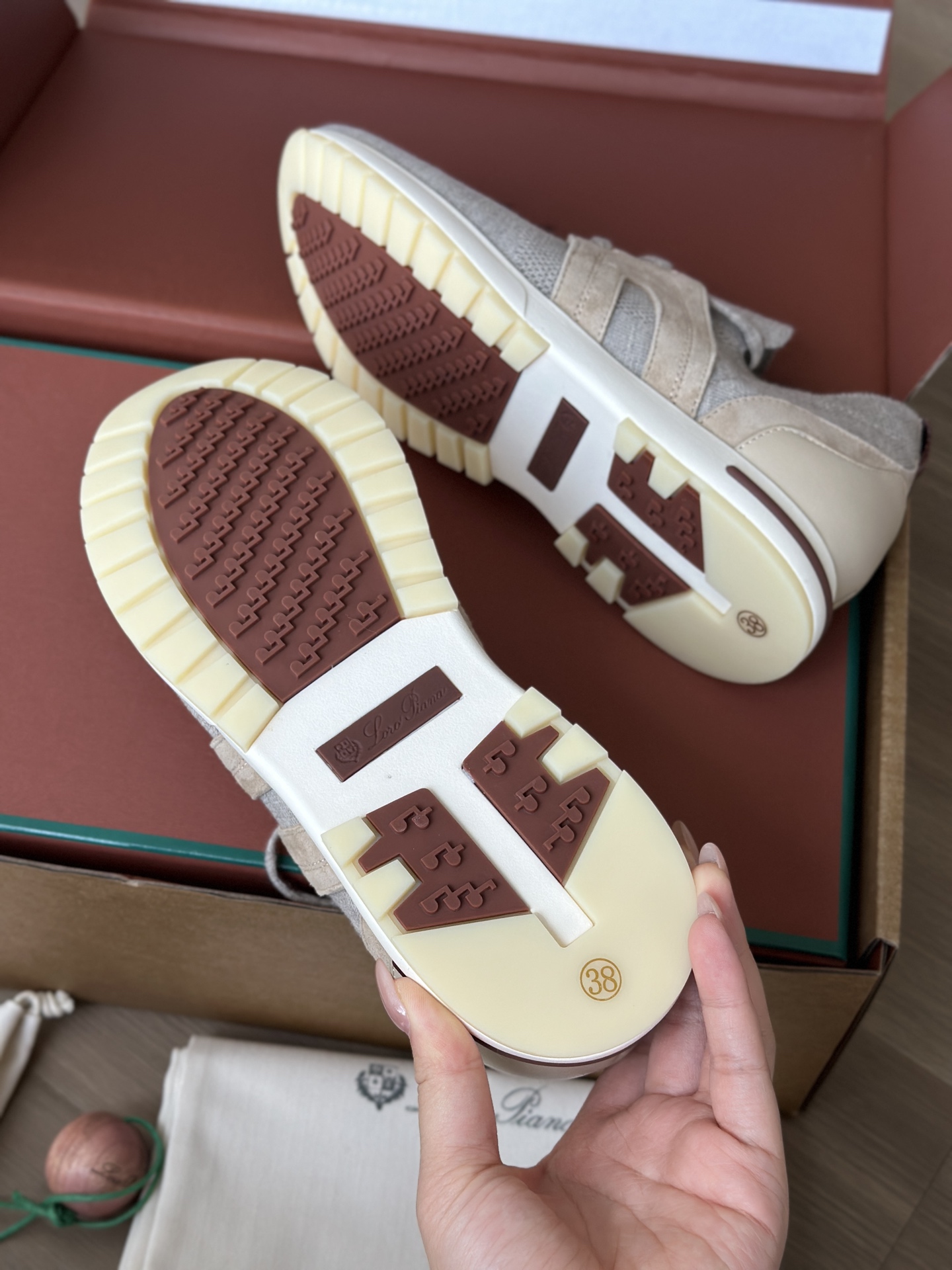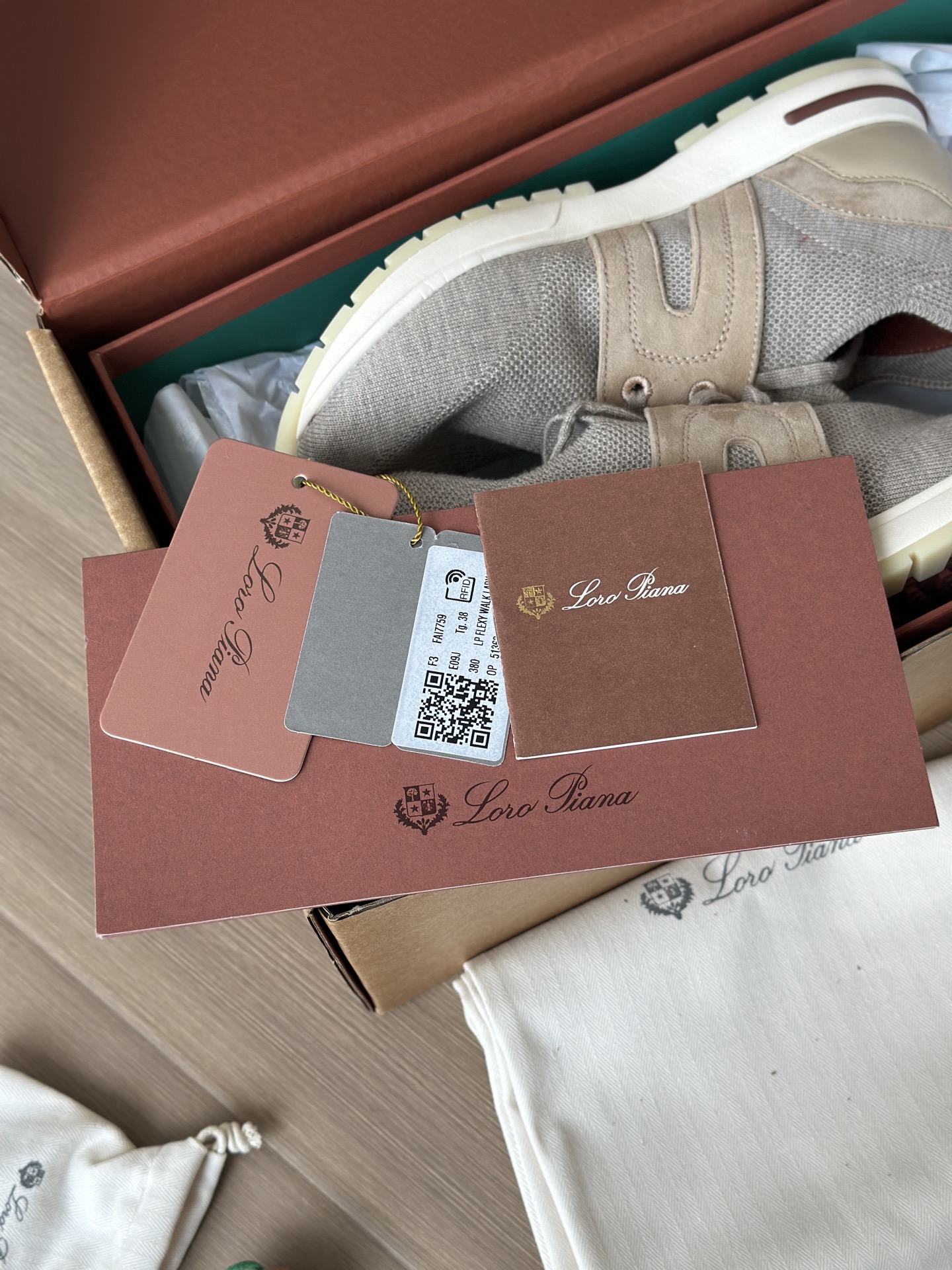 🔸鞋面像毛衣一样在织布机上制成,随后配以轻便鞋底。罗纹松紧带鞋口搭配 Kummel 色饰边 白色鞋外底,配Kummel 色鞋底,印有Loro Piana首字母缩写重复图案Kummel 色提拉环带有Loro Piana 标识