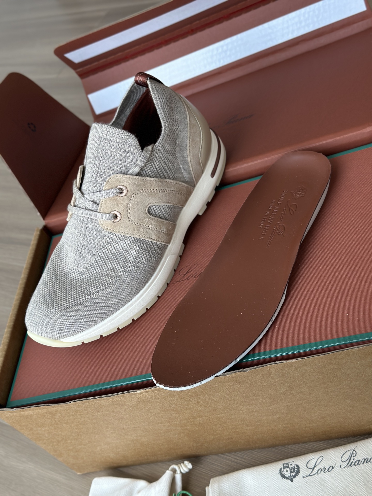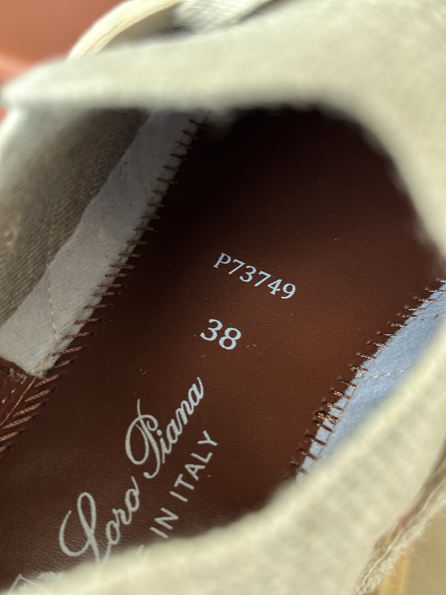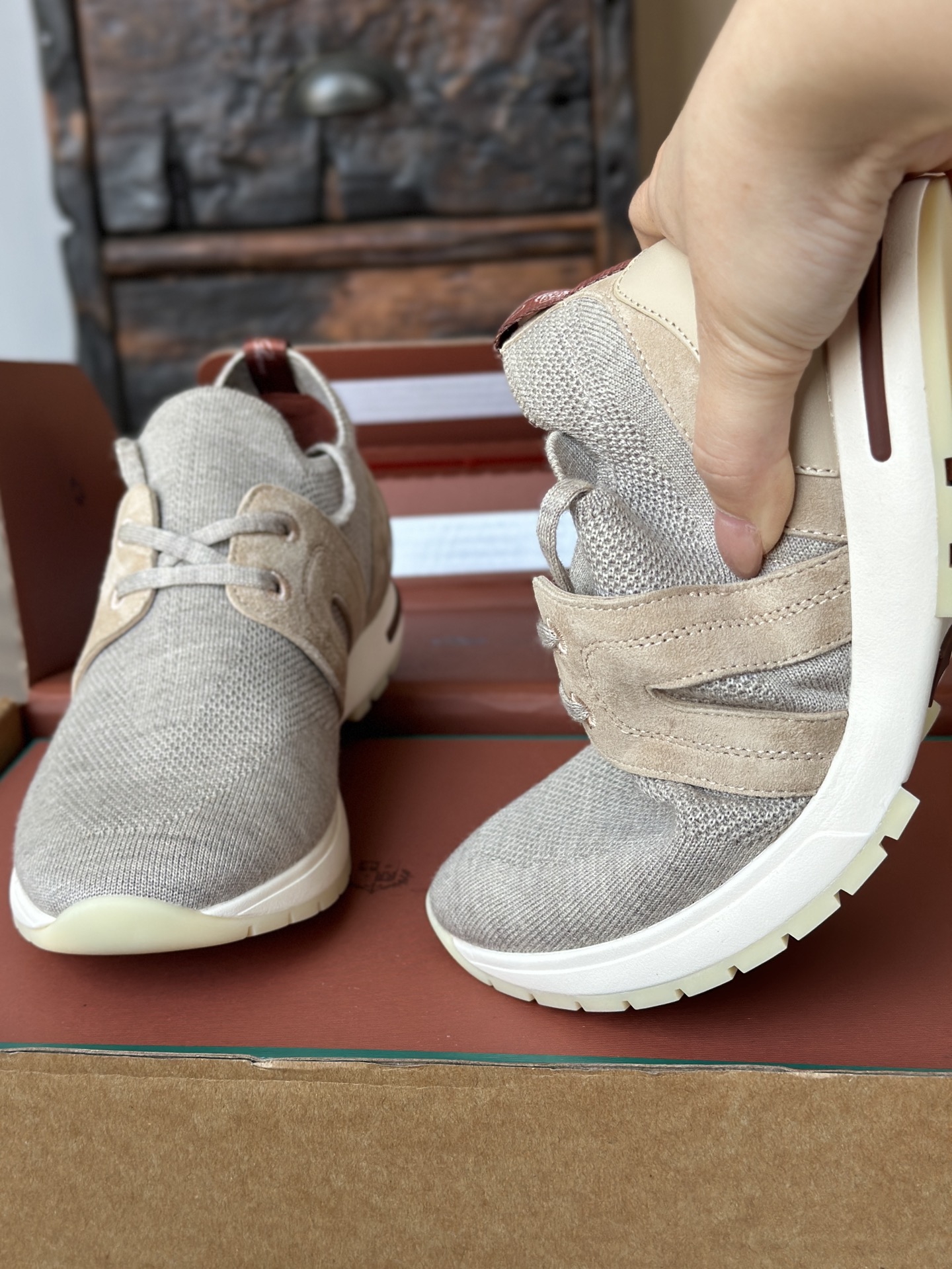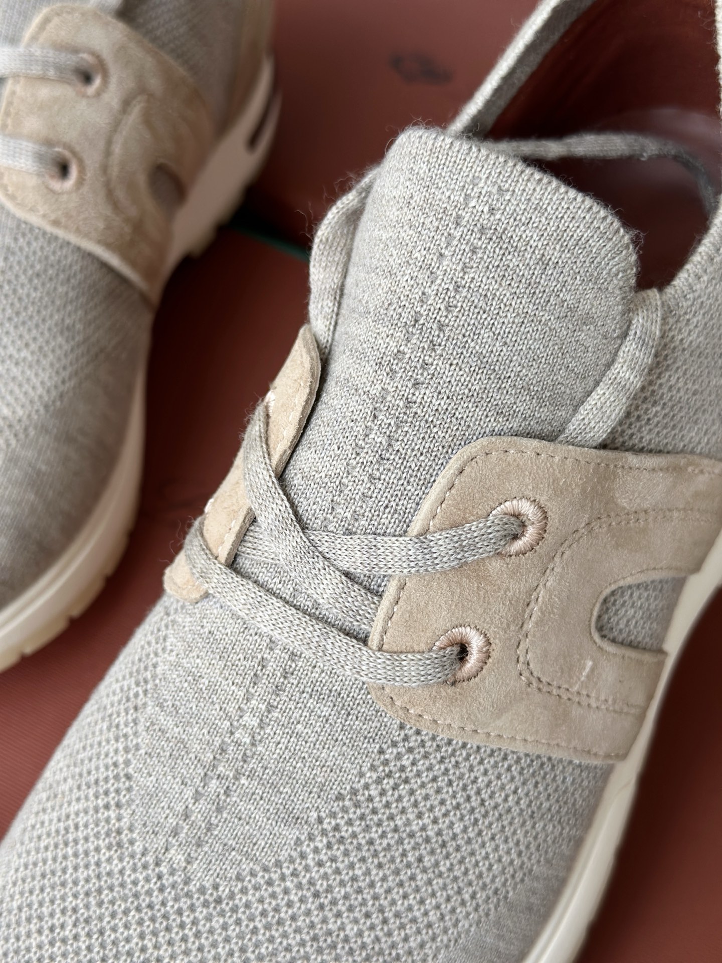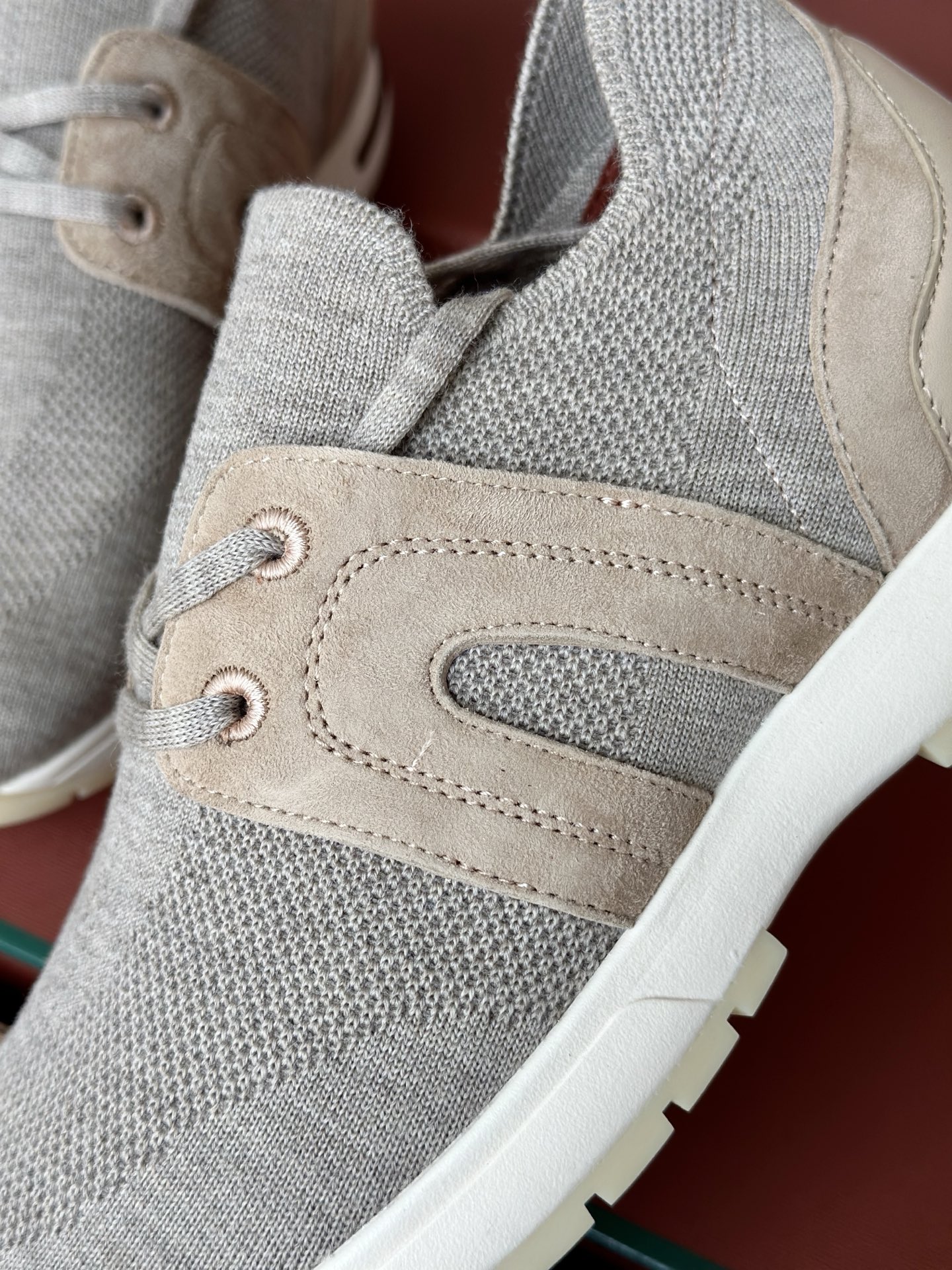 🔸鞋面像毛衣一样在织布机上制成,随后配以轻便鞋底。罗纹松紧带鞋口搭配 Kummel 色饰边 白色鞋外底,配Kummel 色鞋底,印有Loro Piana首字母缩写重复图案Kummel 色提拉环带有Loro Piana 标识