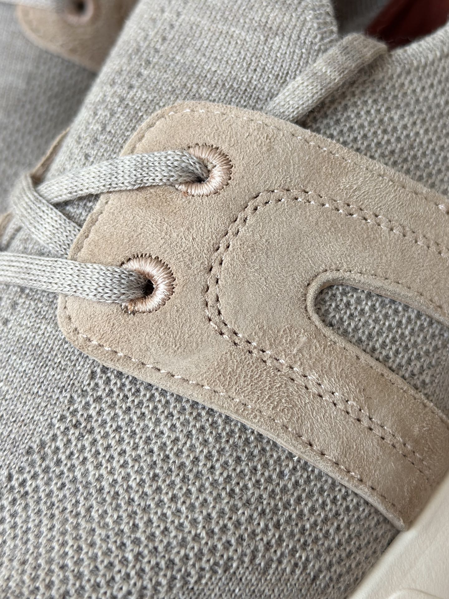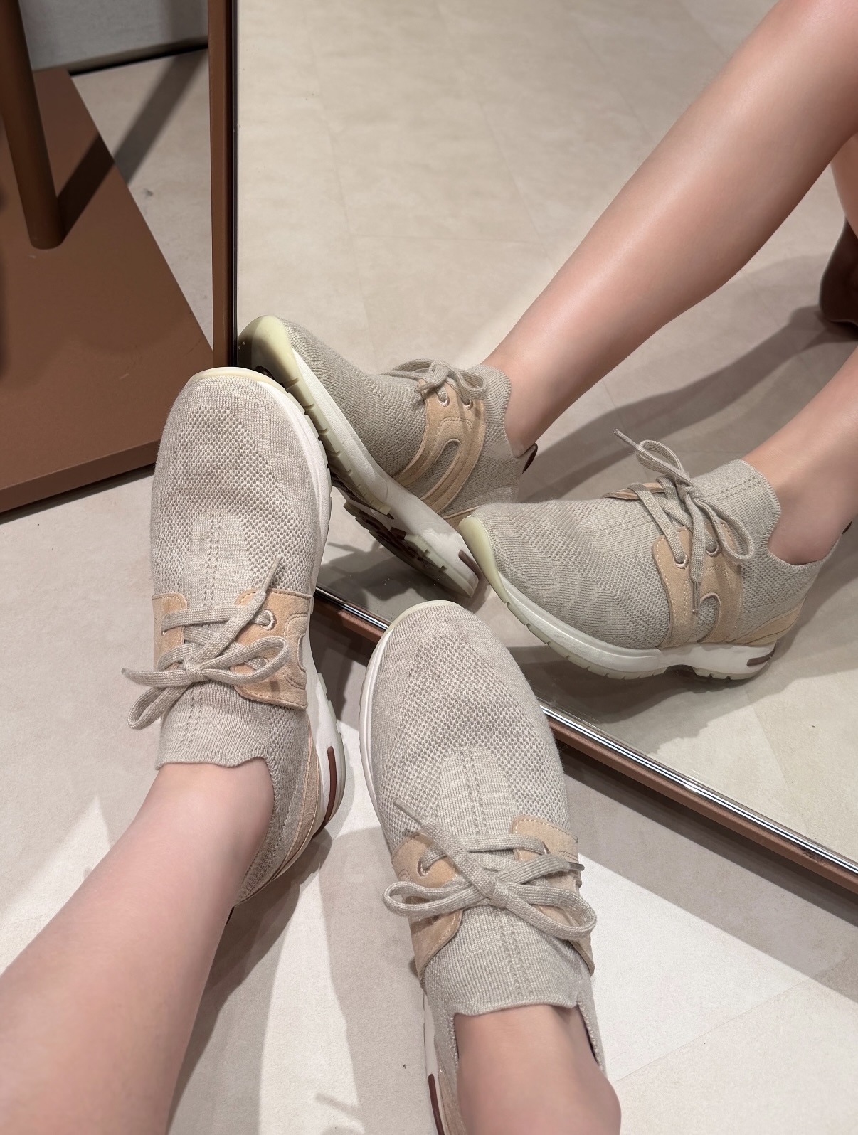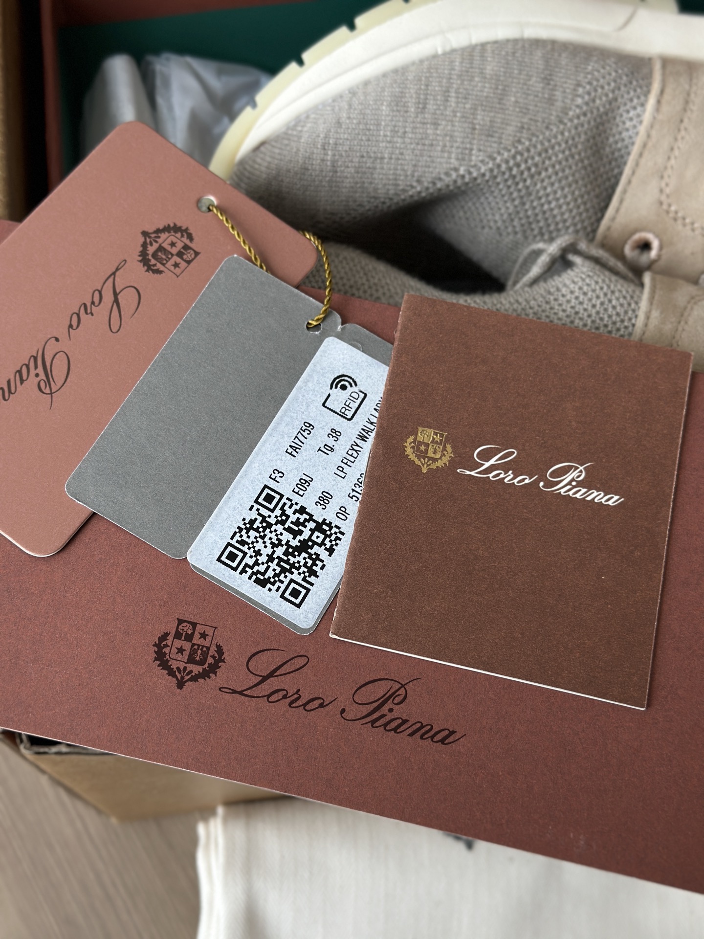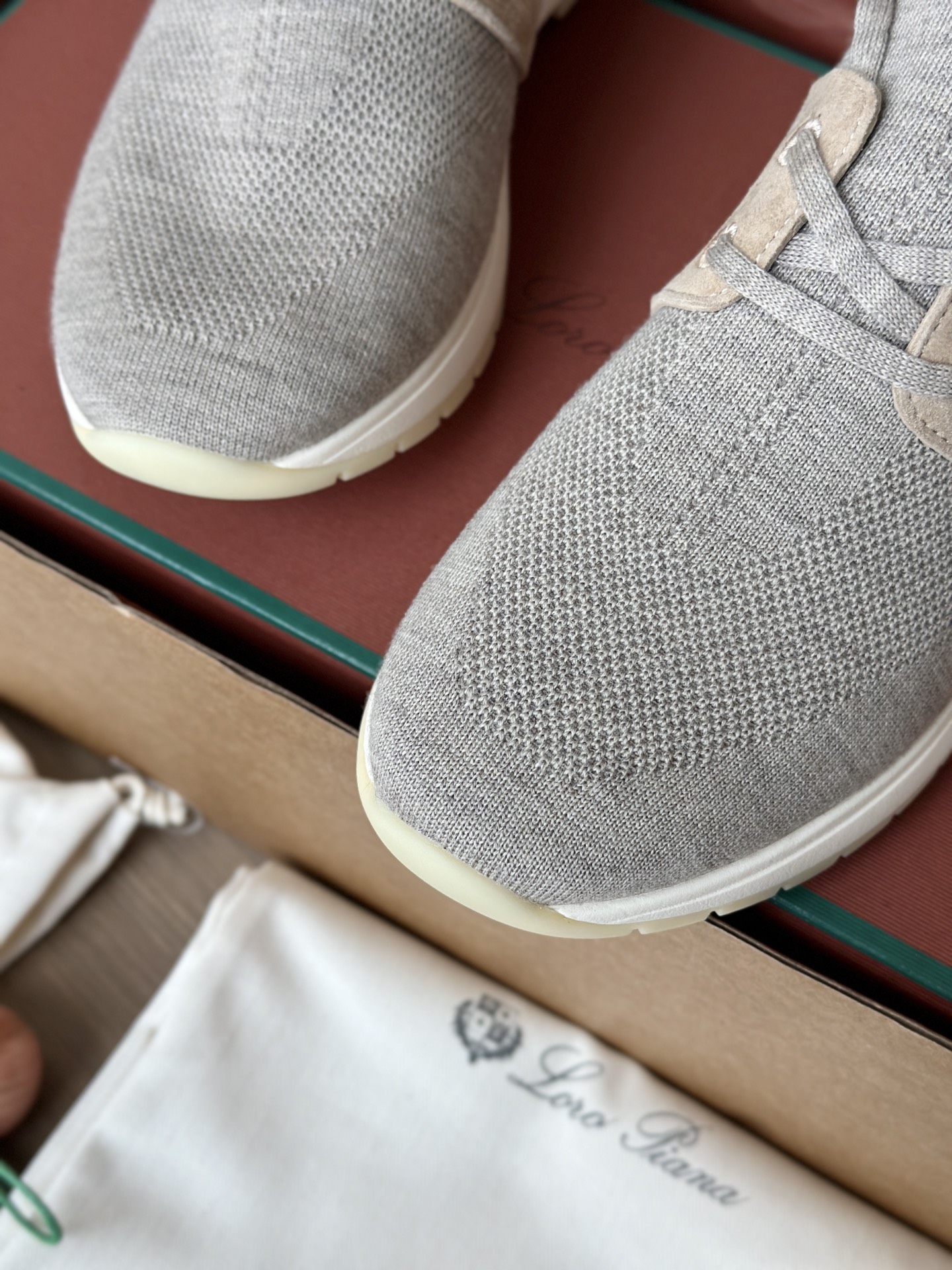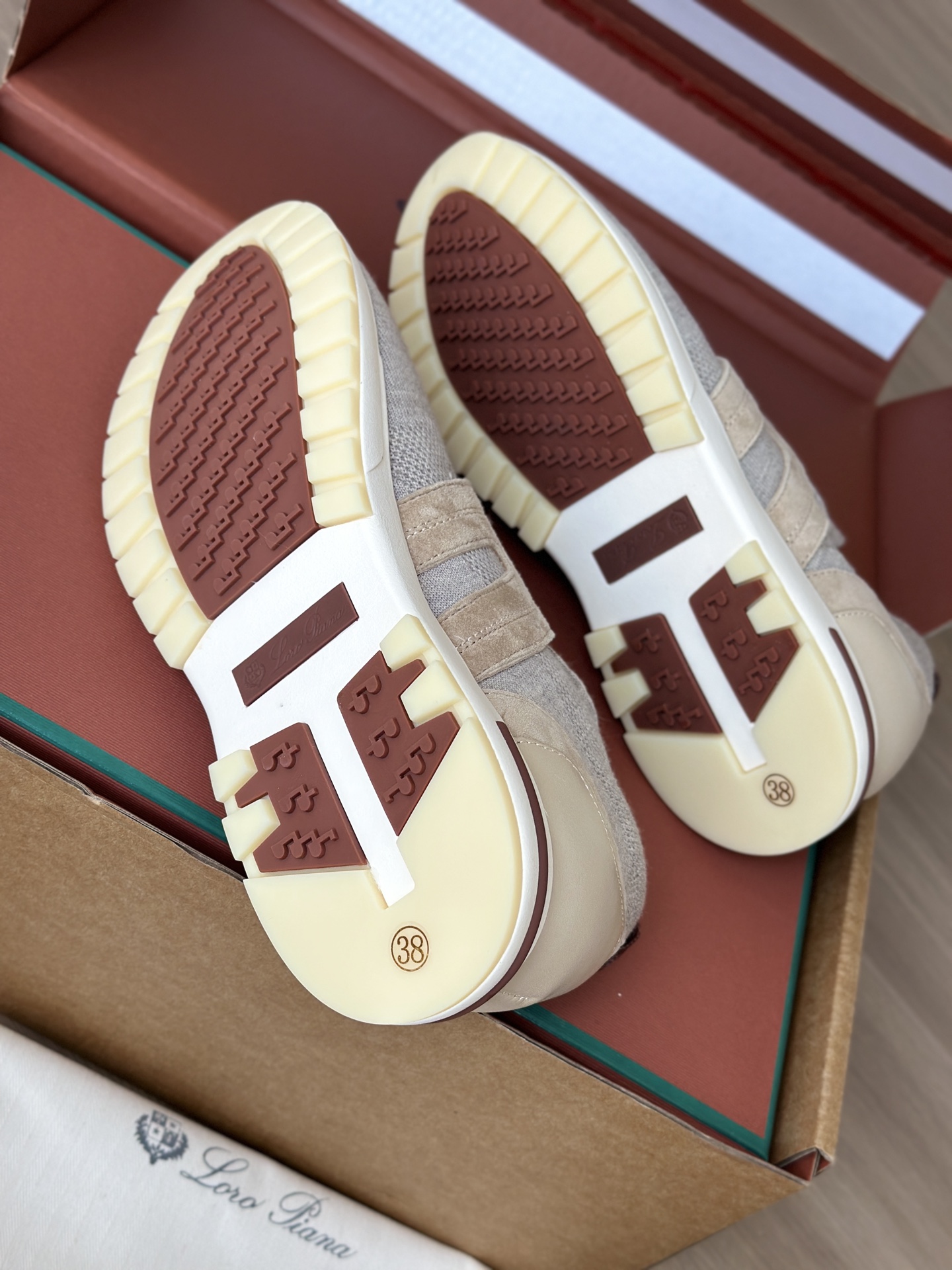 🔸鞋面像毛衣一样在织布机上制成,随后配以轻便鞋底。罗纹松紧带鞋口搭配 Kummel 色饰边 白色鞋外底,配Kummel 色鞋底,印有Loro Piana首字母缩写重复图案Kummel 色提拉环带有Loro Piana 标识