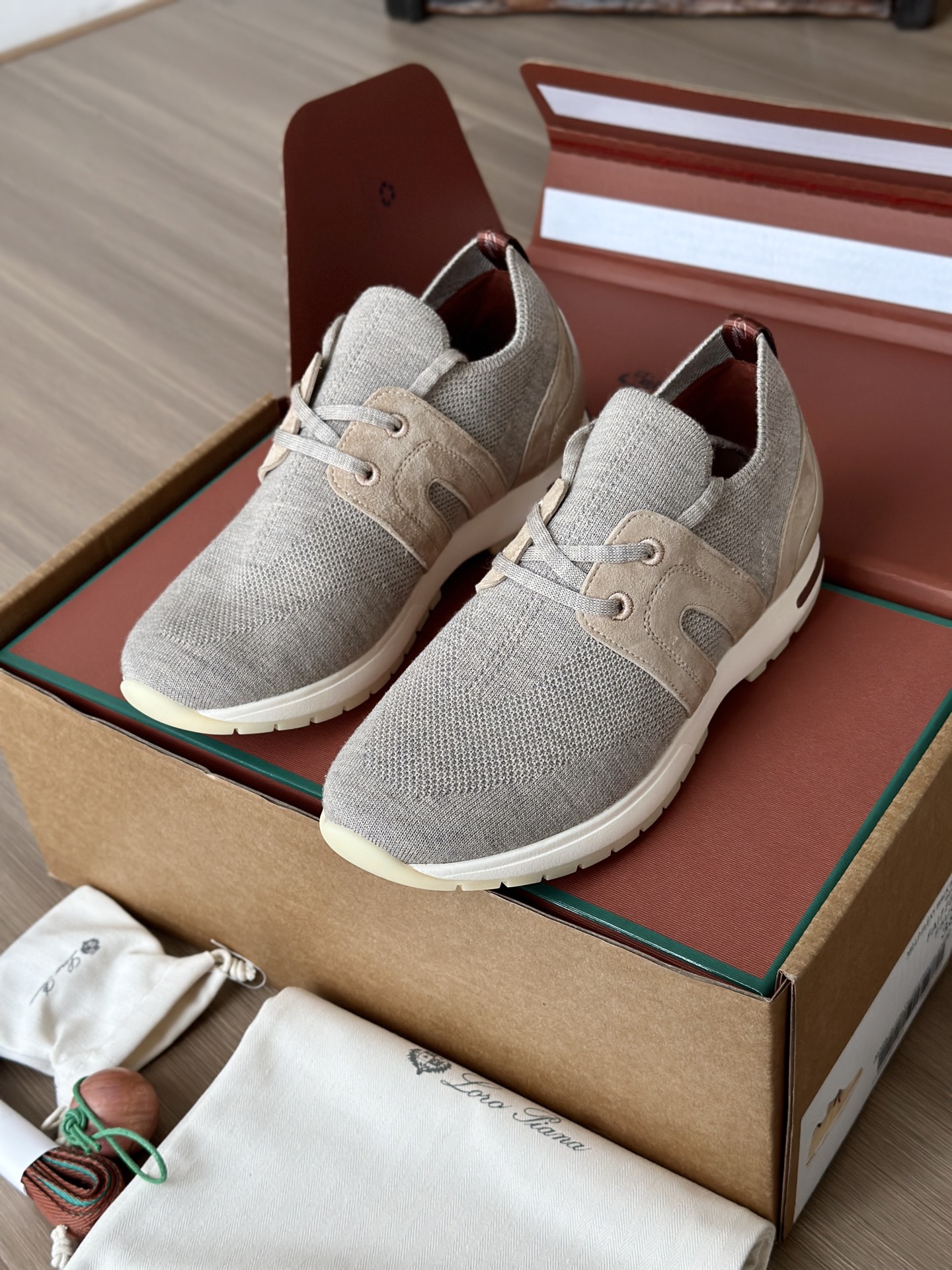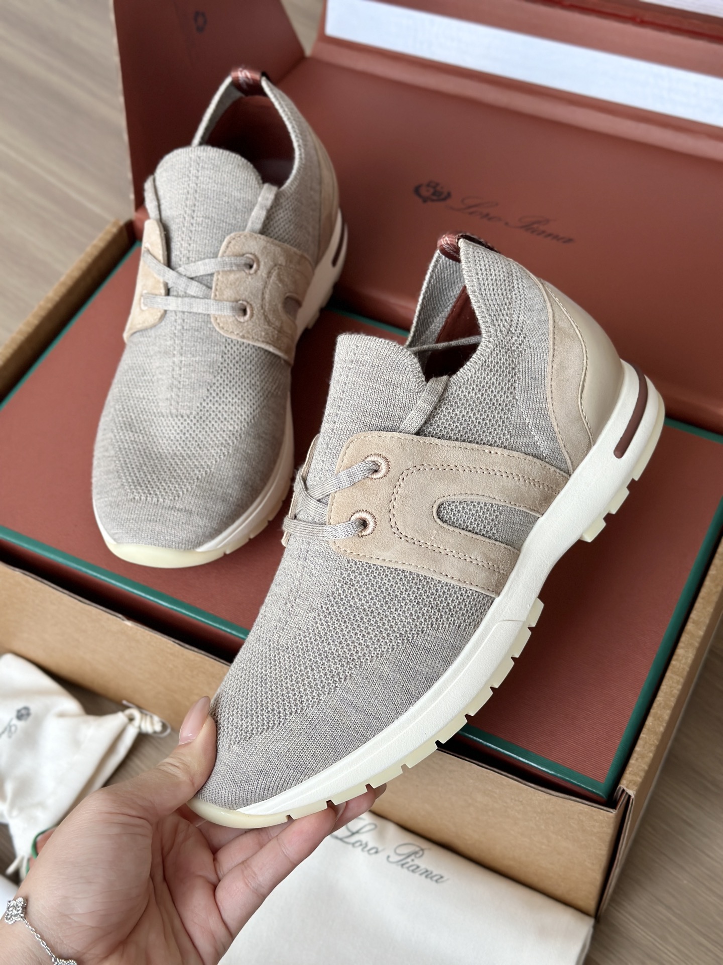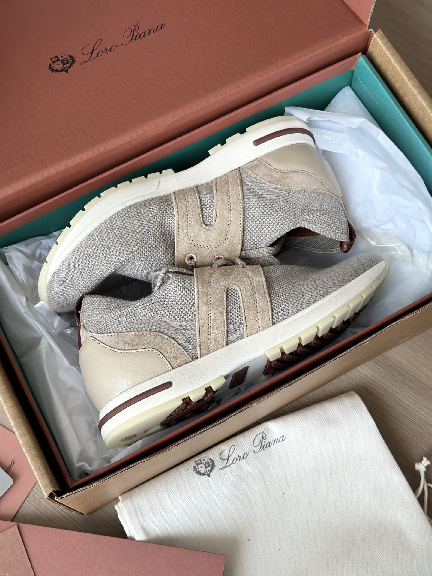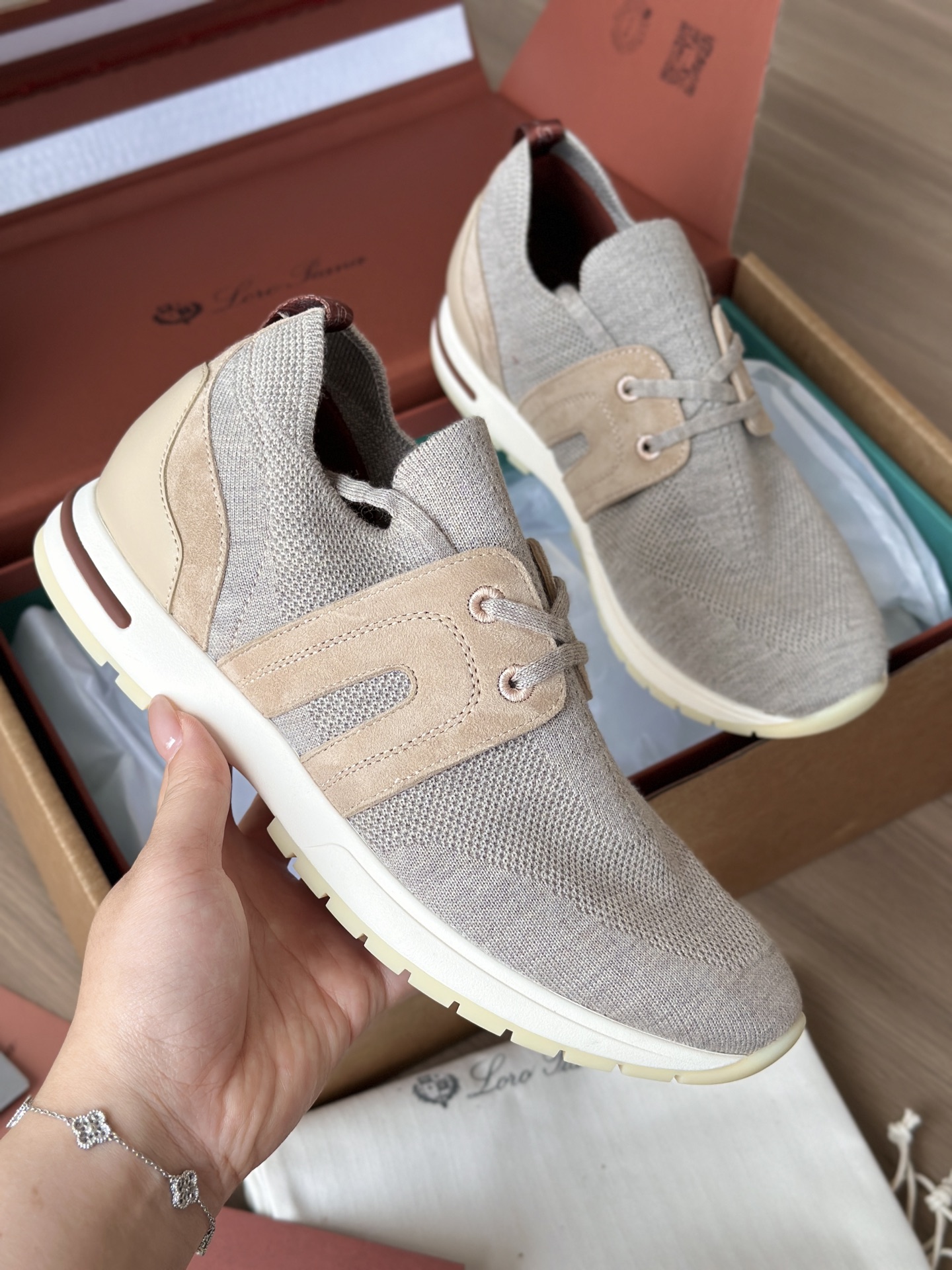 🔸鞋面像毛衣一样在织布机上制成,随后配以轻便鞋底。罗纹松紧带鞋口搭配 Kummel 色饰边 白色鞋外底,配Kummel 色鞋底,印有Loro Piana首字母缩写重复图案Kummel 色提拉环带有Loro Piana 标识