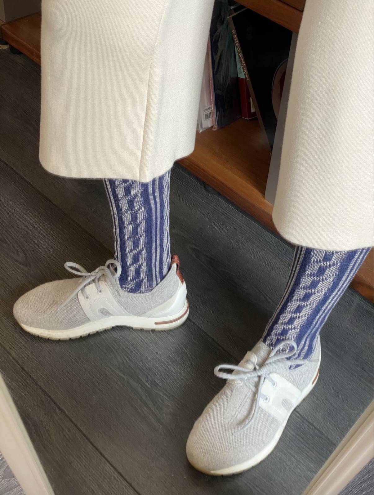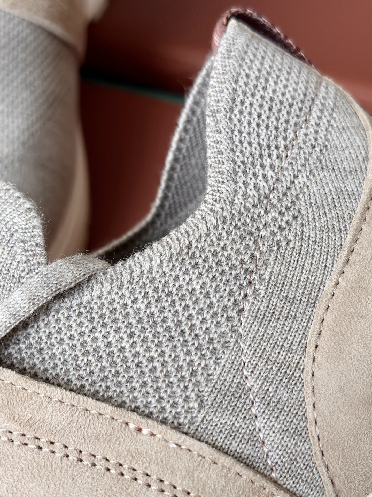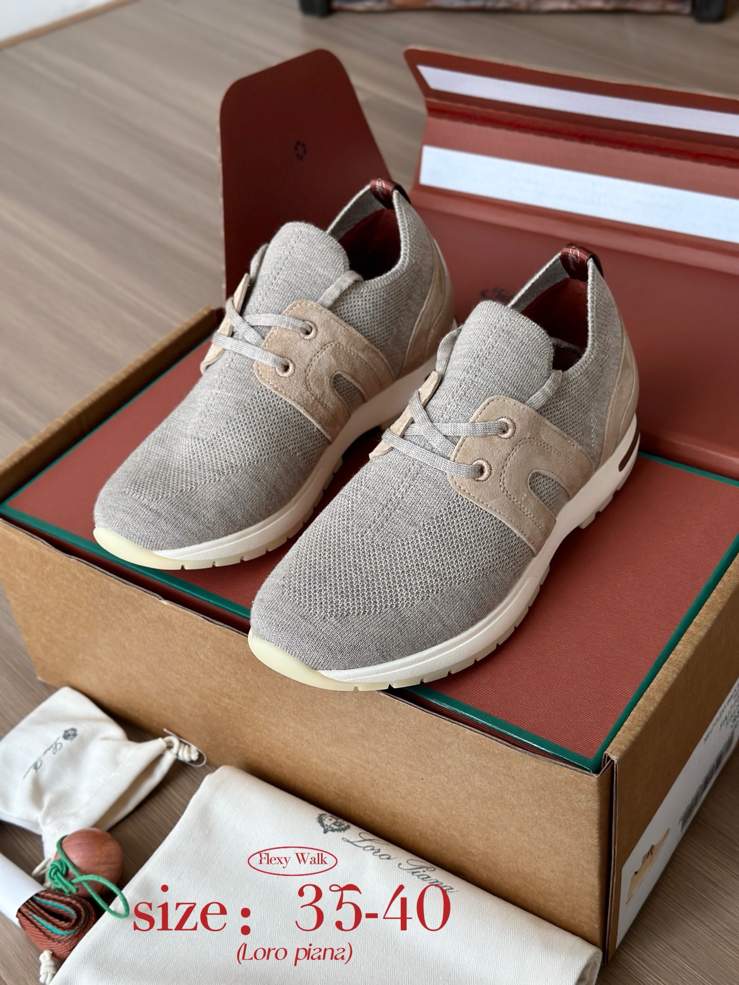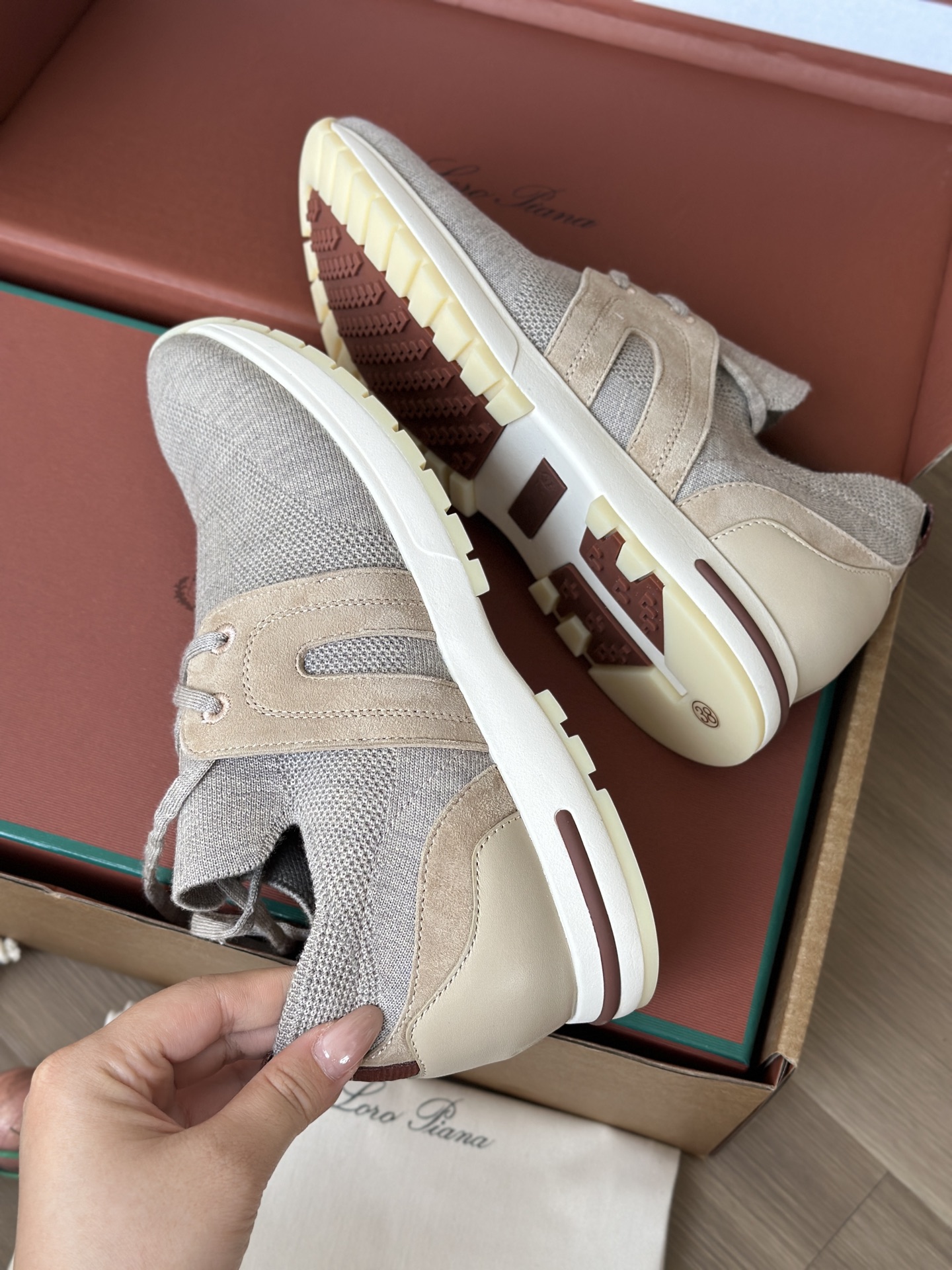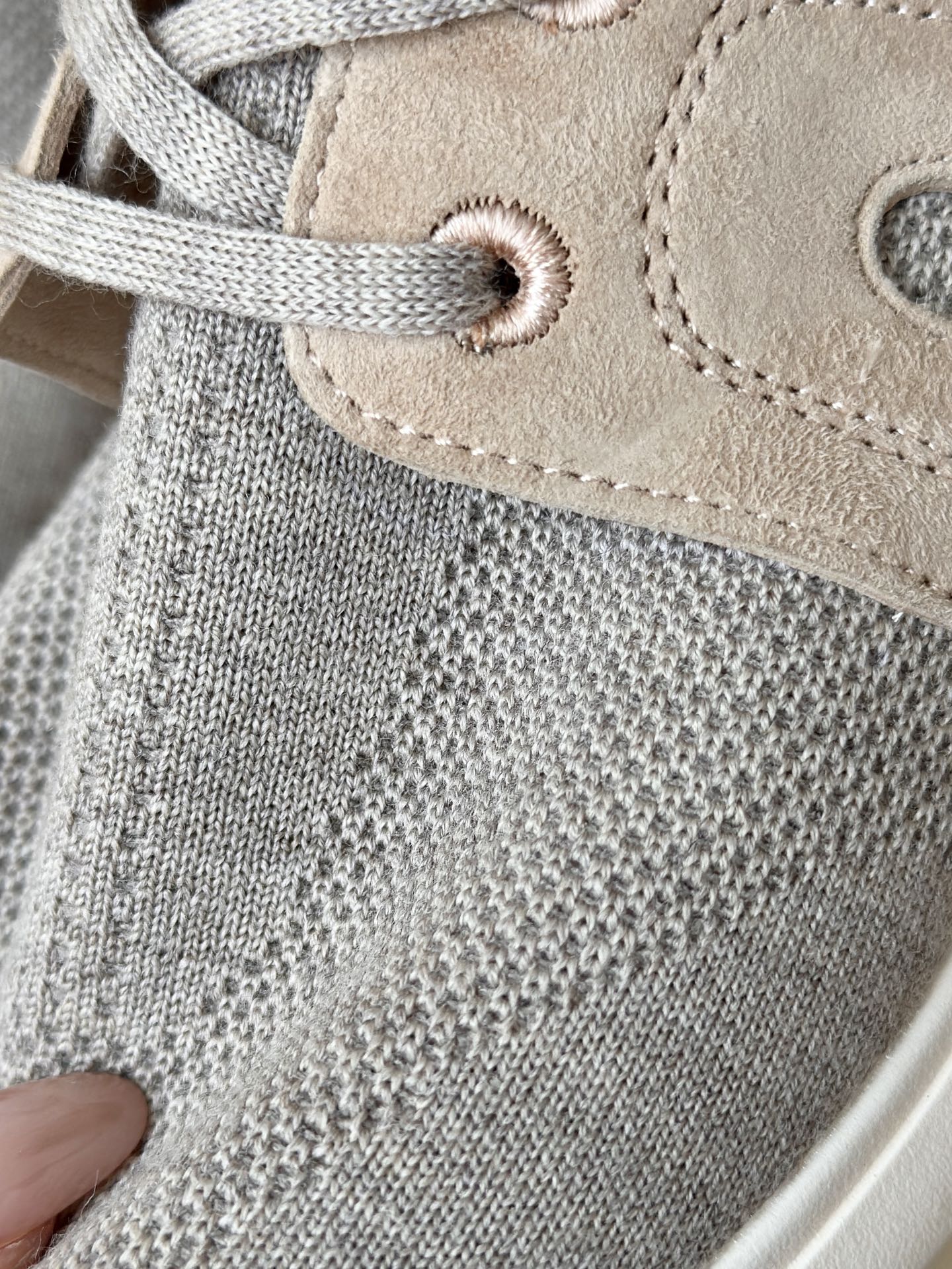 🔸鞋面像毛衣一样在织布机上制成,随后配以轻便鞋底。罗纹松紧带鞋口搭配 Kummel 色饰边 白色鞋外底,配Kummel 色鞋底,印有Loro Piana首字母缩写重复图案Kummel 色提拉环带有Loro Piana 标识