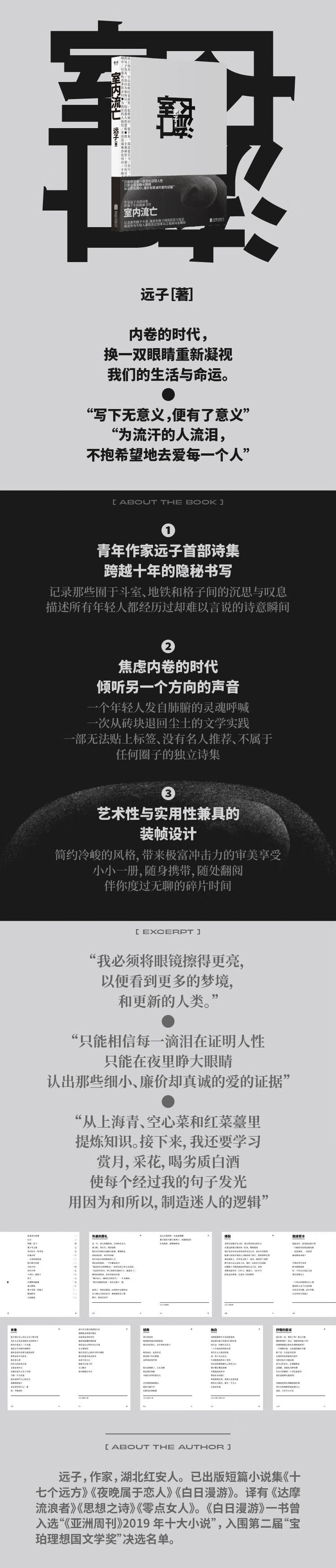 《室内流亡》是作家远子的诗集,它以罕见的坦诚刻下一颗在物质和精神的双重匮乏之中渴望上升和救赎的心,描述一种在轨道之中却又时刻想要脱轨的青年生活。以无处不在的“时代精神”为背景,作者在思辨与抒情的夹缝中层层拆解与重建,坚信诗歌的道德力量,执着于发明新的道路,并真诚地交出自己的回答。