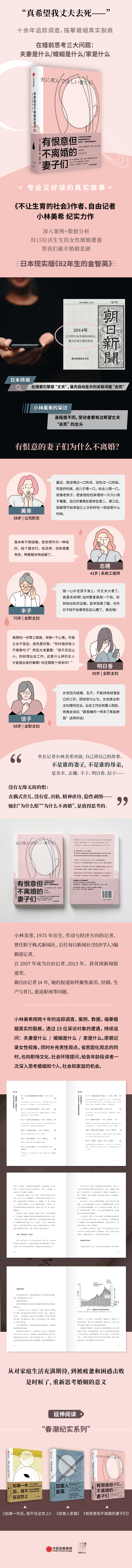小林美希用跨十年的追踪调查、案例、数据,描摹婚姻真实的裂痕,透过15位采访对象的遭遇,持续追问:夫妻是什么/婚姻是什么/家是什么。原貌记录女性视角,同时补充男性观点,省思固化观念的同时,也向职场文化、社会环境提问,给各年龄段读者一次深入思考婚姻和个人、社会和家庭的机会。