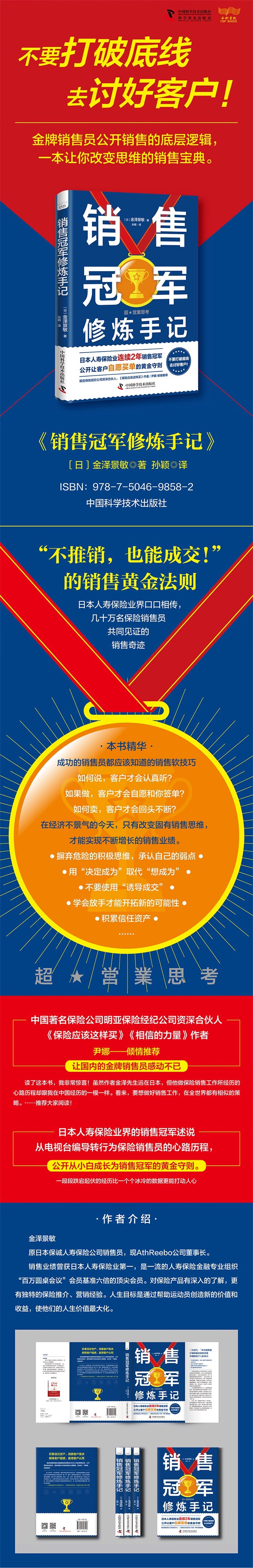 第一章 销售是概率论 丢掉虚假的自尊心 003 用积极的态度去看待让自己不甘心的事情 008 销售是概率论 012 只有实战经验才能让人成长 015 高强度工作才是最强武器 019 危险的积极思维 025 不要理解错“善于自主动脑思考”的意思 030 第二章 积累看不见的资产 因为太想卖,所以被拒绝 039 从自己身上找原因 043 改变措辞以后,内心也会随之改变 048 销售就是积累资产 052 用“决定成为”取代“想成为” 056 第三章 和客户建立联系 改变沟通方式 069 从感兴趣的事说起 072 首先要坦诚相见 078 与客户建立信任关系 084 要用画面讲解 089 像触诊一样倾听客户讲话 092 绝不诱导成交 096 第四章 不要迎合客户,要服务客户 要体谅客户,但不要太客气 105 把客户的心理负担降到最低 110 拥有讨人喜欢的“厚脸皮” 115 不要讨好客户,要服务客户 119 帮忙牵起缘分,就能拓展缘分 122 第五章成绩是自然而然显现出来的 脚踏实地努力的人终究会取得胜利 127 抓住机会的人的思维方式 133 相信 0.00001% 的可能性 139 培养强迫自己行动的强制力 143 奇迹属于有准备的人 147 第六章善于运用影响力 学会放手才能开拓新的可能性 155 只做自己认为正确的事 160 要自己创造答案 163 报答恩情,机会就会降临 168 自己先乐在其中很重要 174 不要和损人利己的人来往 179 活出自己的人生 184 后记