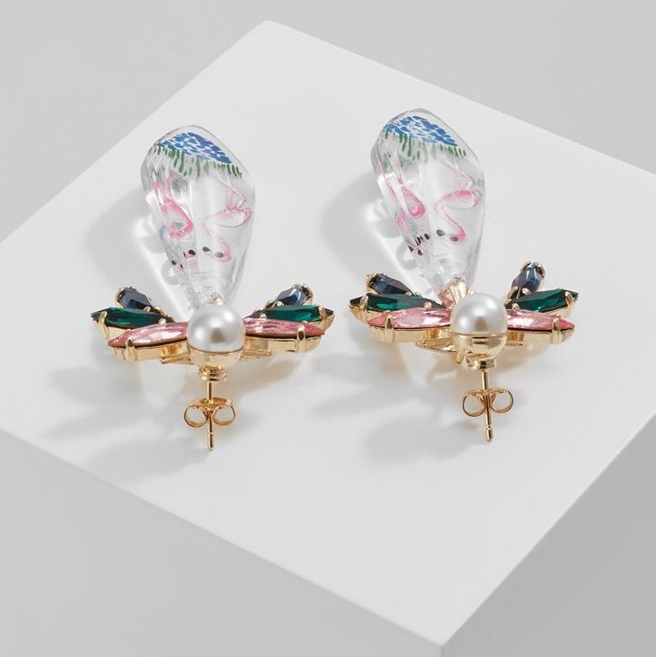 此款耳环为工匠手工绘制火烈鸟图案于有机玻璃之上,栩栩如生。