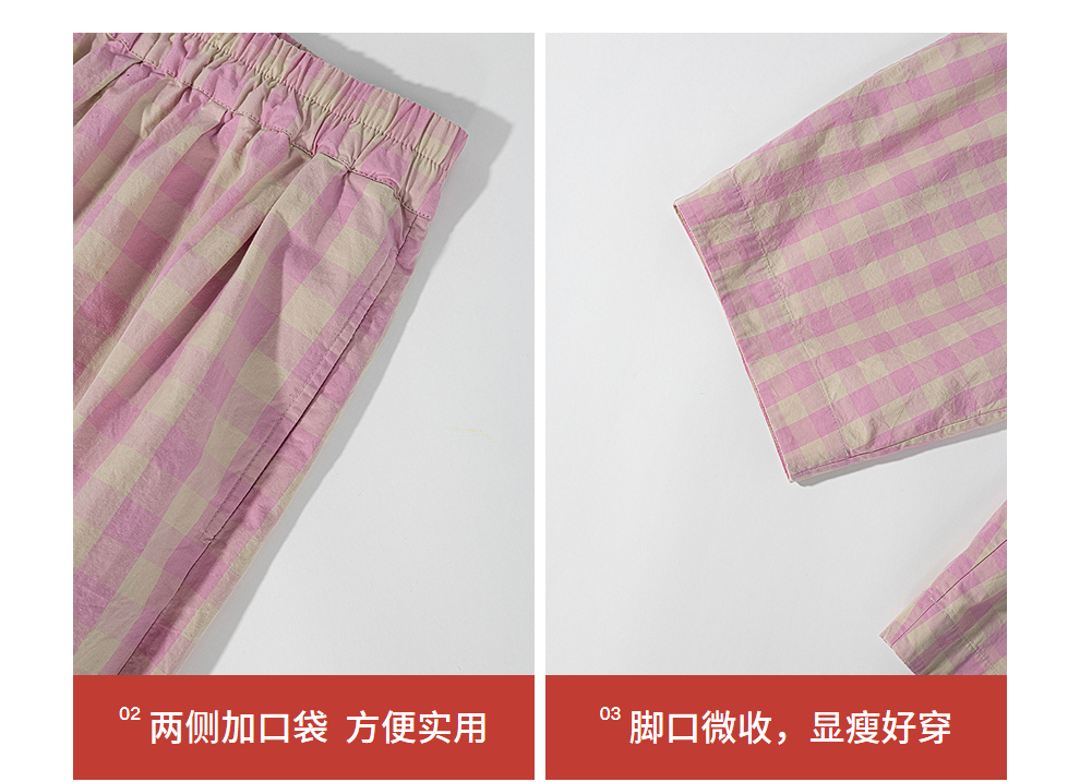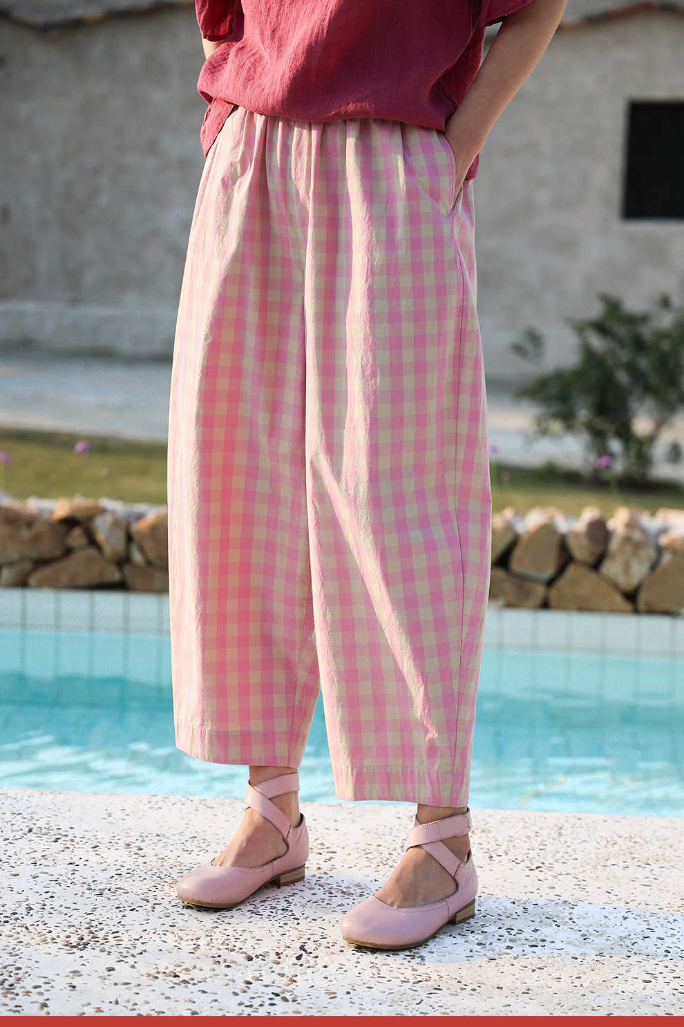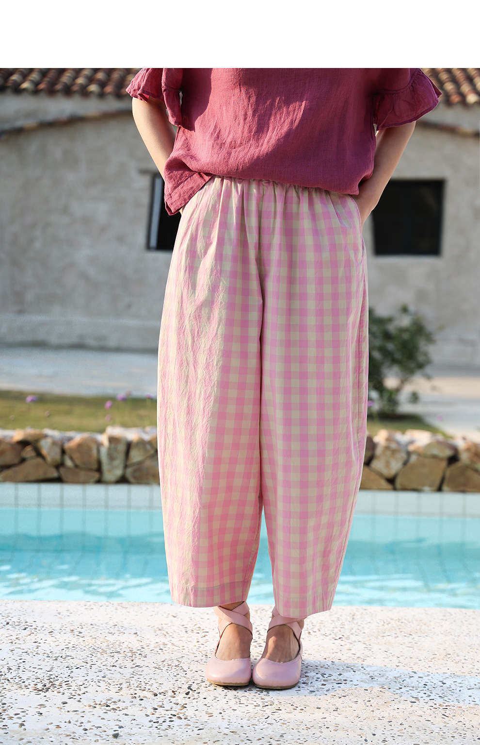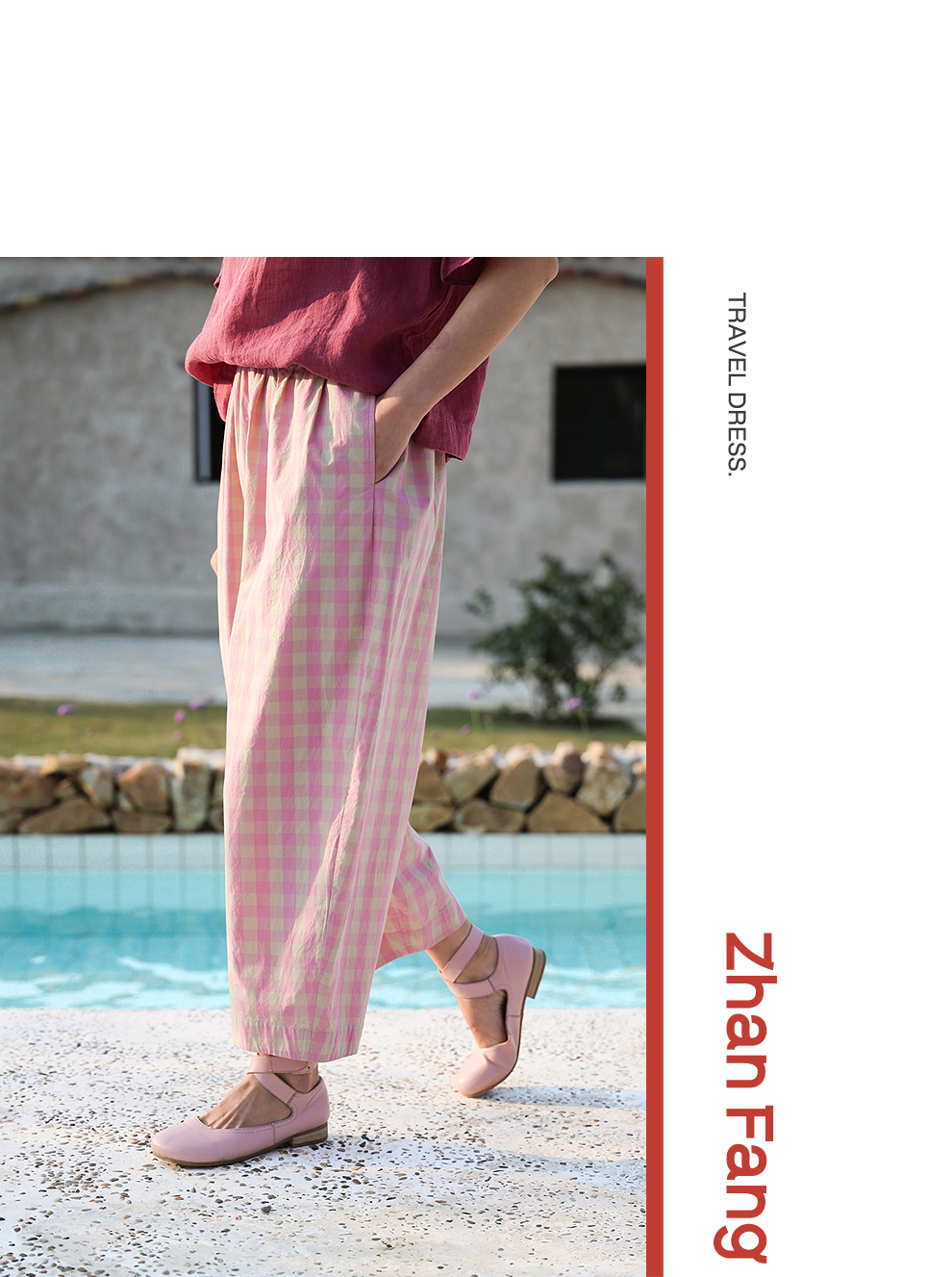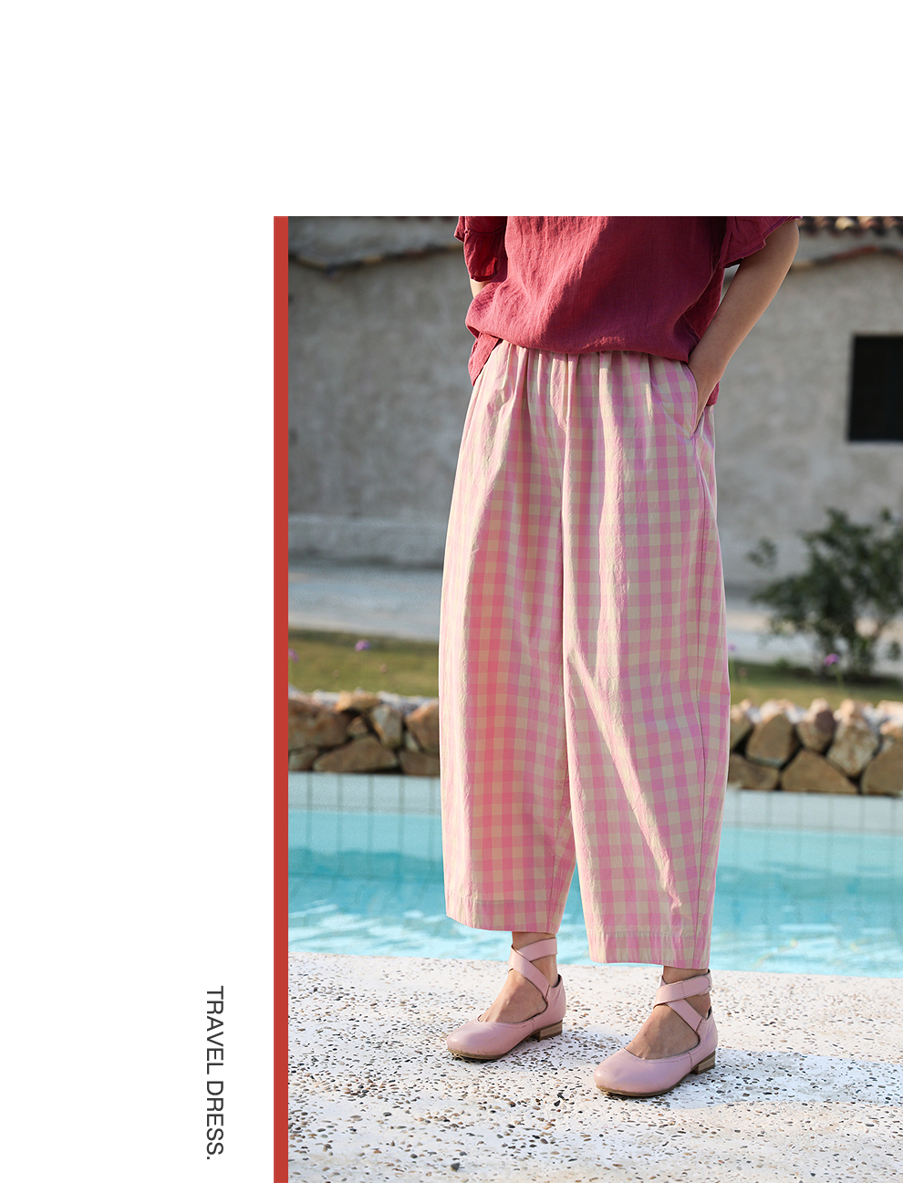 绽放旅行女装250朵/日本进口高密纱线色织格全腰松紧九分裤休闲裤