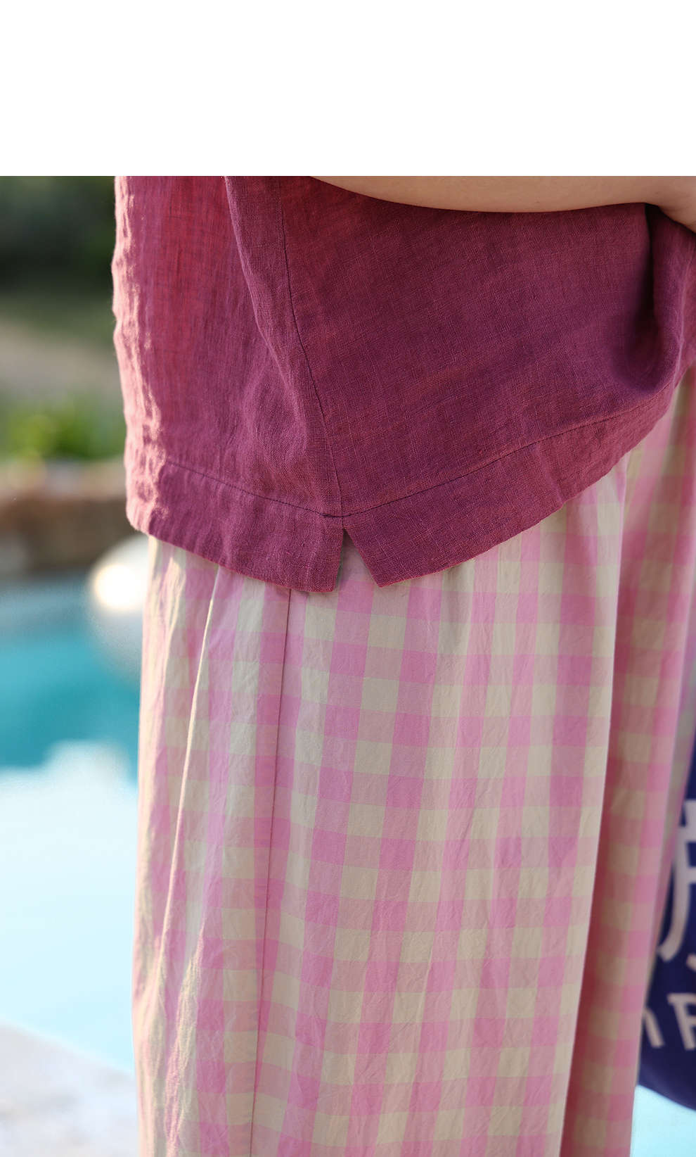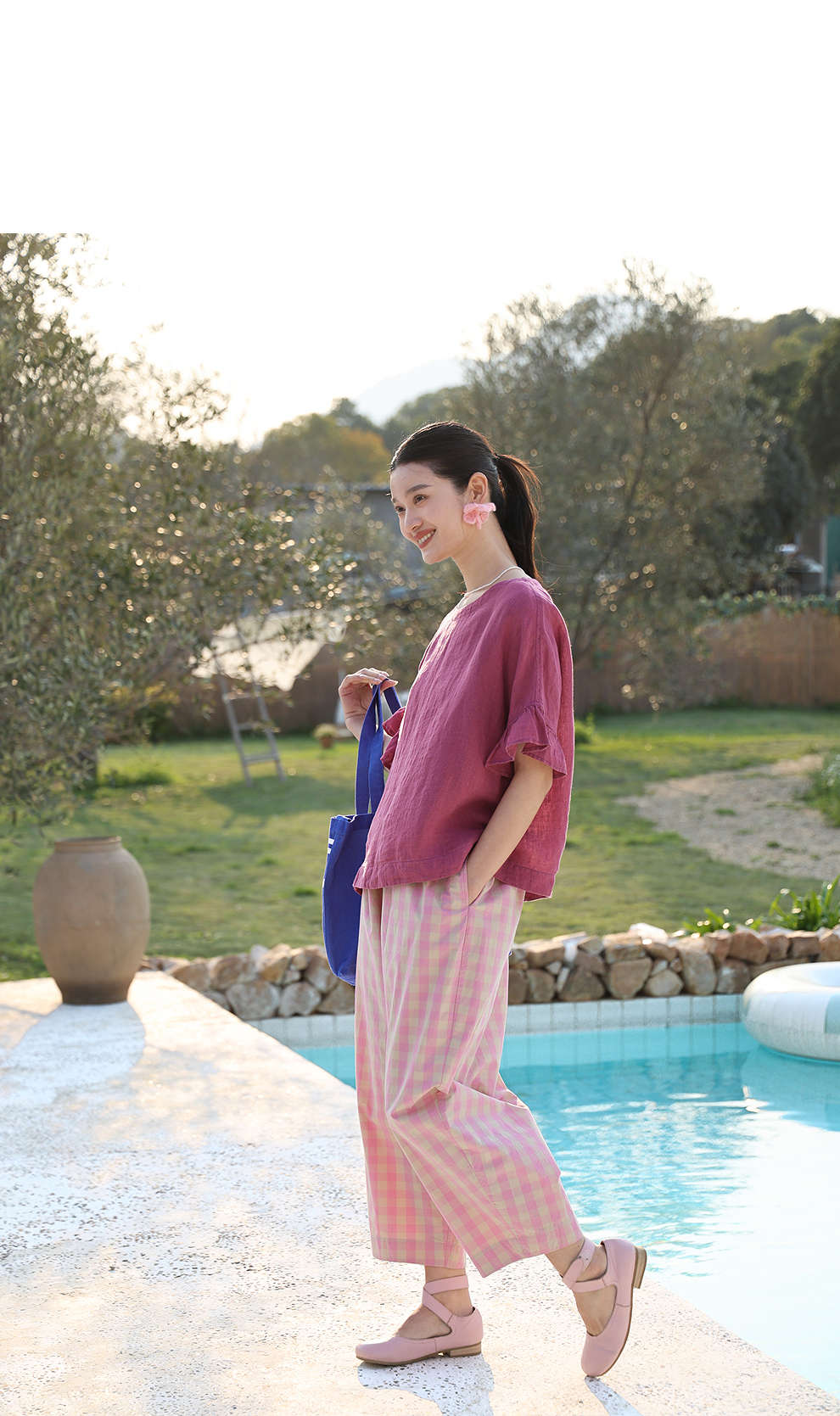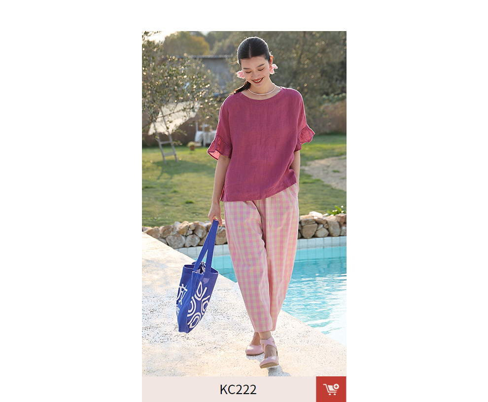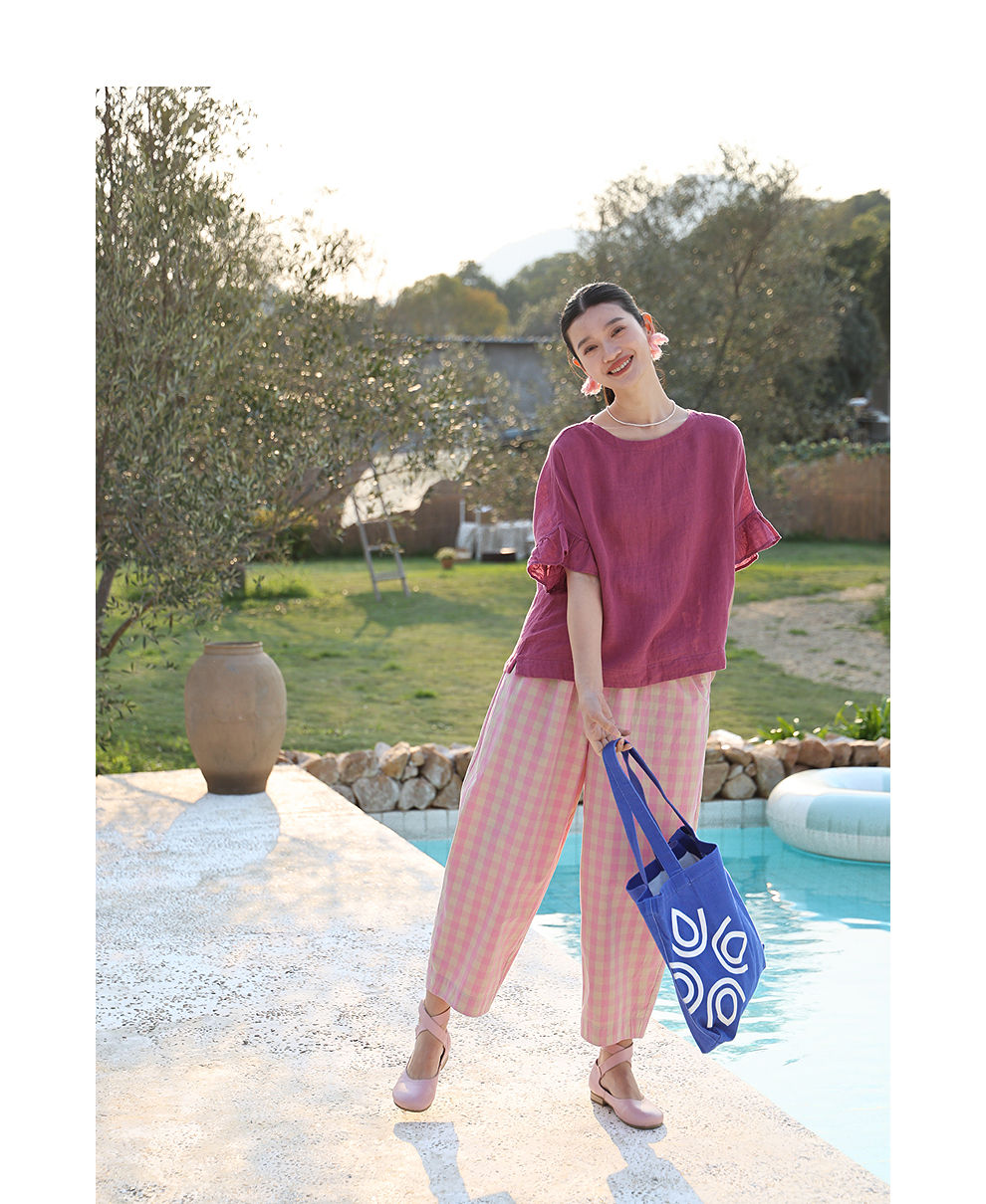 绽放旅行女装250朵/日本进口高密纱线色织格全腰松紧九分裤休闲裤