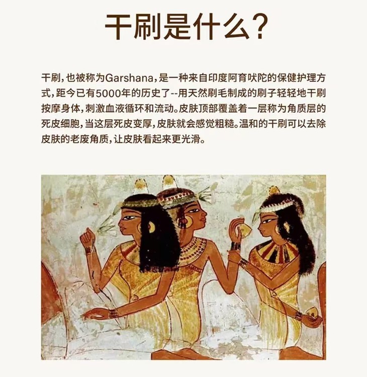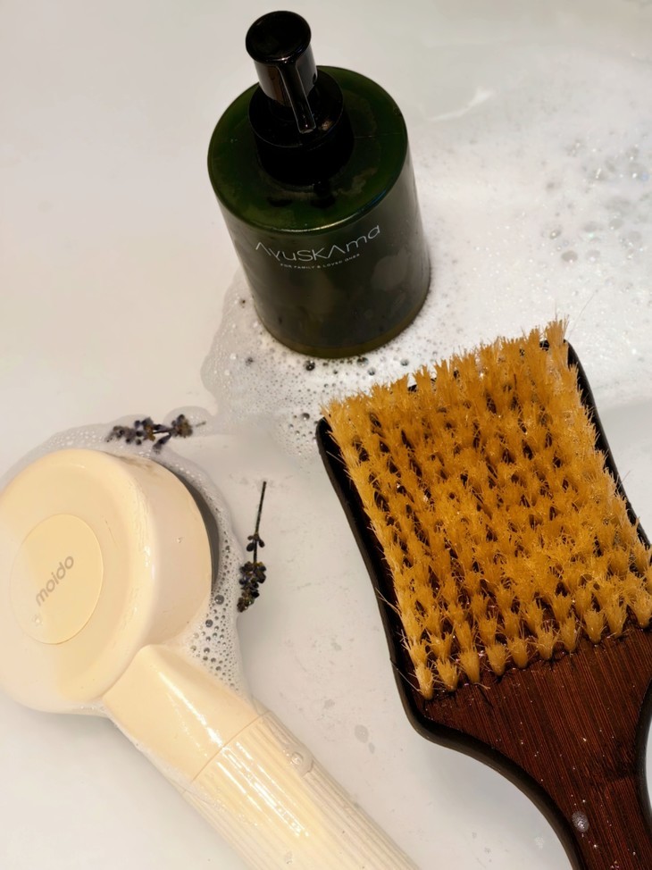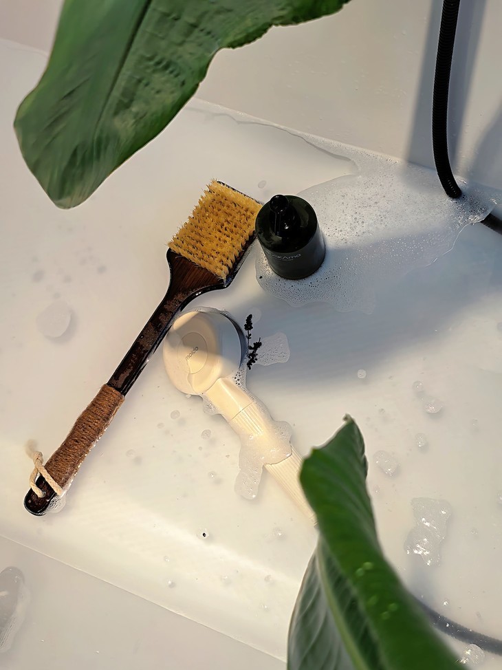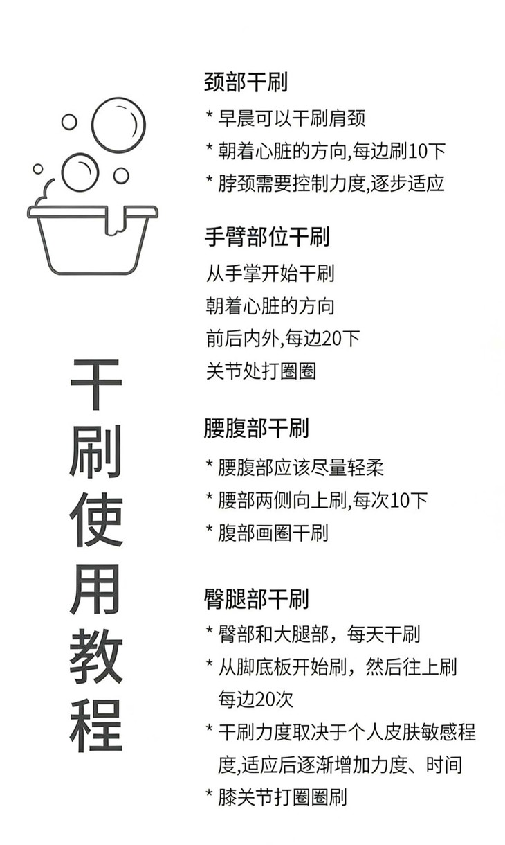 除了日常洗澡,浴刷还能用来体验源自印度阿育吠陀的“干刷疗法”Garshana,有兴趣的可以试试!干刷建议在早晨空腹、未洗澡时进行,这样既能刺激血液循环、加速身体代谢,还能唤醒沉睡的身体活力,帮你开启元气满满的一天。不同部位有不同的操作技巧:刷颈部时,要朝着心脏方向轻刷,每边刷10下左右,注意控制力度——颈部皮肤娇嫩,别太用力;刷手臂时,从手掌开始往上刷,前后内外四个面各刷20下,遇到肘关节就慢慢打圈圈按摩,避免用力摩擦;腰腹部的动作要更轻柔,腰部两侧从下往上刷,腹部顺时针画圈刷,每次各10下即可,别用力按压;臀部和大腿则从脚底板开始往上刷,每边刷20次,膝关节处同样打圈圈,力度可以根据自己的皮肤敏感度调整,刚开始轻一点,适应后再慢慢增加。大家干刷前可以先抹上轻盈按摩油、苦橙按摩油或是茉莉玫瑰按摩油等等,能让深层SPA的效果事半功倍!