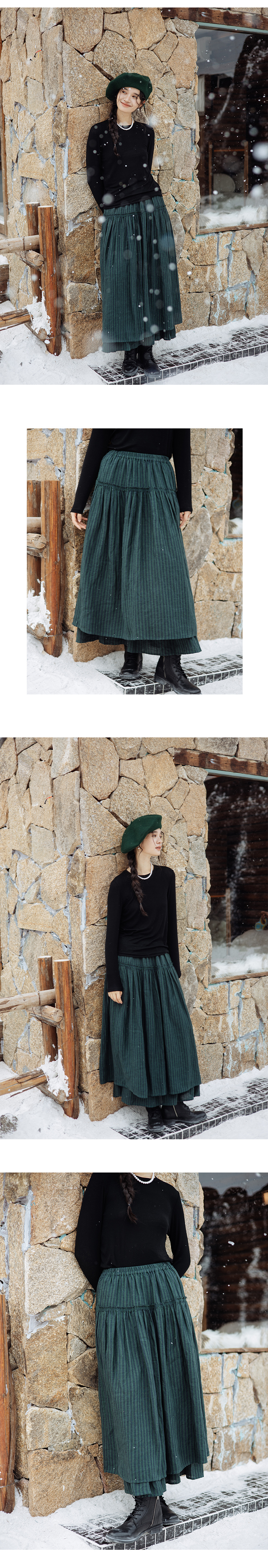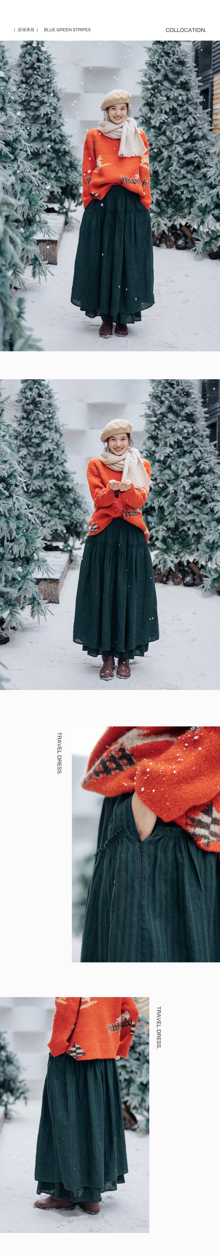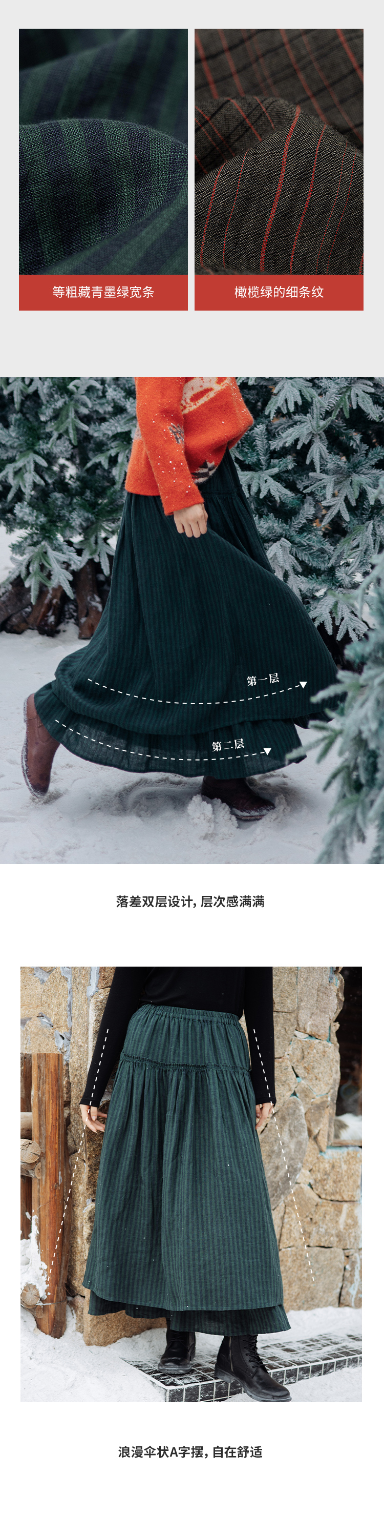 绽放835朵/蛋糕裙亚麻色织条纹松紧腰立体木耳边双层落差半身长裙