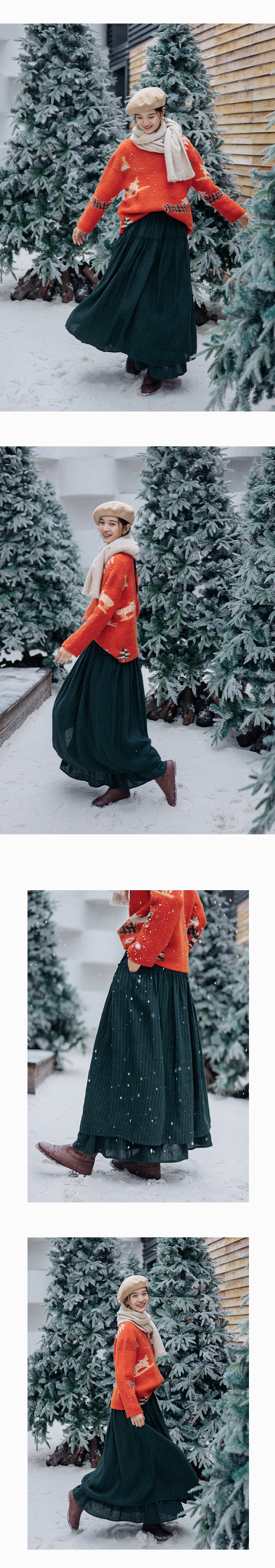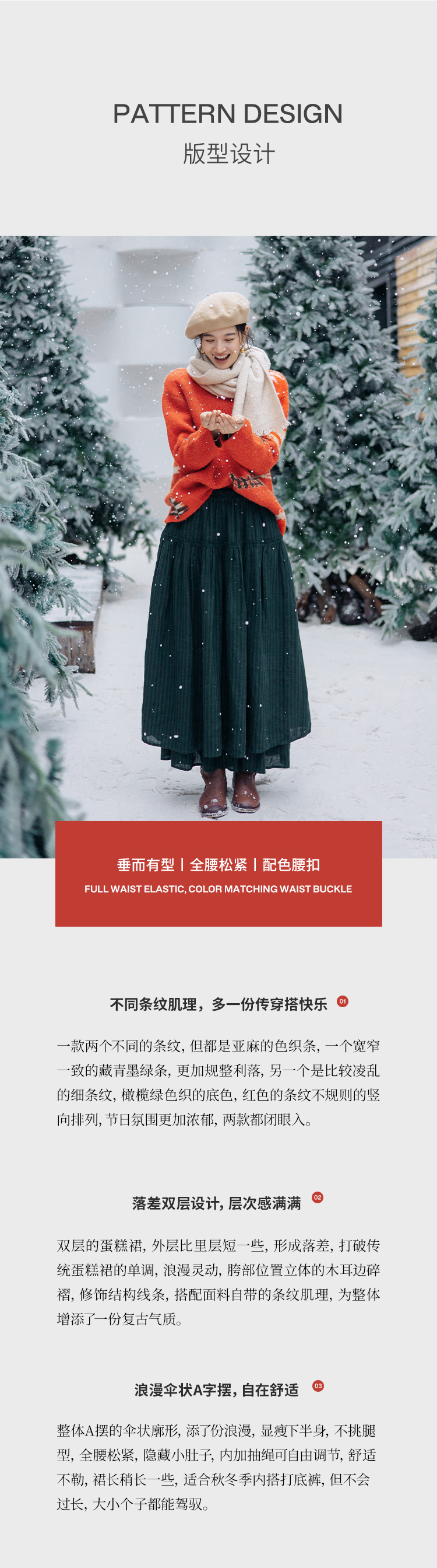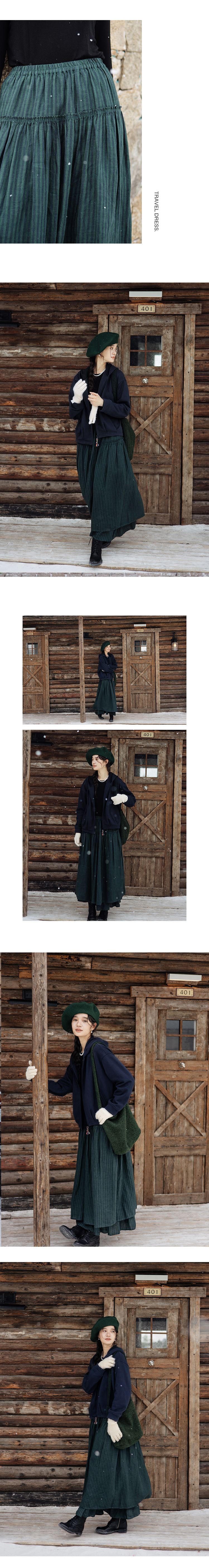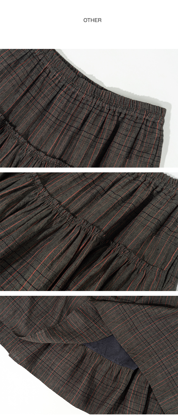 绽放835朵/蛋糕裙亚麻色织条纹松紧腰立体木耳边双层落差半身长裙