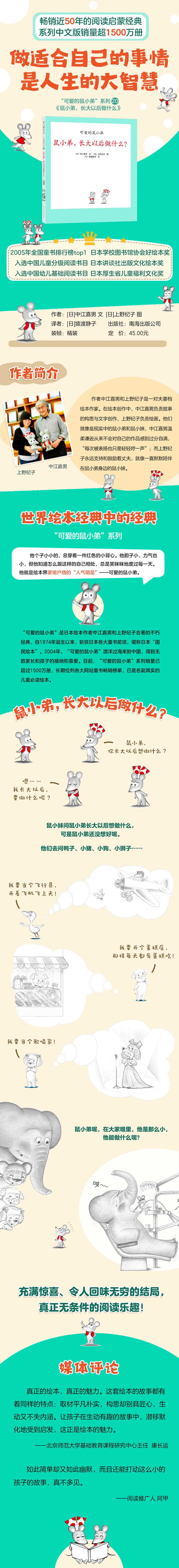 “可爱的鼠小弟”系列是日本绘本作者中江嘉男和上野纪子合著的不朽经典,自1974年诞生以来,斩获日本各大童书奖项——日本学校图书馆协会好绘本奖、日本产经儿童出版文化奖、日本讲谈社出版文化绘本奖、日本厚生省儿童福利文化奖,堪称日本“国民绘本”。