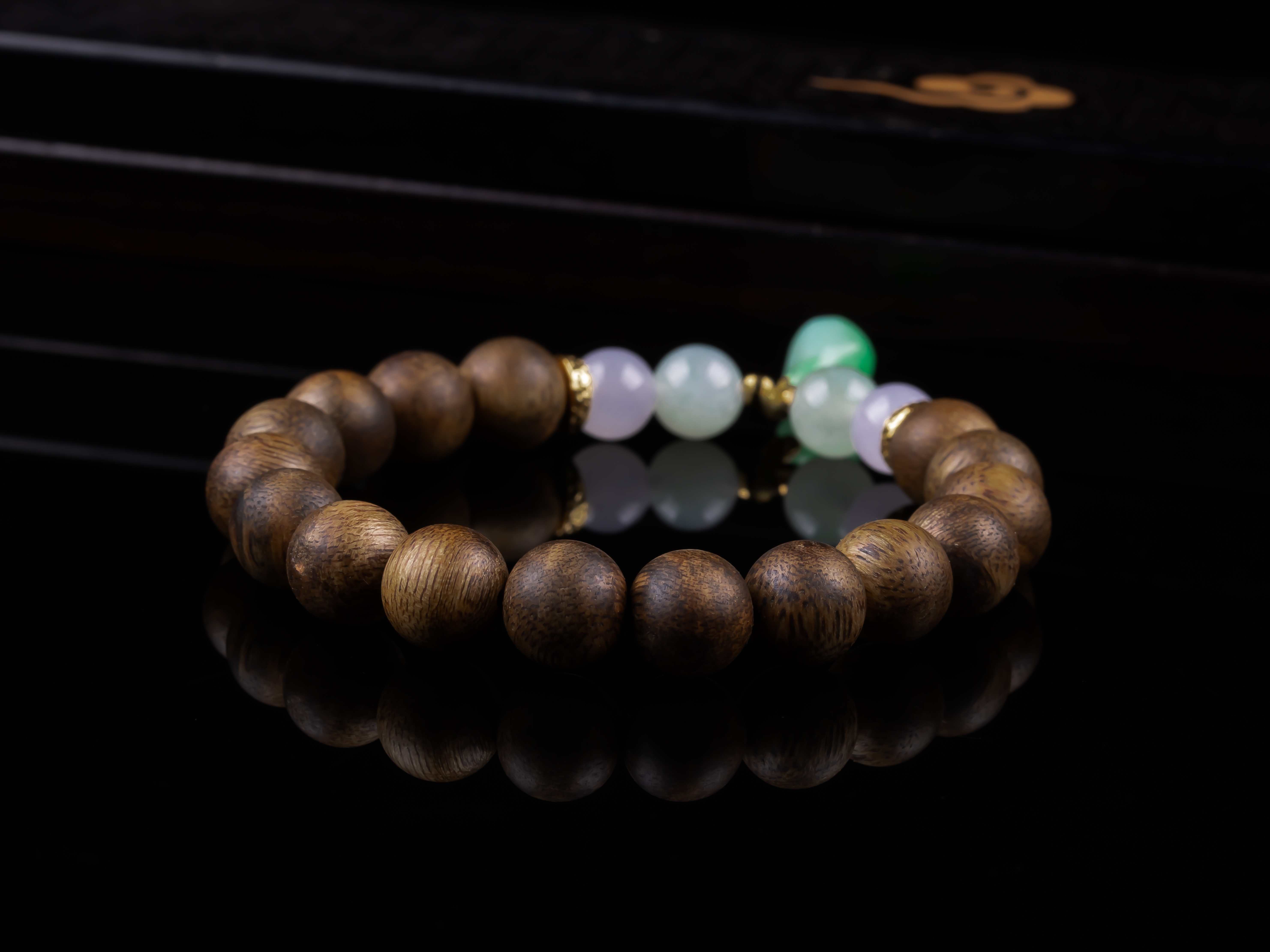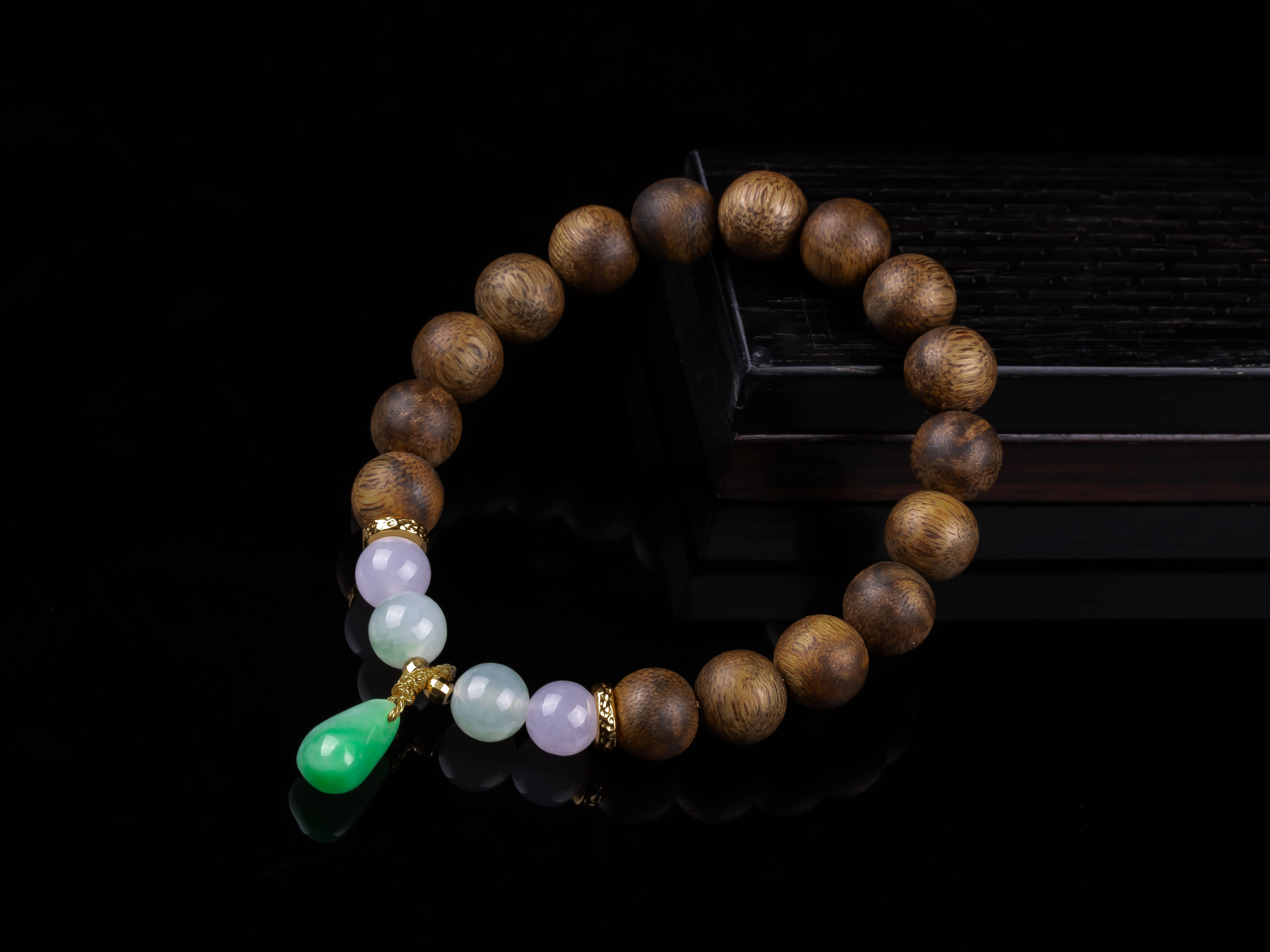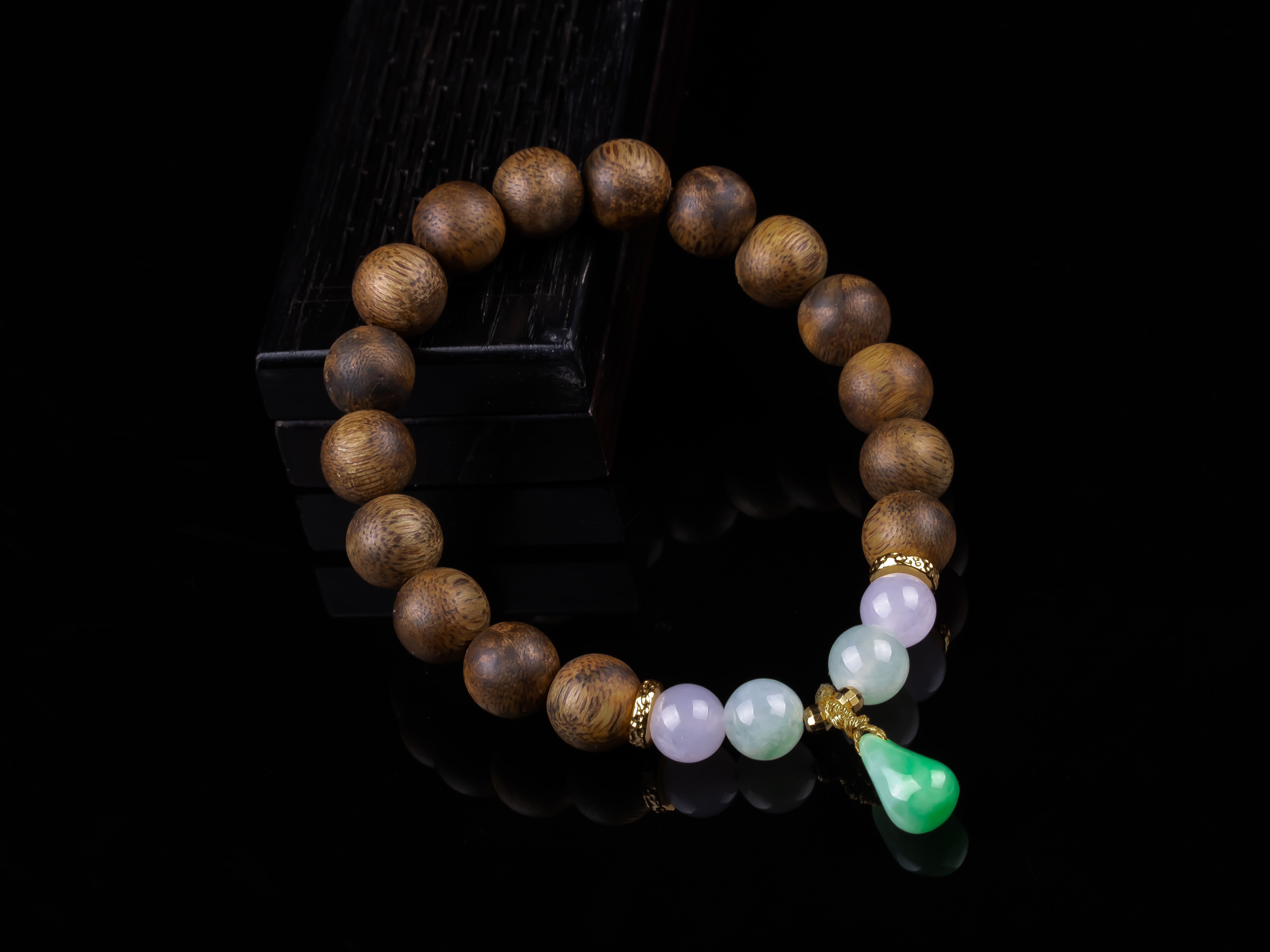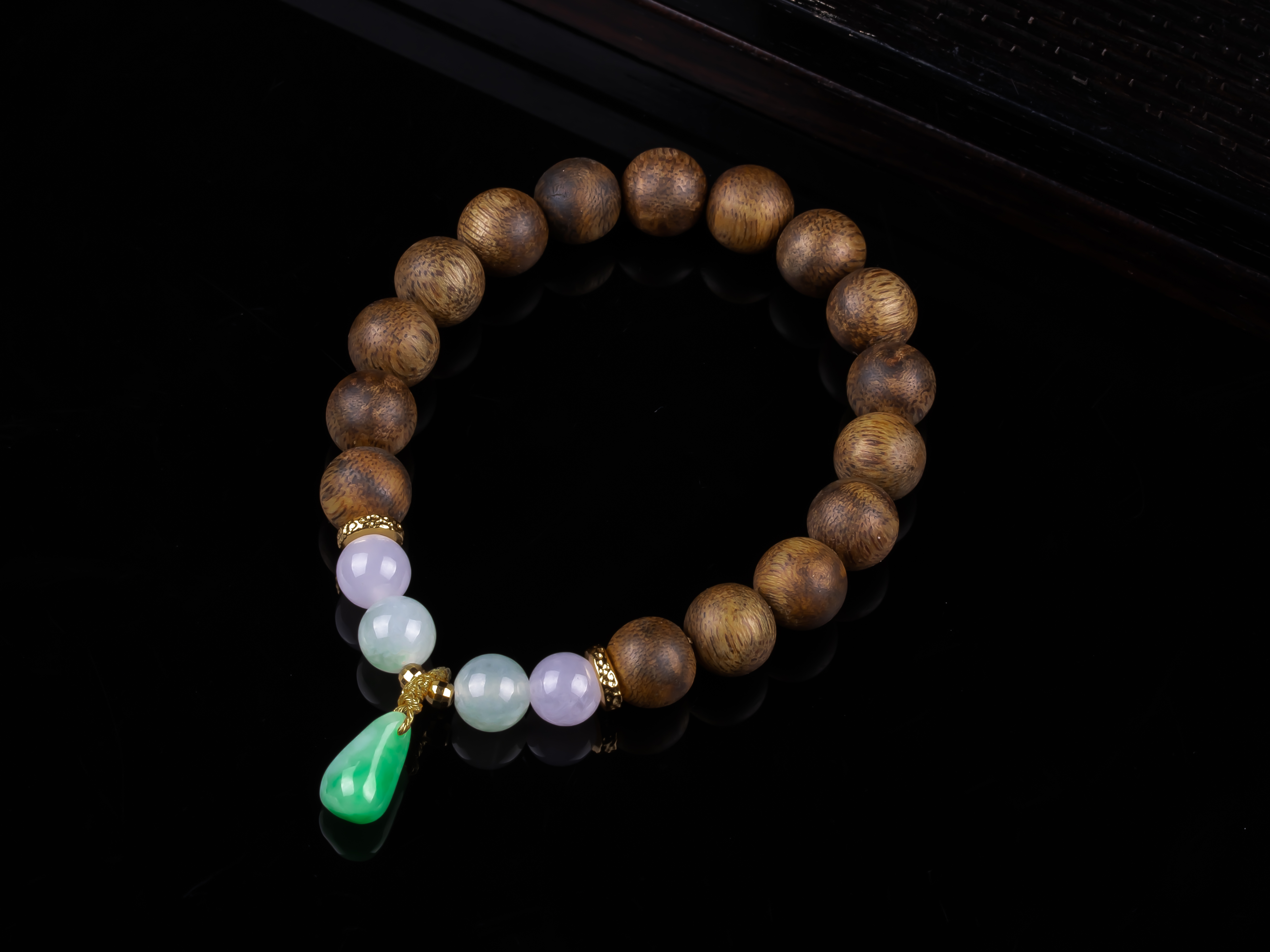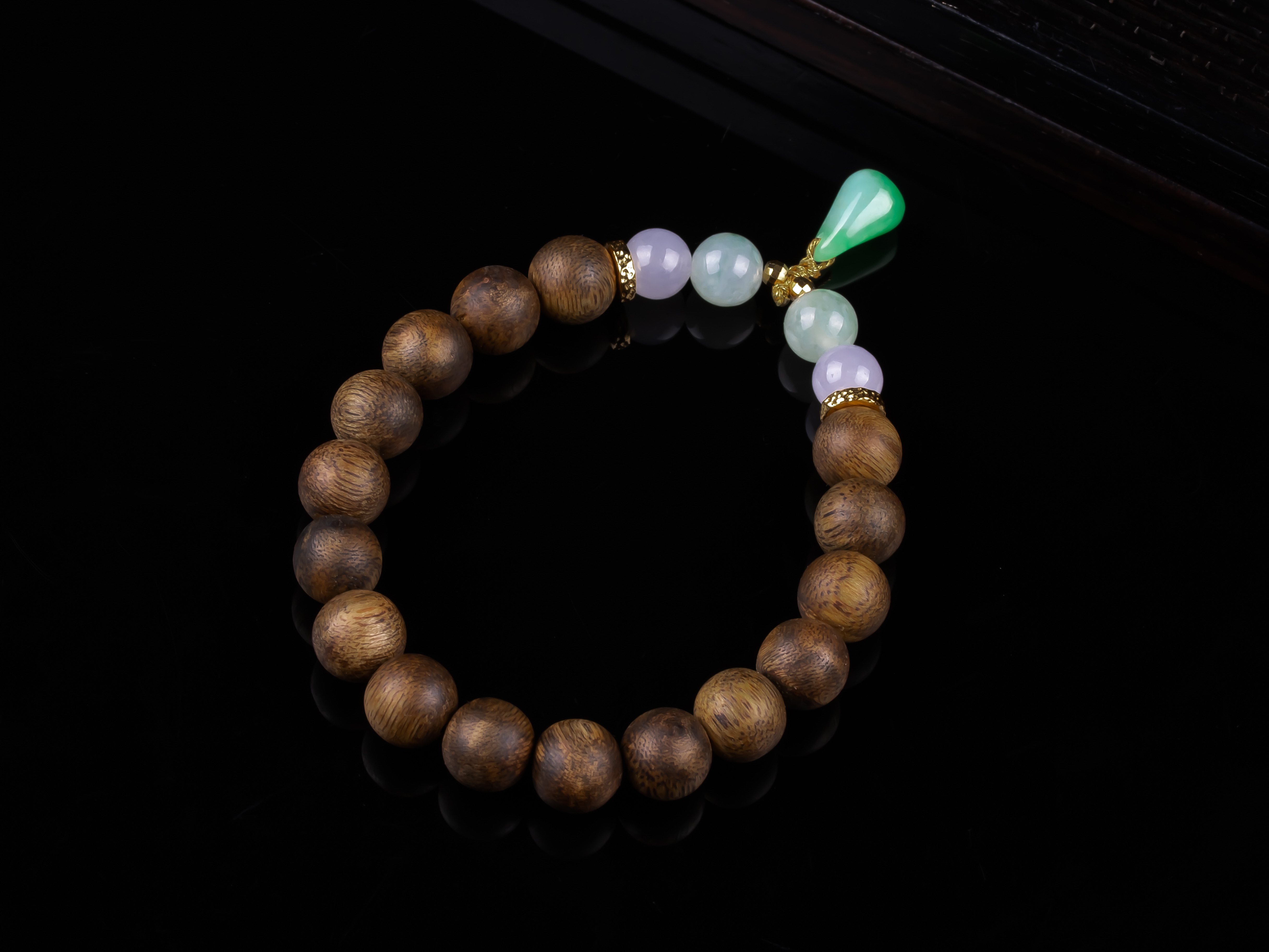 XY0240沉香+阳绿随形翡翠小提溜手串.银,天然沉香9.3mm,原色原味,香味自然清甜,一只飘阳绿的翡翠随形小提溜灵动有趣,上边淡紫、飘绿翡翠各两颗,超美的国风搭配,透露着温润、知性、雅致的东方之美。