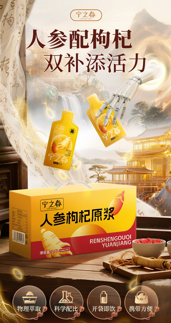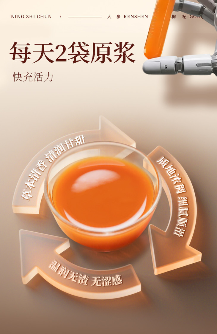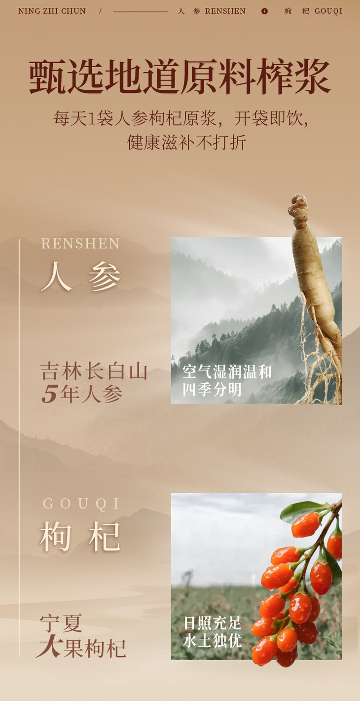 佛系养生党看过来!宁之春人参枸杞原浆,真的是“滋补黄金组”,人参温着补元气,枸杞润着益精气,一温一润不仅让功效翻倍,还能平衡药性,不怕单补上火,给营养吸收铺好路。小小一袋,只把长白山的参香、宁夏的枸杞甜装进小袋里,让养身这件事轻松得像喝饮料!