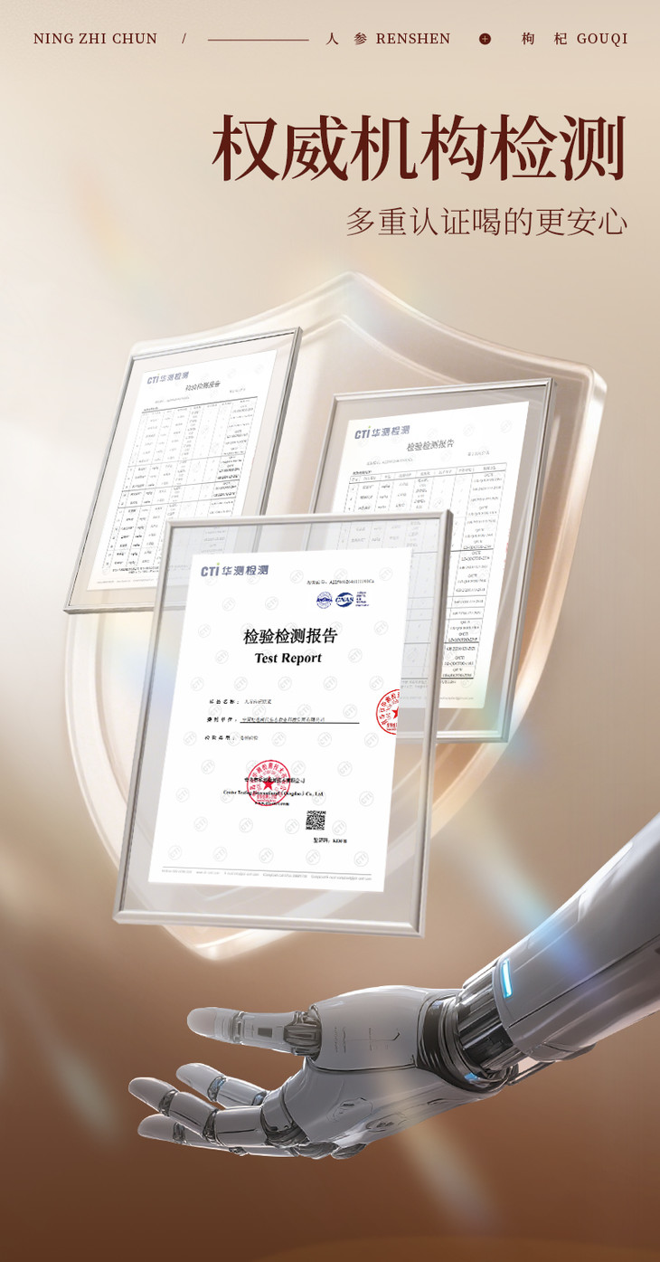 宁之春人参枸杞的原料格外地道。人参源自长白山,只选5年及以下的人工种植参,既避开了年份过久导致的成分老化,又留住了参的鲜嫩质感,温补元气很实在;枸杞则是宁夏的优质品种,借充足日照攒足糖分,凭昼夜温差锁住营养,再经黄河水浸润的沙质土壤滋养,颗颗饱满紧实,榨浆前还会仔细剔除坏果与杂质,确保品质最优。同时,品牌采用低温破壁萃取技术,靠物理方式敲开参和枸杞的细胞壁,把小分子营养充分释放,好吸收还不浪费;生产全程在10万级清洁车间进行,无菌操作隔绝微生物污染,还联合宁夏大学研发配方、经CTi华测检测——原料的农残、重金属,成品的营养、微生物等均符合国标,喝起来格外安心。