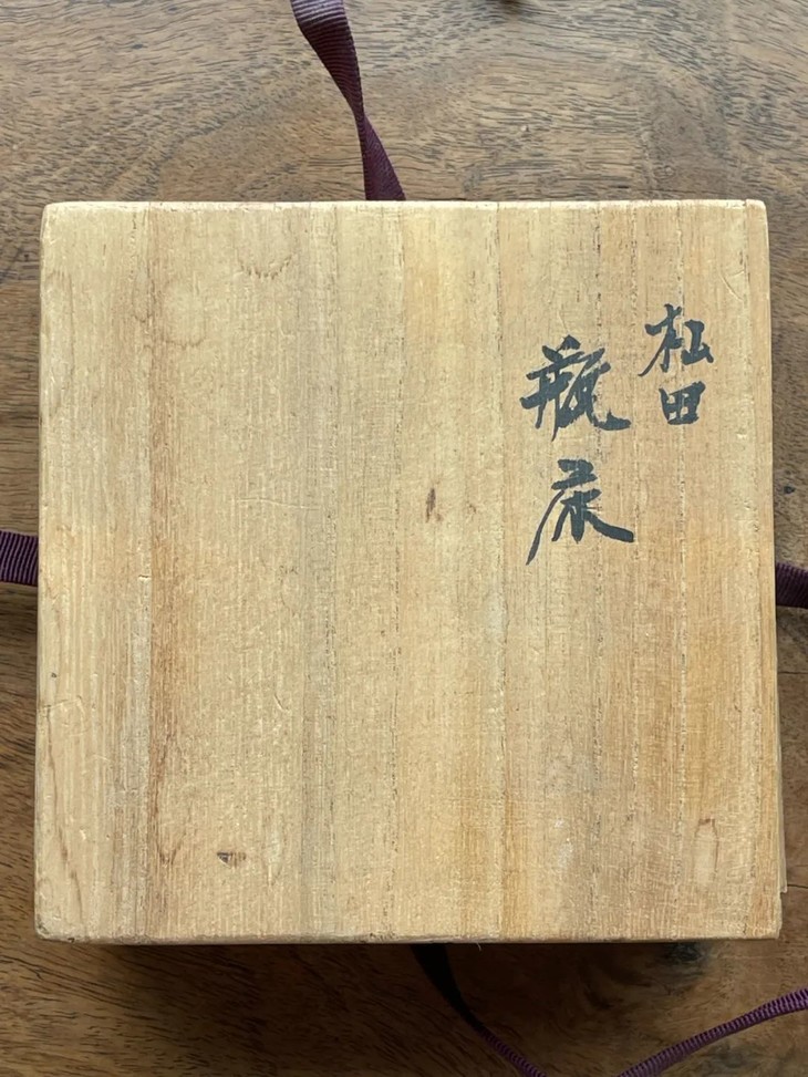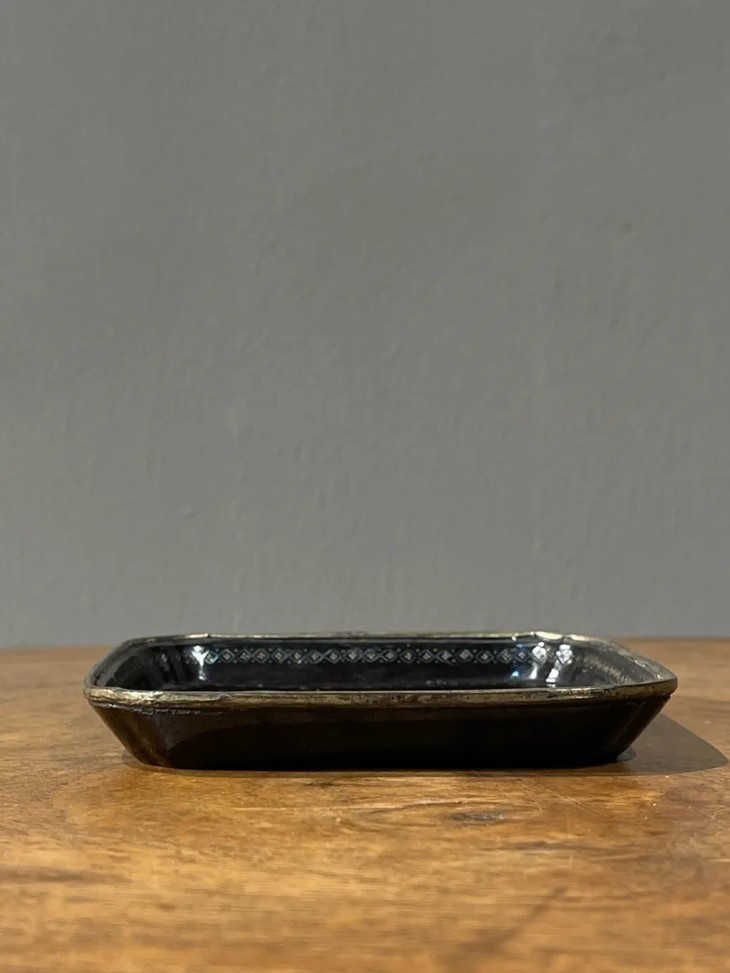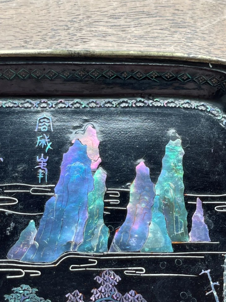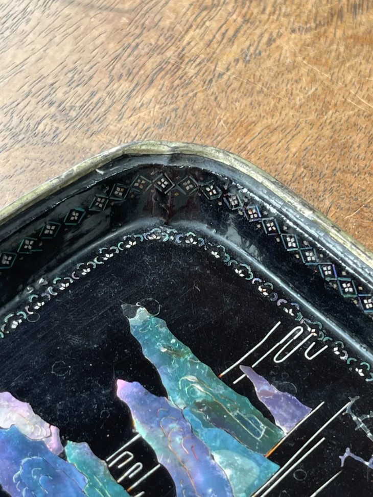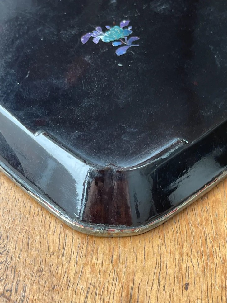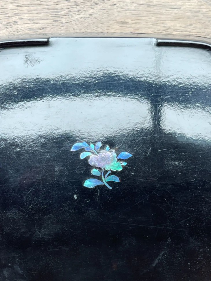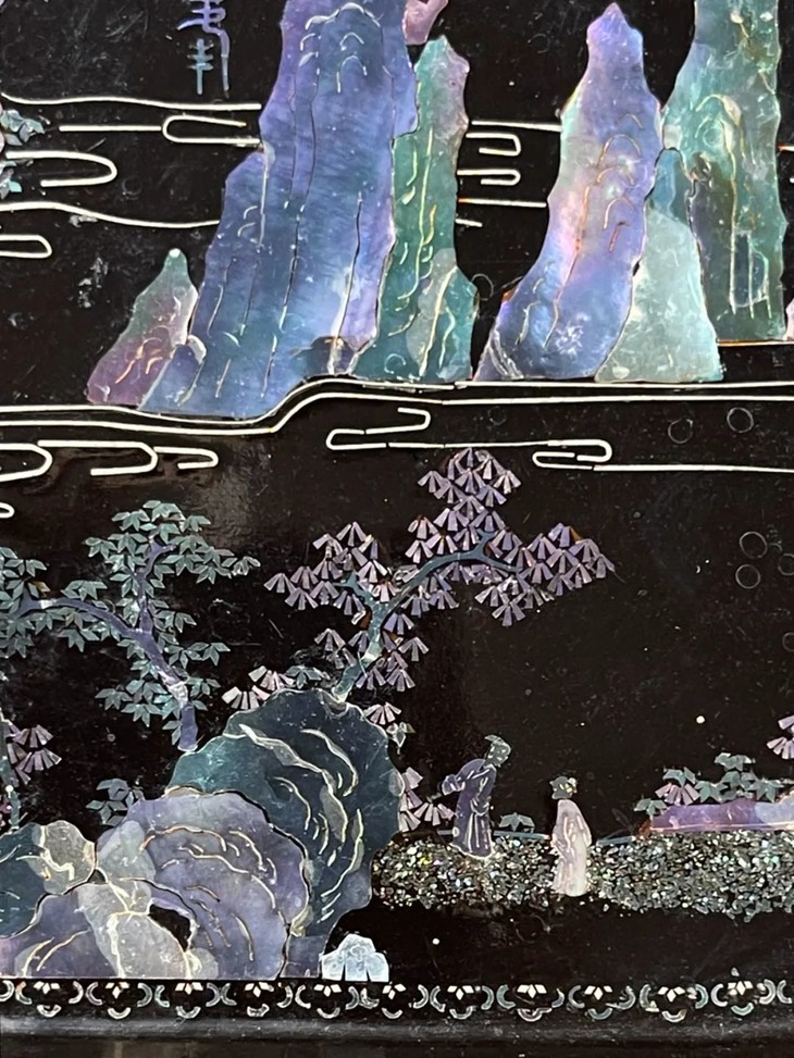 此件镶螺钿山水图黑漆方碟,尺寸虽小,造形比例合谐优美,纹饰设计灵巧,螺钿七彩缤纷、镶工精湛华丽,黑漆乌亮,镶银边精緻,皮壳包浆温润,保存于前藏家定制的桐木箱内,盒盖墨书:“松田 瓶床”。 是一件时代风格清楚螺钿文房小碟,除银边稍松落、表面轻微刮痕与磨痕外,保存完好。