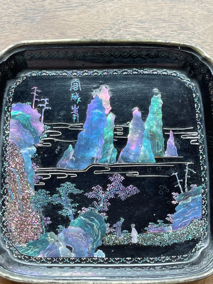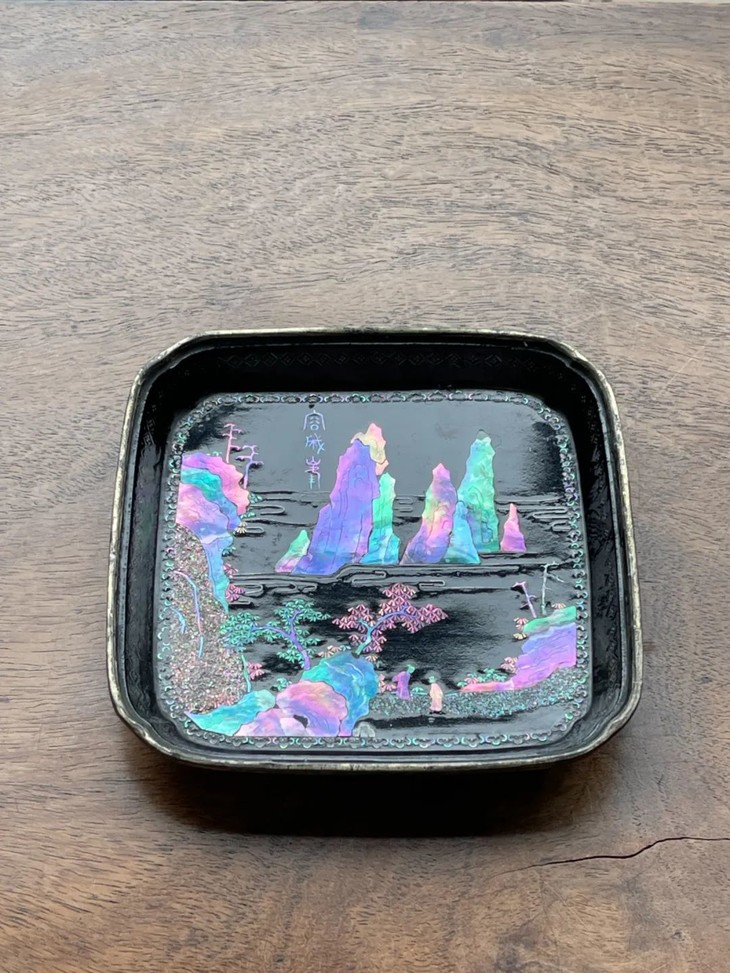 这是一件设计典雅、构图唯美、做工精緻的镶螺钿山水图黑漆方碟,倭角平底四方浅碟,乌黑大漆口沿镶银边,碟内表面满工镶嵌多彩螺钿细腻华丽的山水图案与篆体主题“容戚峯”,平底中央螺钿镶一朵小花,整体造形与纹饰优美华丽,螺钿镶嵌工艺精湛,大漆乌亮质地细腻,是典形早期大漆螺钿小精品,尺寸虽小确取材奇佳,制作工艺精致细腻,气质高雅,是年代老的文房小碟。