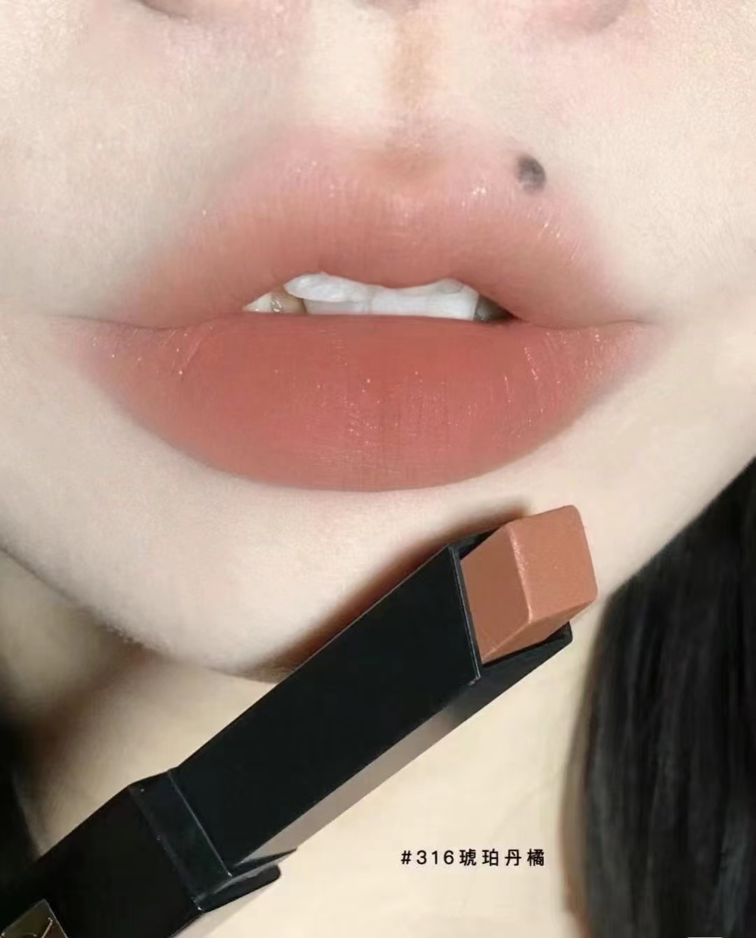 真的很爱小黑条的糕级设计!整个系列上嘴是裸感半哑光的质地!真的可以轻松驾驭各种场合!手慢无!小黑条口红#316琥珀丹橘 低饱和奶茶~偏暖调的茶杏裸棕色 带细闪 柔和耐看 就是那种日杂杏色腮红的颜色~嫩呼呼的裸色调!软软糯糯的肉欲感!黄皮姐妹一眼爱住!不挑场合不挑肤色非他莫属!
