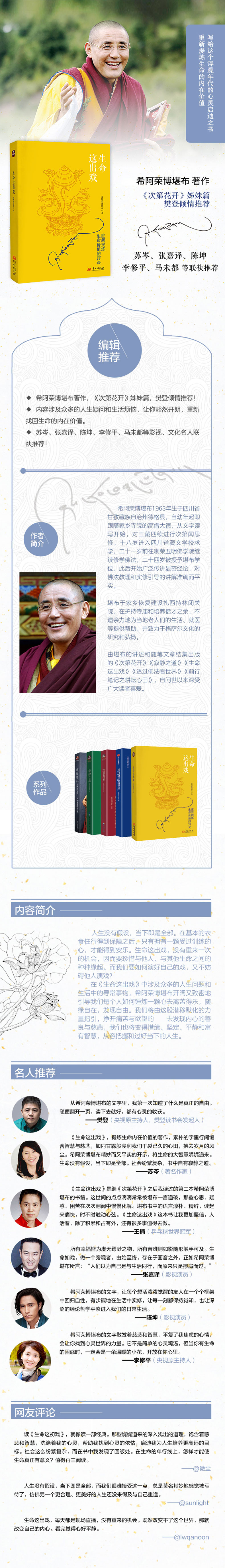 由堪布的讲述和随笔文章结集出版的《次第花开》《寂静之道》《生命这出戏》《透过佛法看世界》《前行笔记之耕耘心田》,自问世以来深受广大读者喜爱。