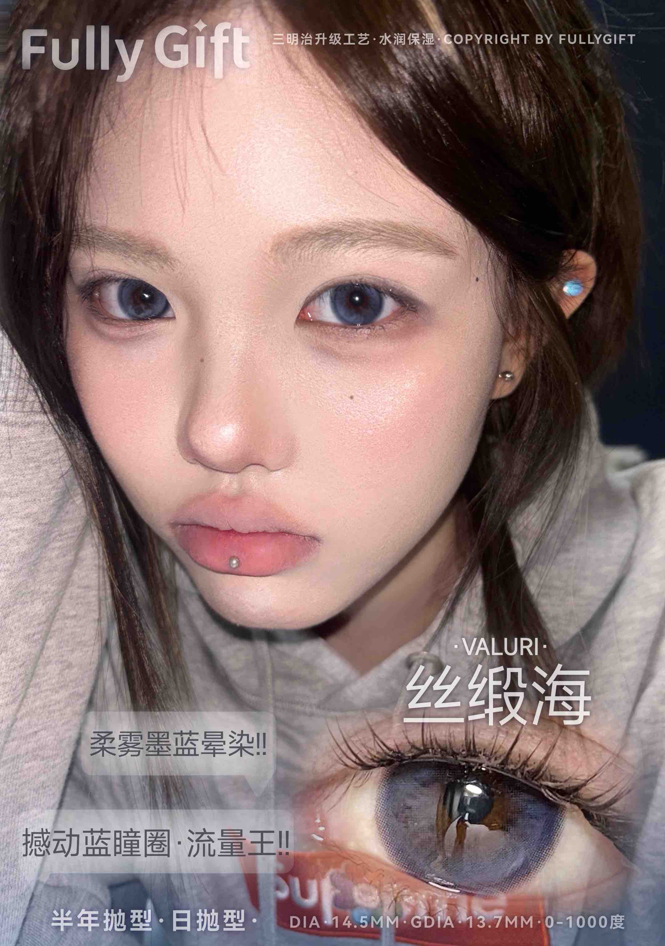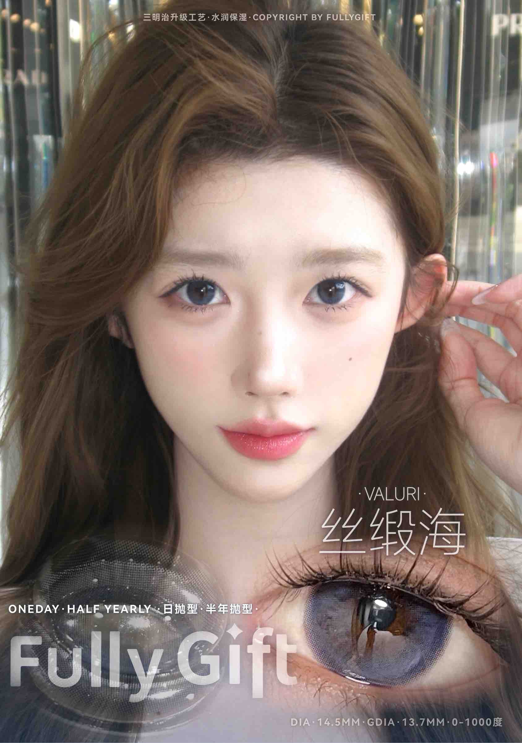 标注直径:14.5mm着色直径:13.7mm实际佩戴直径参考:14.3mm含水量:38%佩戴期限:半年型(建议六个月)可配:0-800度(无525/575)工厂:icodi含硅水凝胶