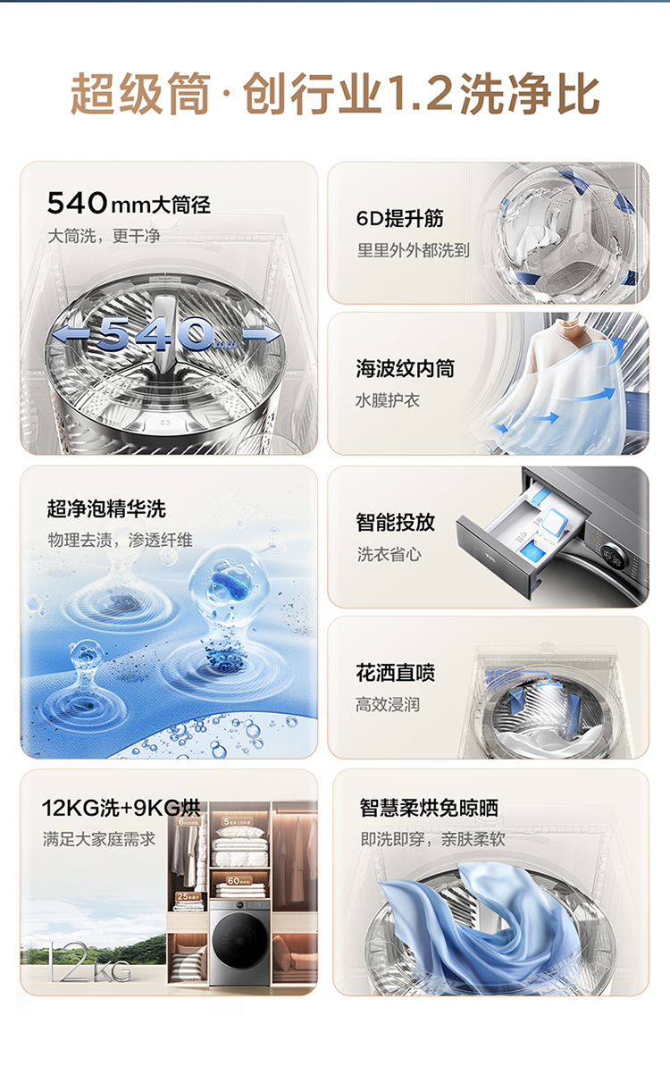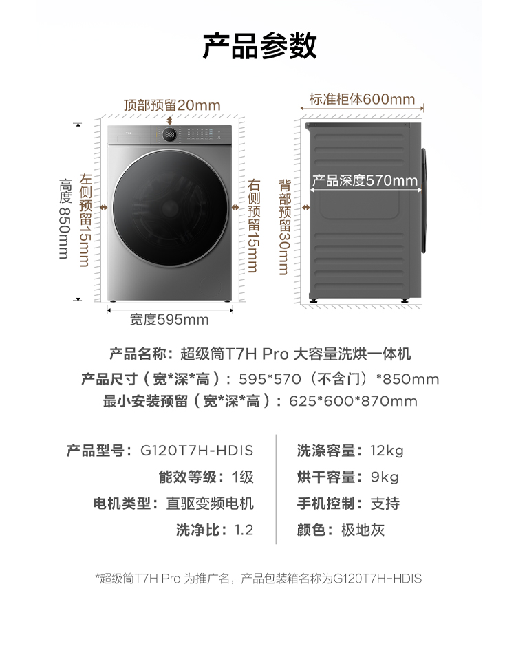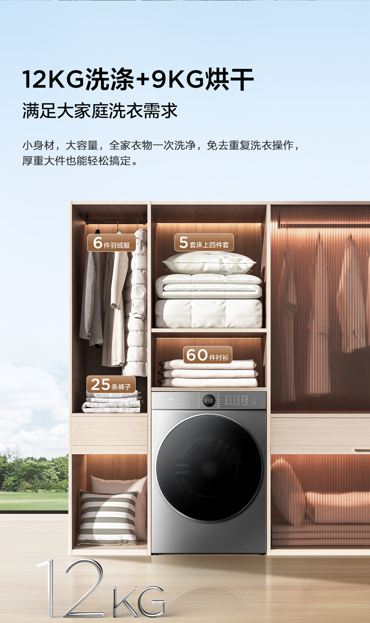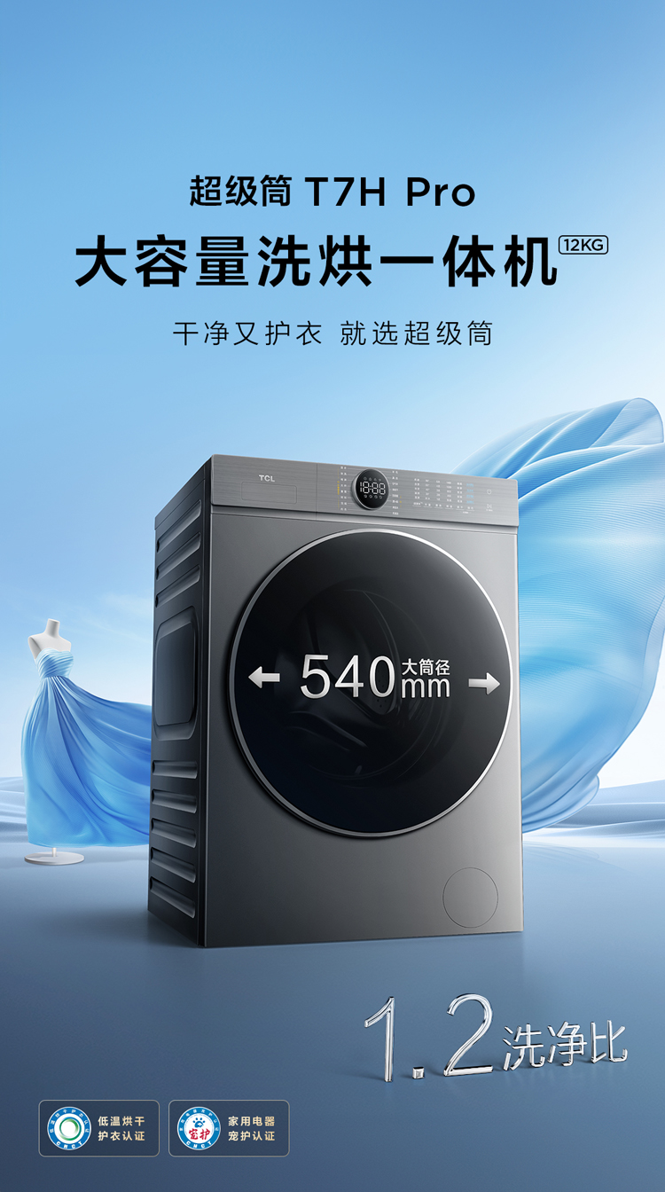 【TCL洗衣机】 TCL 12公斤超级筒T7H Pro大容量洗烘一体机 1.2洗净比 超净泡精华洗 G120T7H-HDIS
