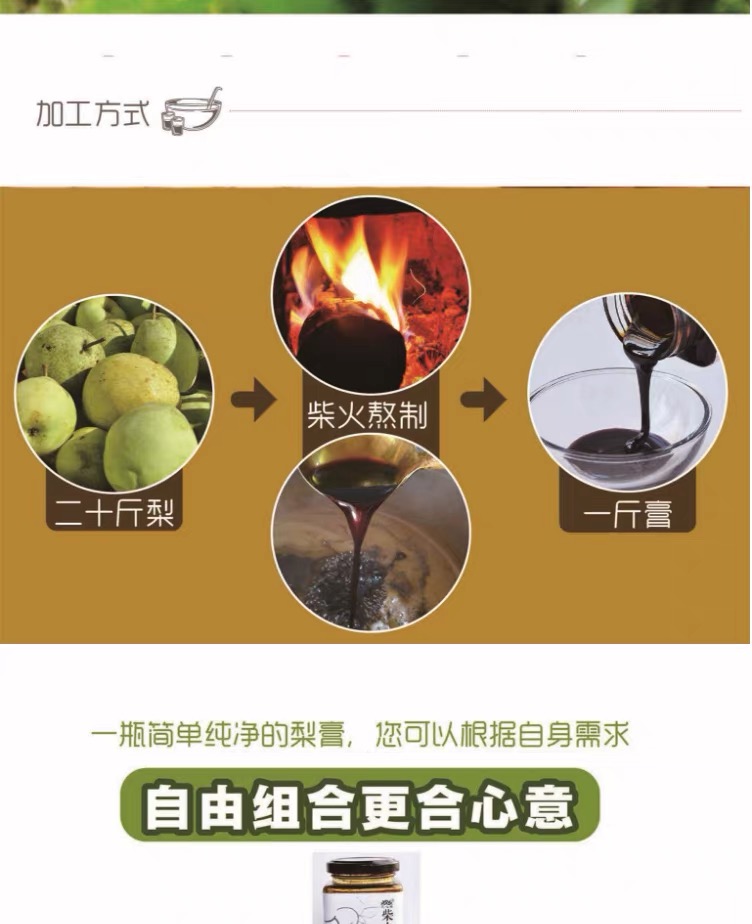 云南精选秋梨膏|选用本地特色“牛角乌”梨,自然农法种植 ,无农药无化肥不套袋,不加糖不加化学成分,十几个小时柴火熬制,从武火煮沸到文火抽筋,满满一锅梨汁方可得到薄薄一层梨膏,大自然是如此奇妙~