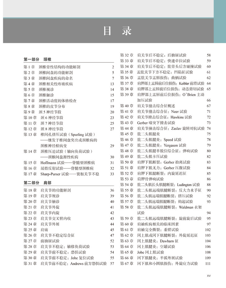 每一章都遵循统一的编写体例,方便快速查阅:解剖,视诊,触诊,运动范围,最后是相关的特殊查体试验。