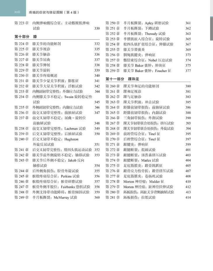 第4版新增30多个新章节,包括:脊髓型颈椎病的屈指反射试验,肩胛部上盂唇前后位损伤的Keibler前滑试验,肱二头肌卡压试验,桡骨茎突狭窄性腱鞘炎的拇指栓系试验,耻骨骨炎综合征的直压弹簧试验,臀中肌撕裂的髋关节滞后试验,梨状肌综合征的Beatty试验,膝关节Baker囊肿的Foucher征,等等。