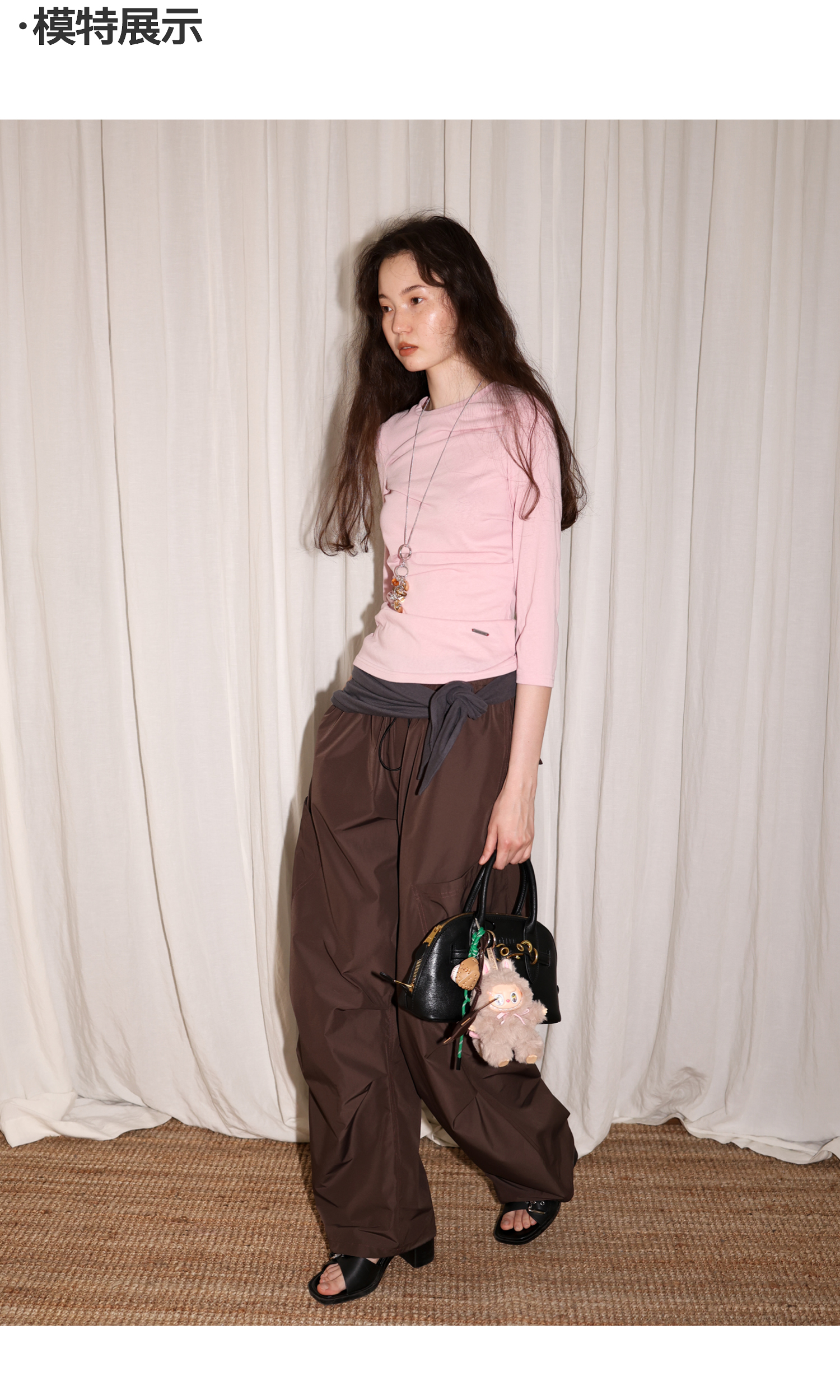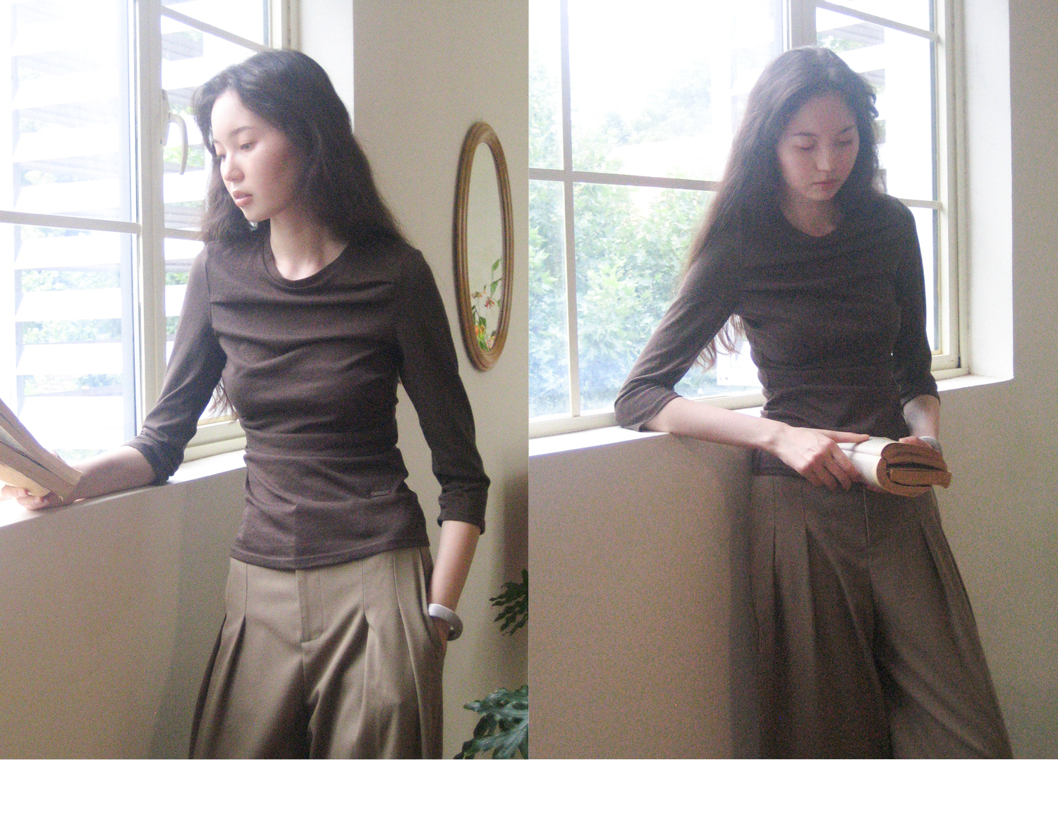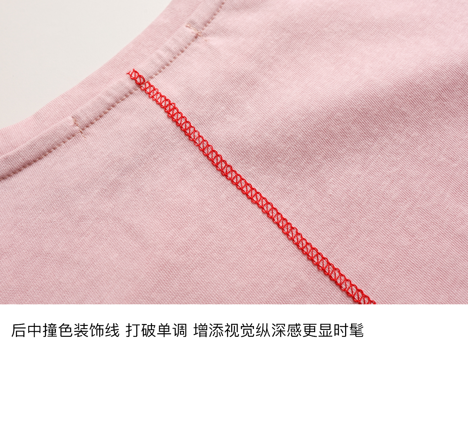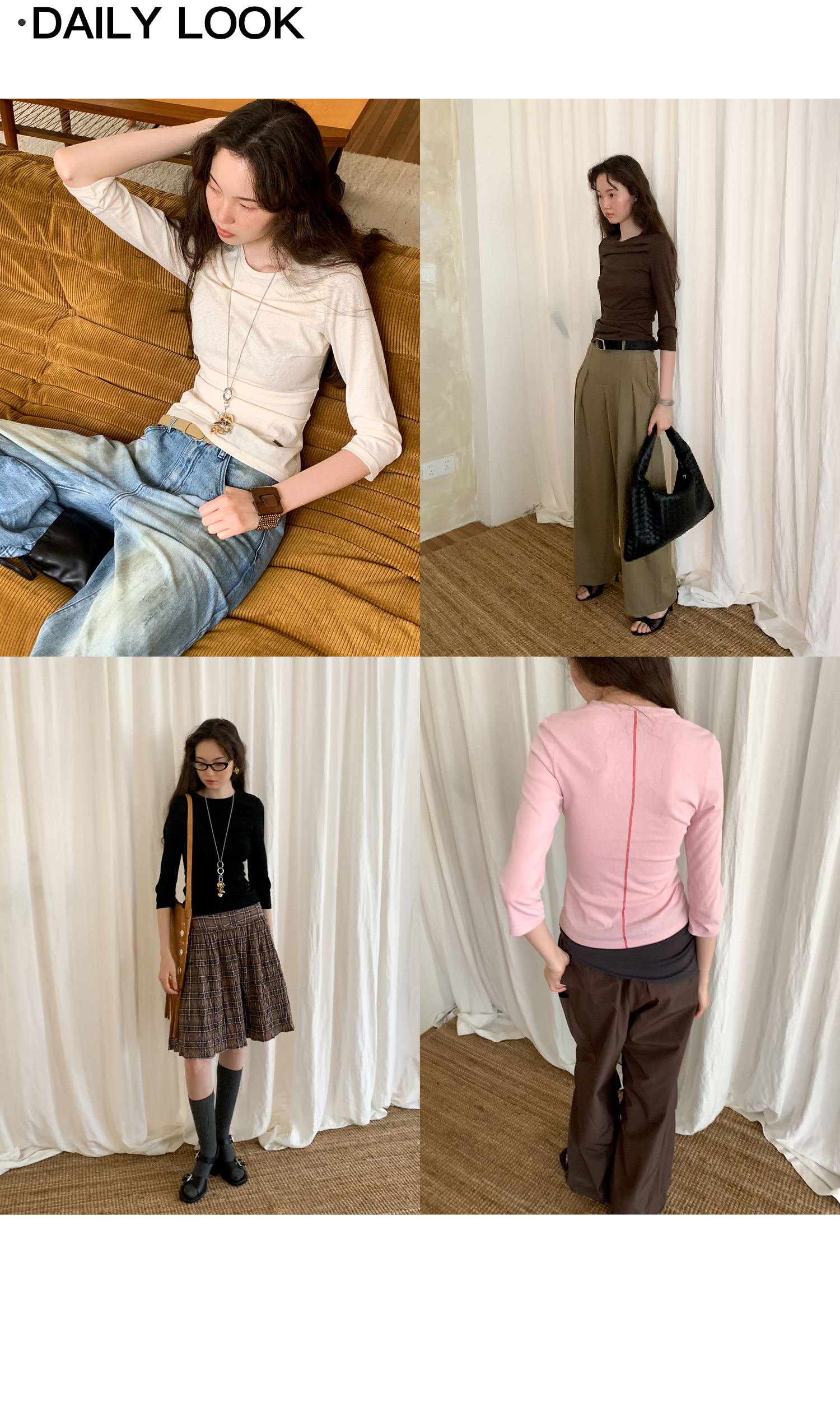 【8/6新品】素舶四季舒适棉感圆领竹节棉褶皱撞色装饰线七分袖T恤