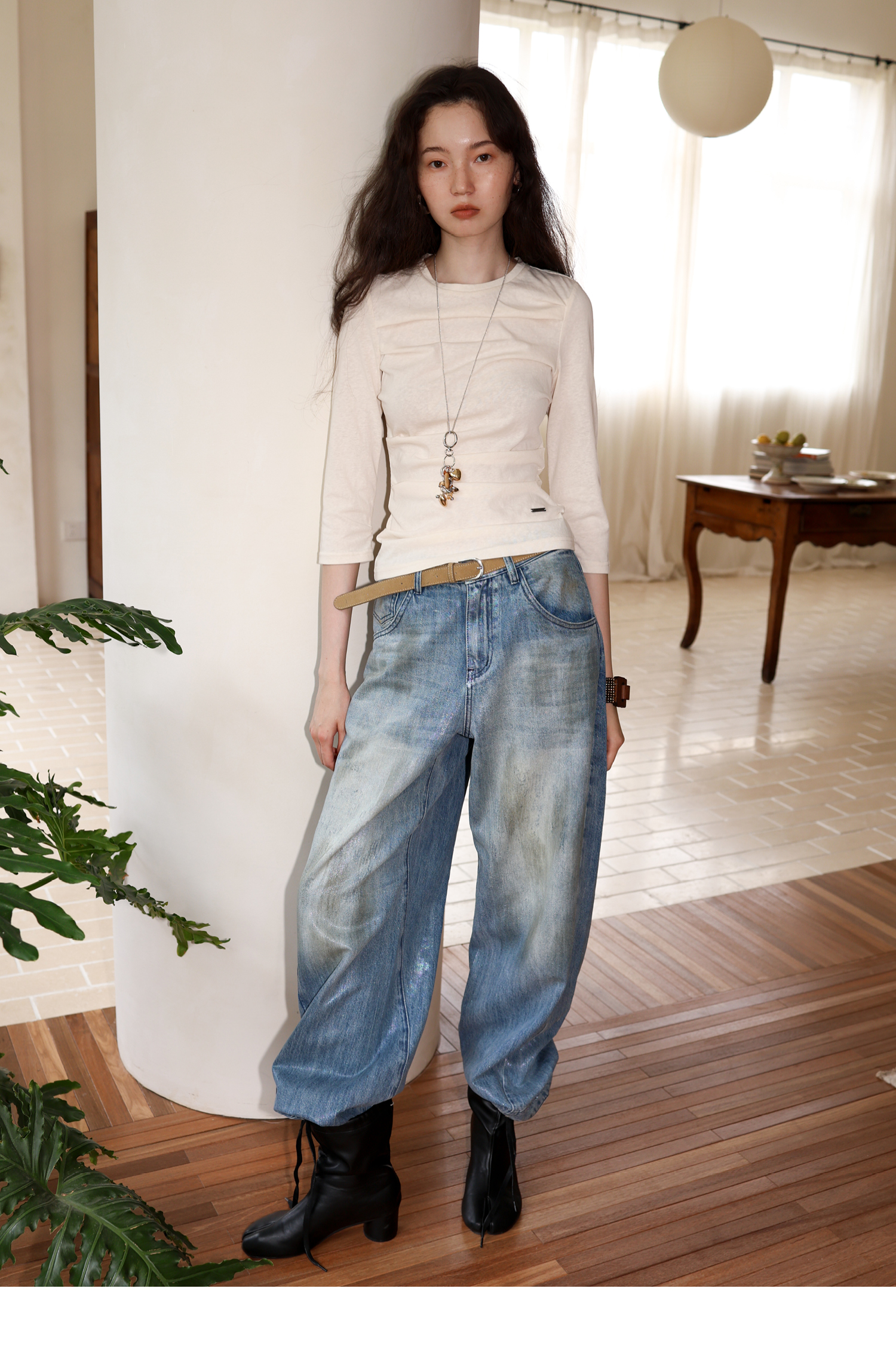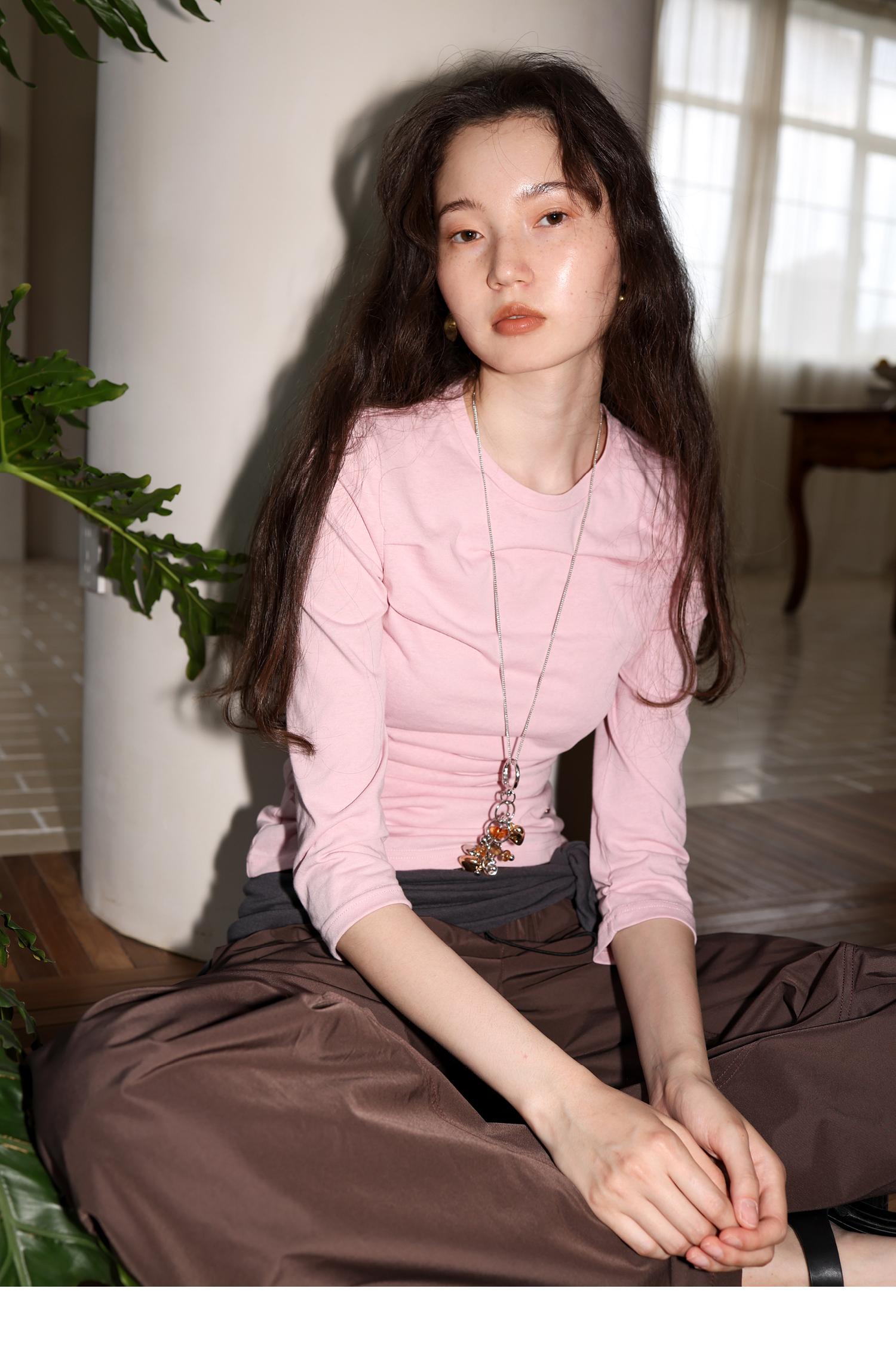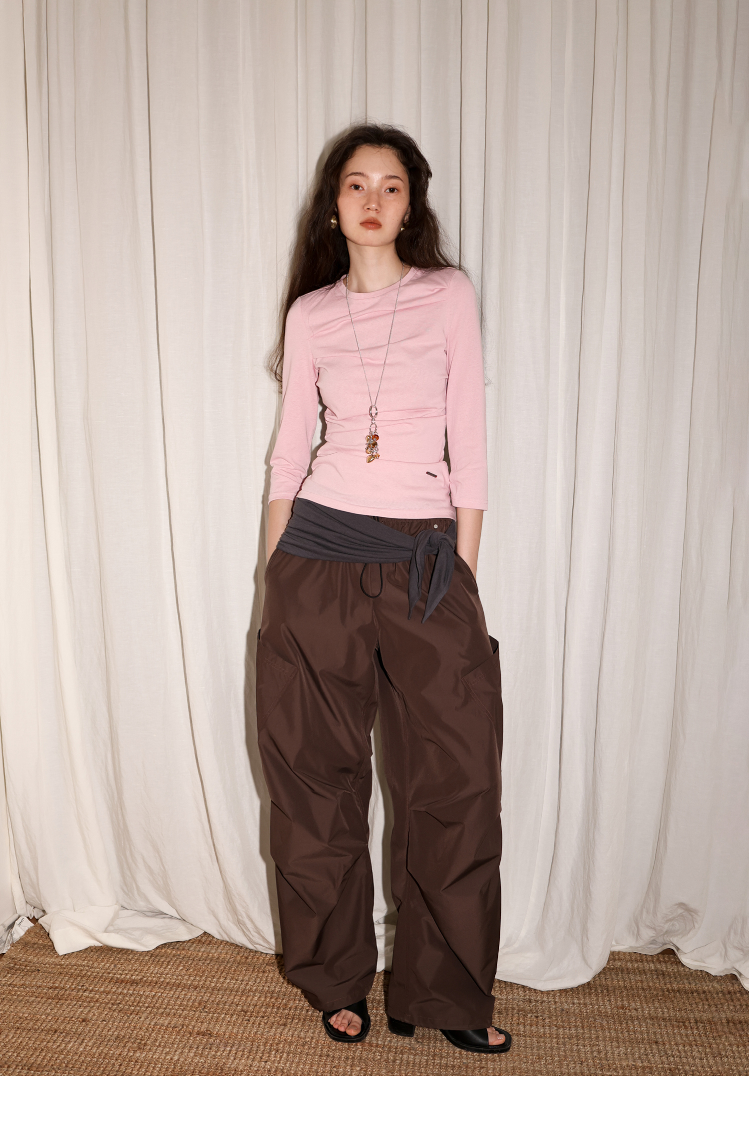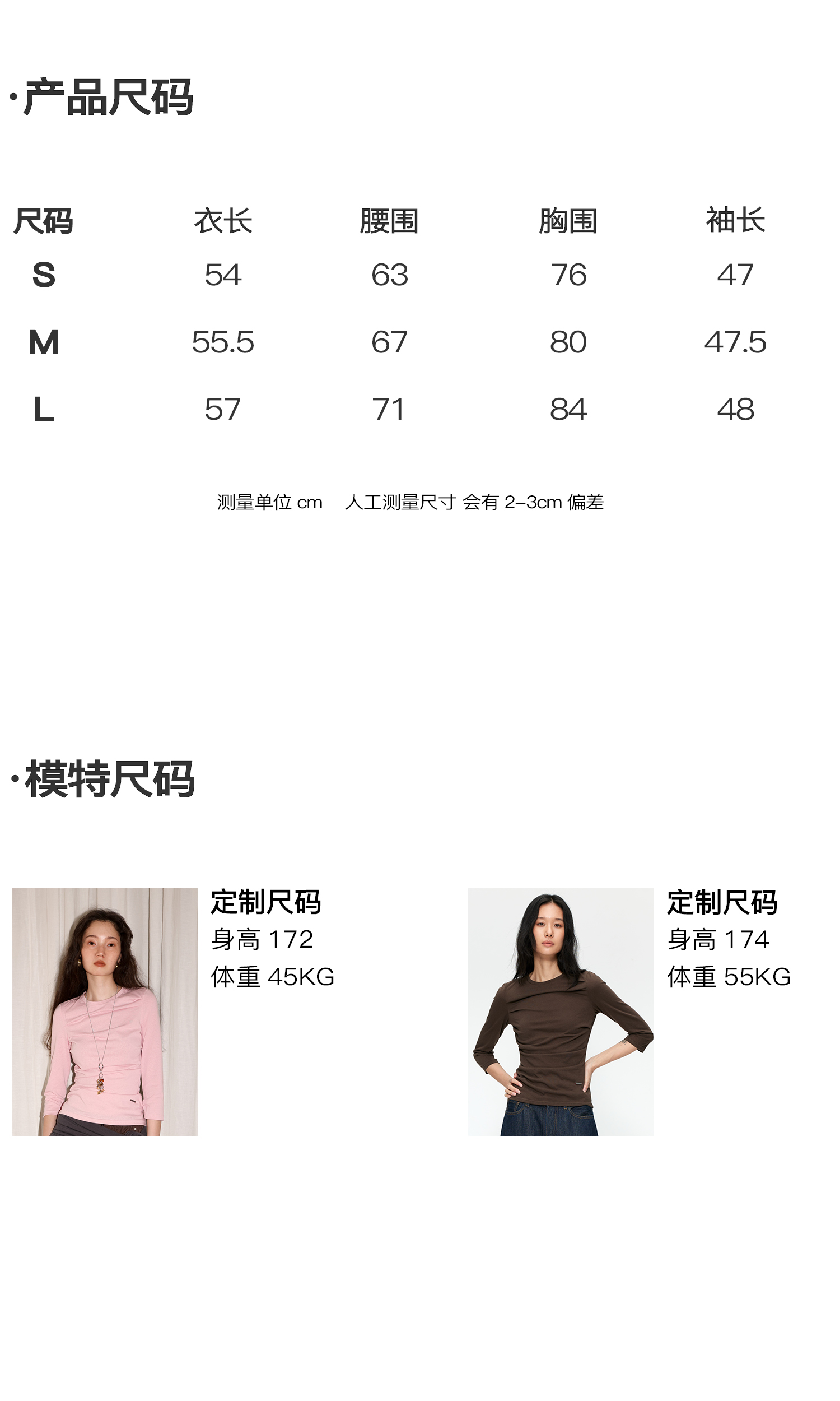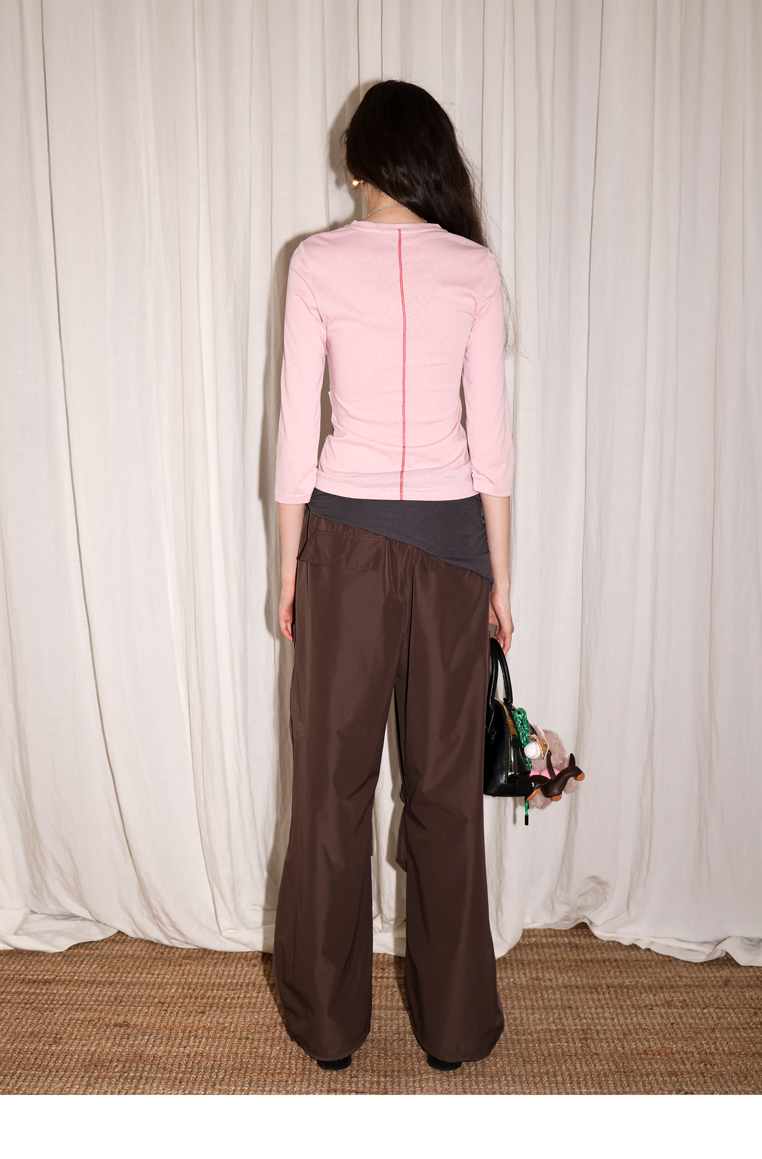 【8/6新品】素舶四季舒适棉感圆领竹节棉褶皱撞色装饰线七分袖T恤