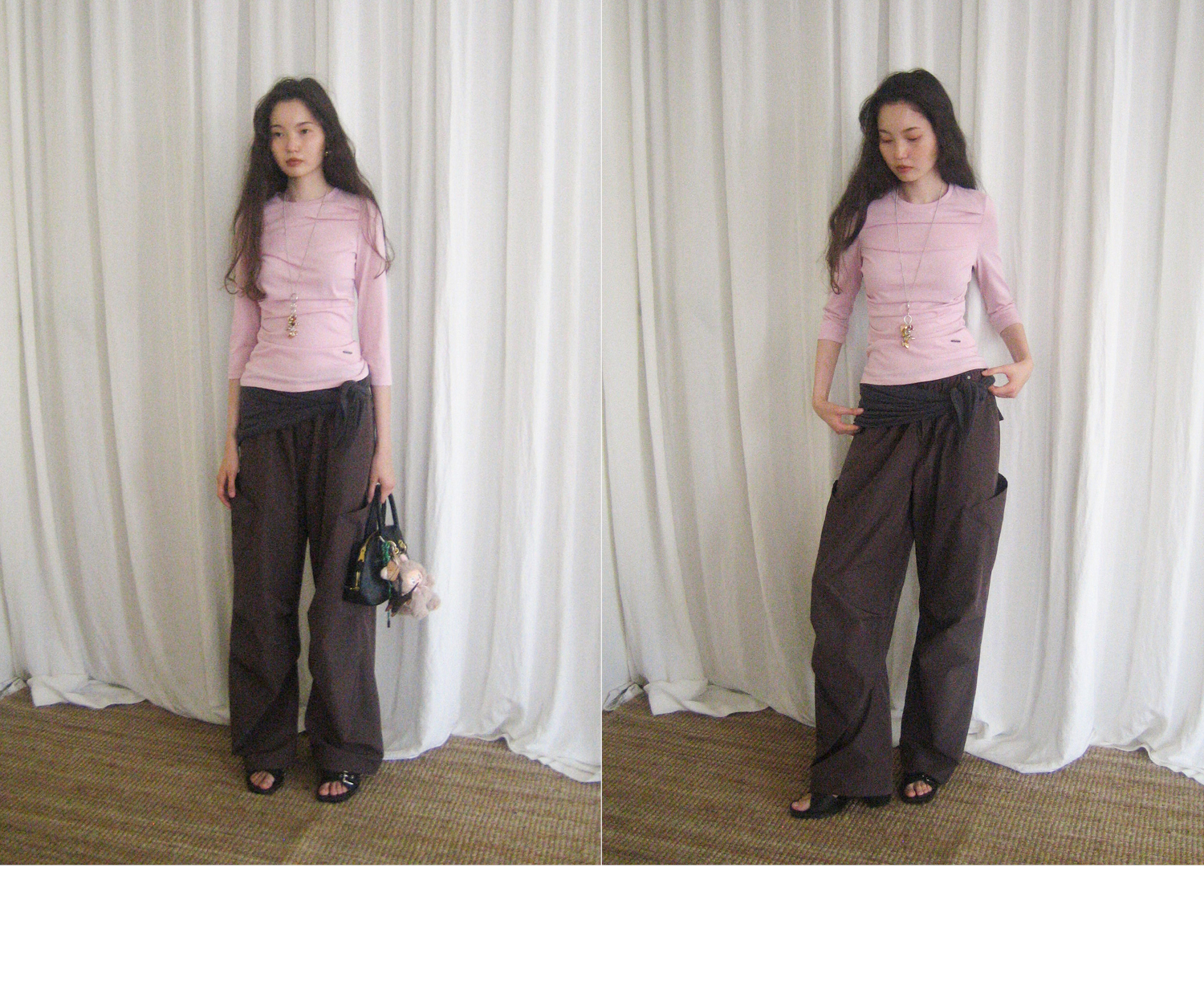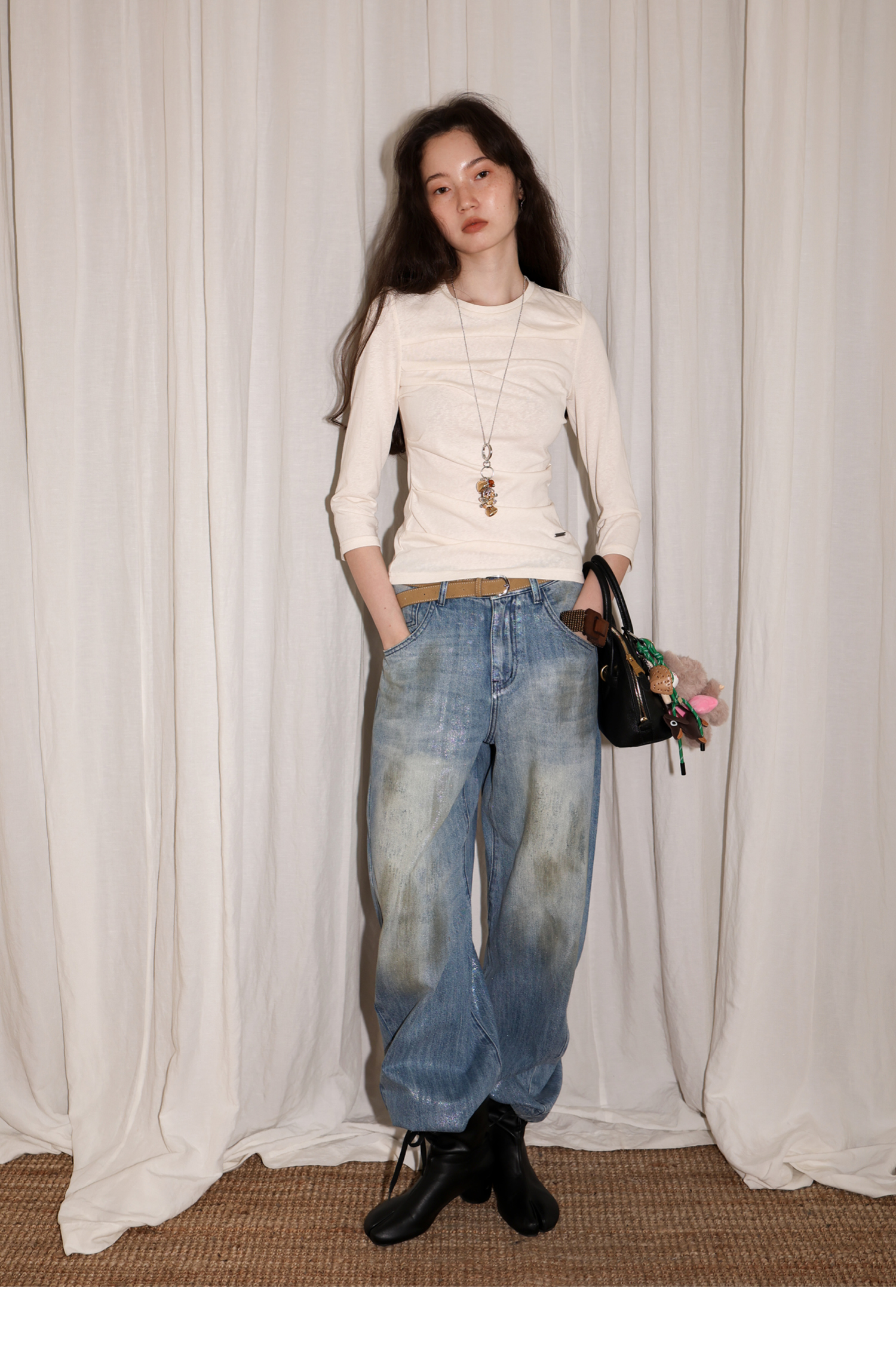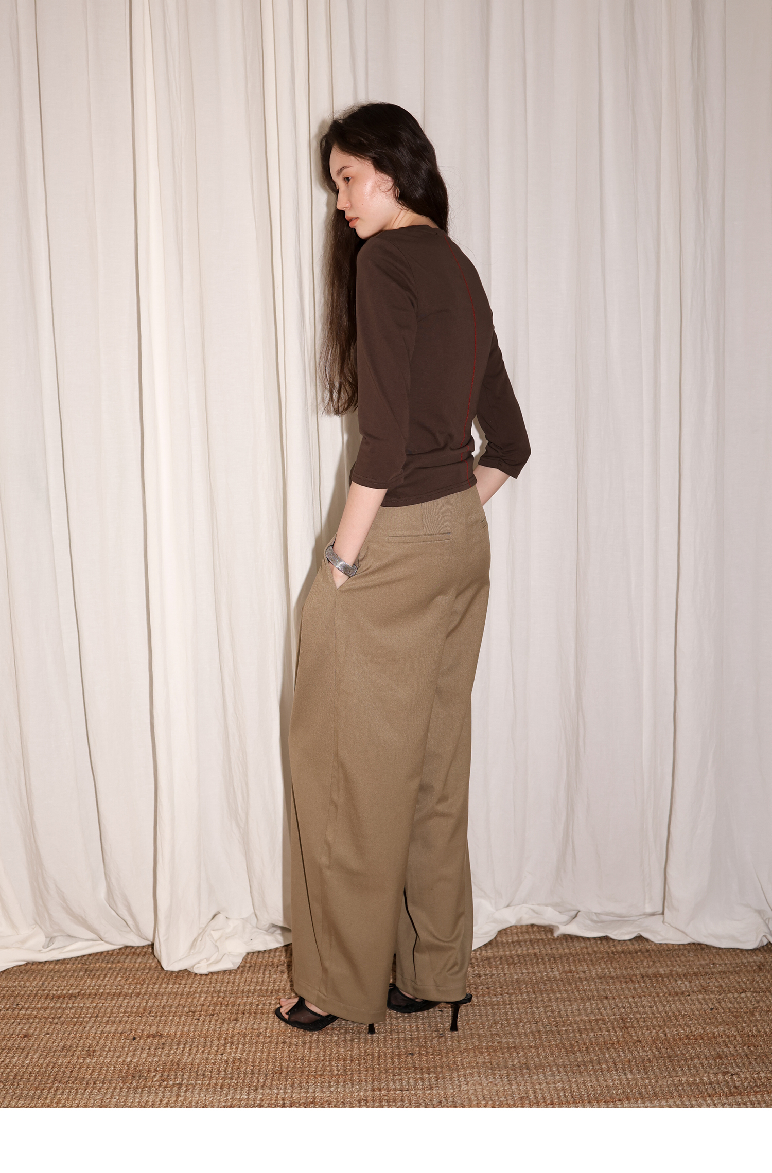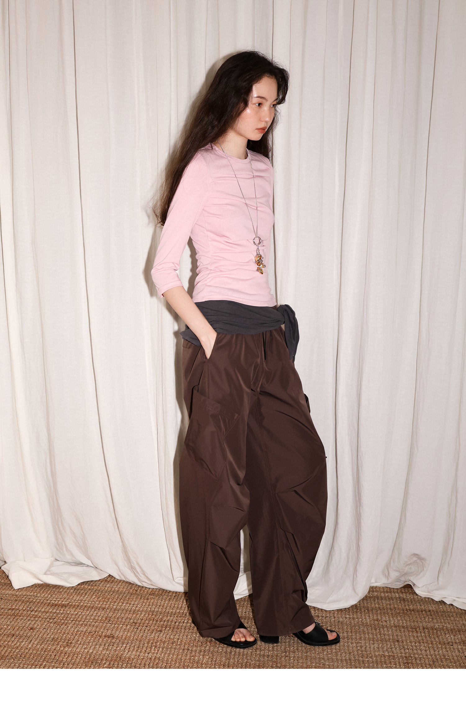 【8/6新品】素舶四季舒适棉感圆领竹节棉褶皱撞色装饰线七分袖T恤