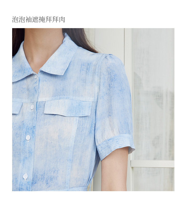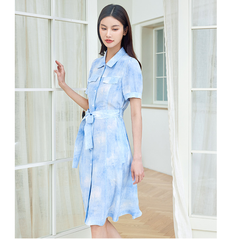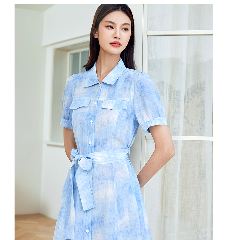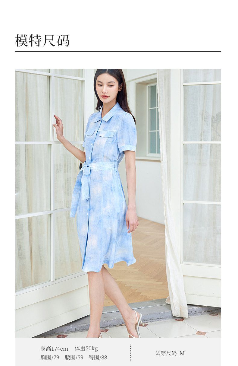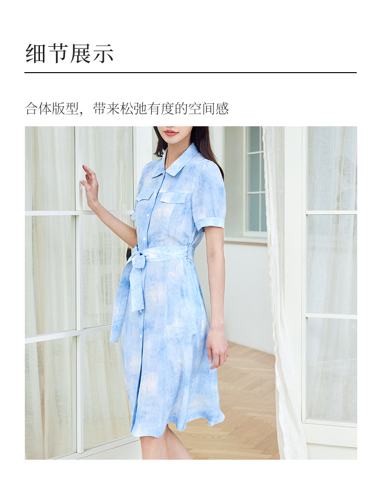 玳莎印花真丝连衣裙2024年夏季新款清新时尚系带收腰中长款衬衫裙 EB35108