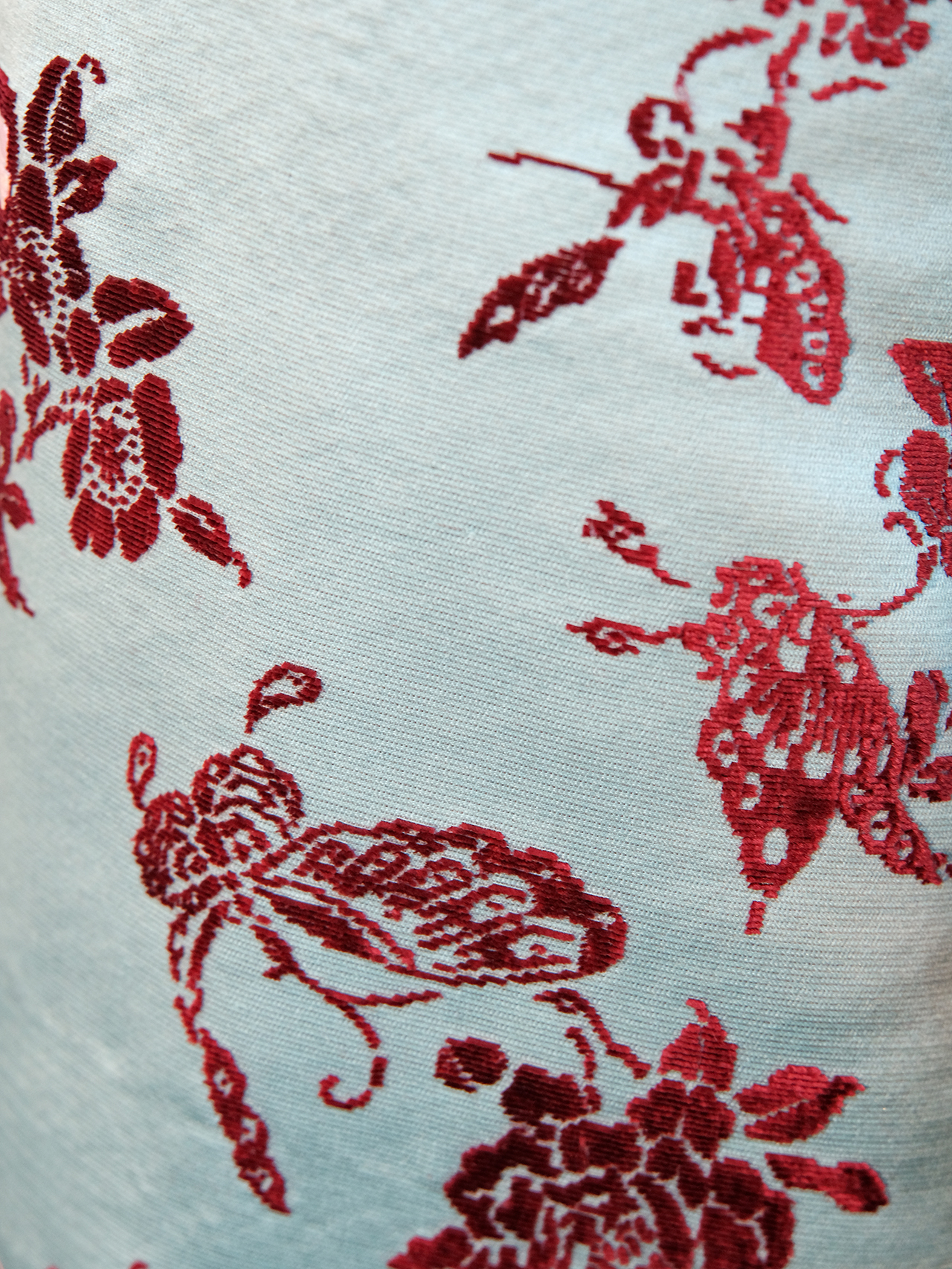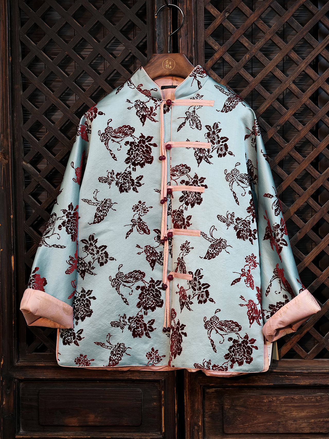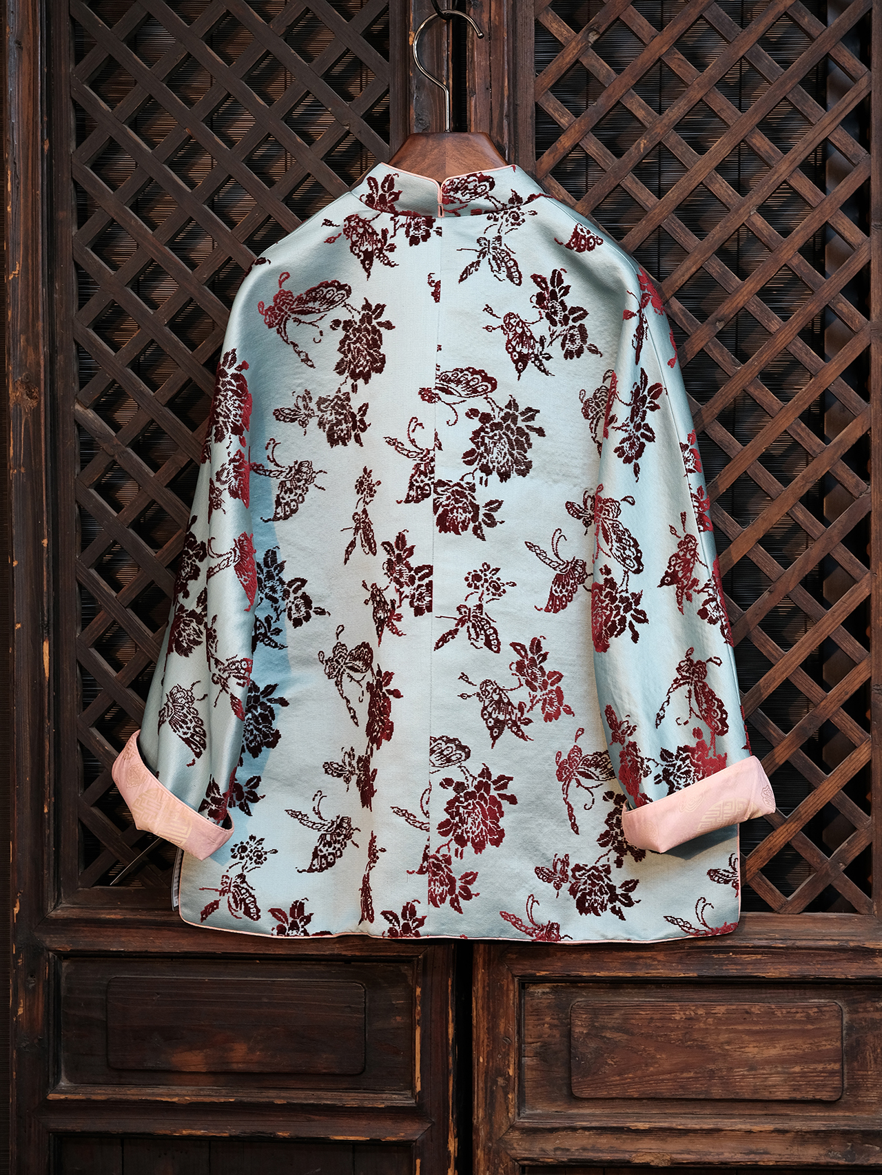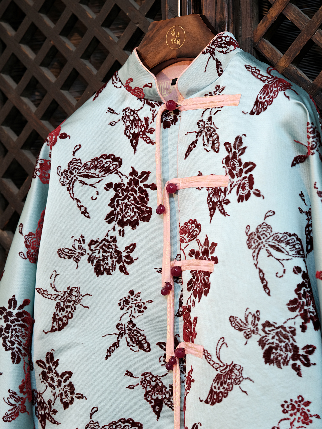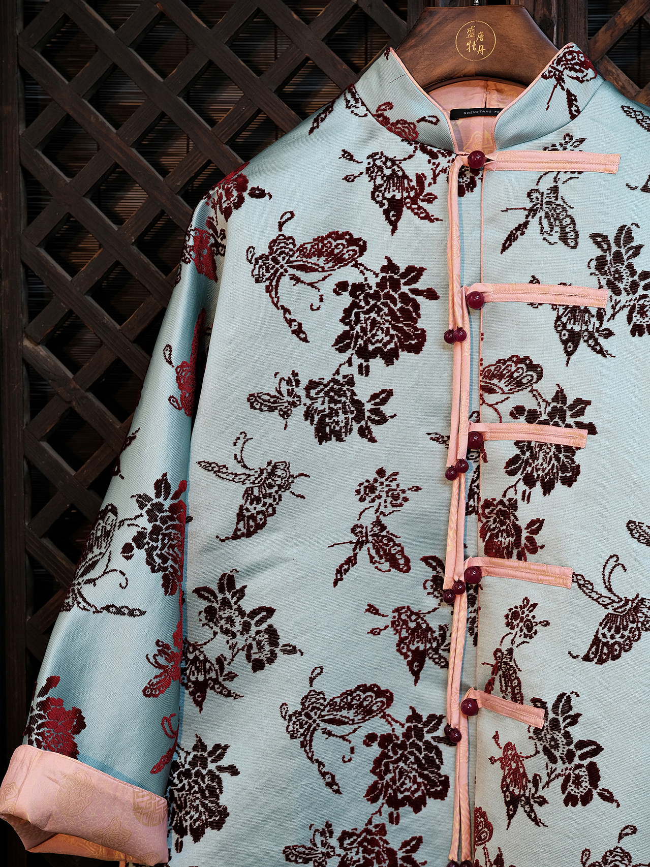 盛唐牡丹|湖水蓝底色漳缎蝶恋花外套