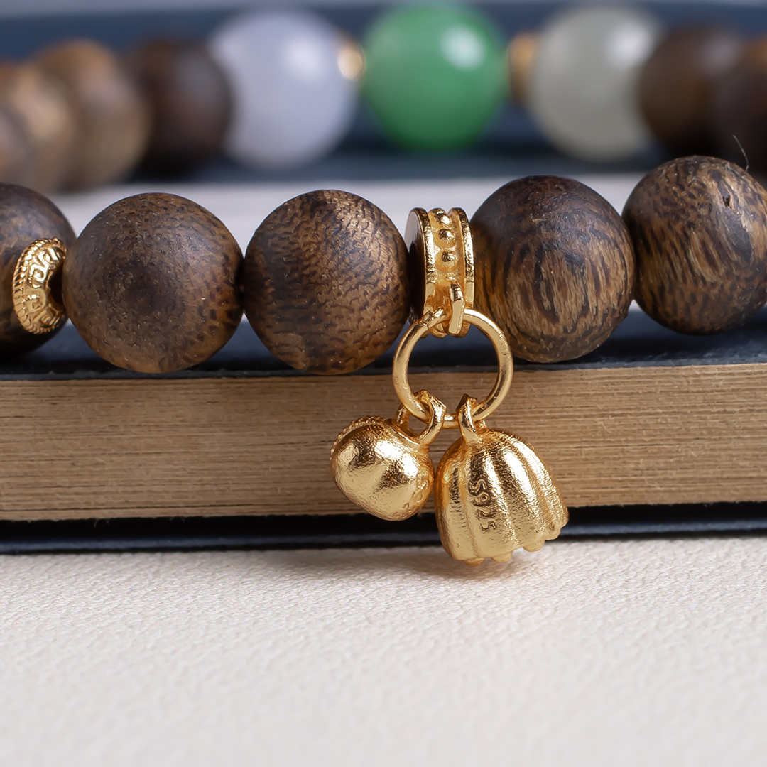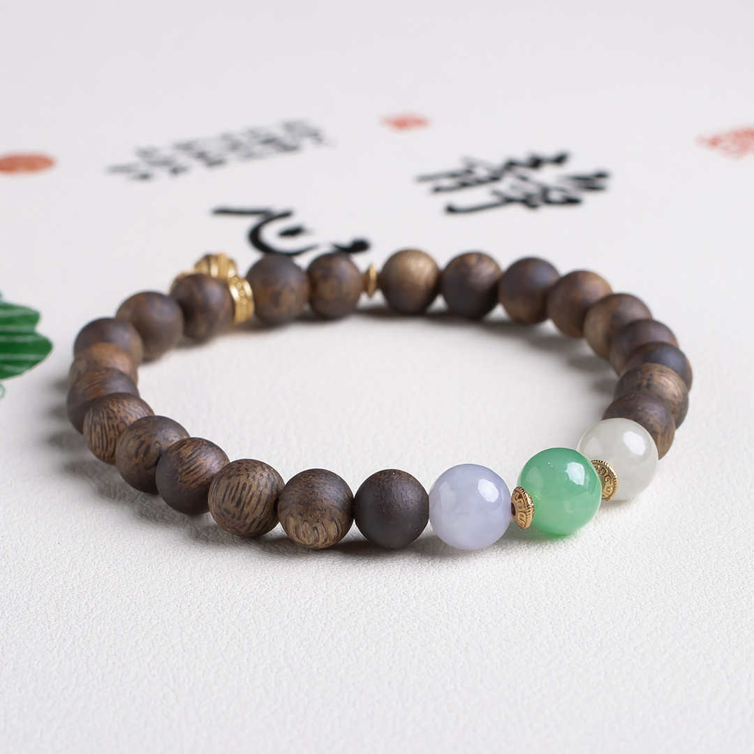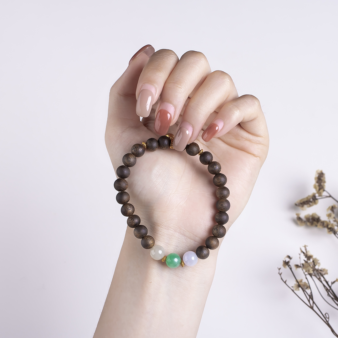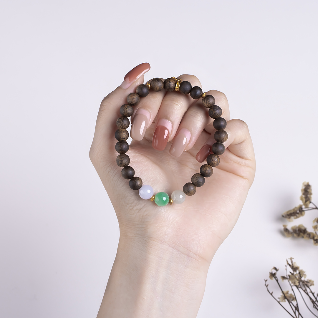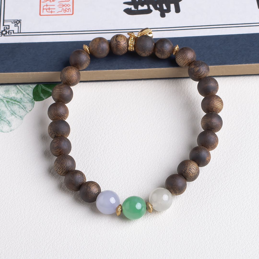 xy0449沉香+翡翠三宝手串.银,天然沉香约7.3mm,原色原味,香味自然清甜,三颗冰底带色的翡翠,吉祥三宝,搭一枚莲蓬子,款式时尚典雅,上手百搭。