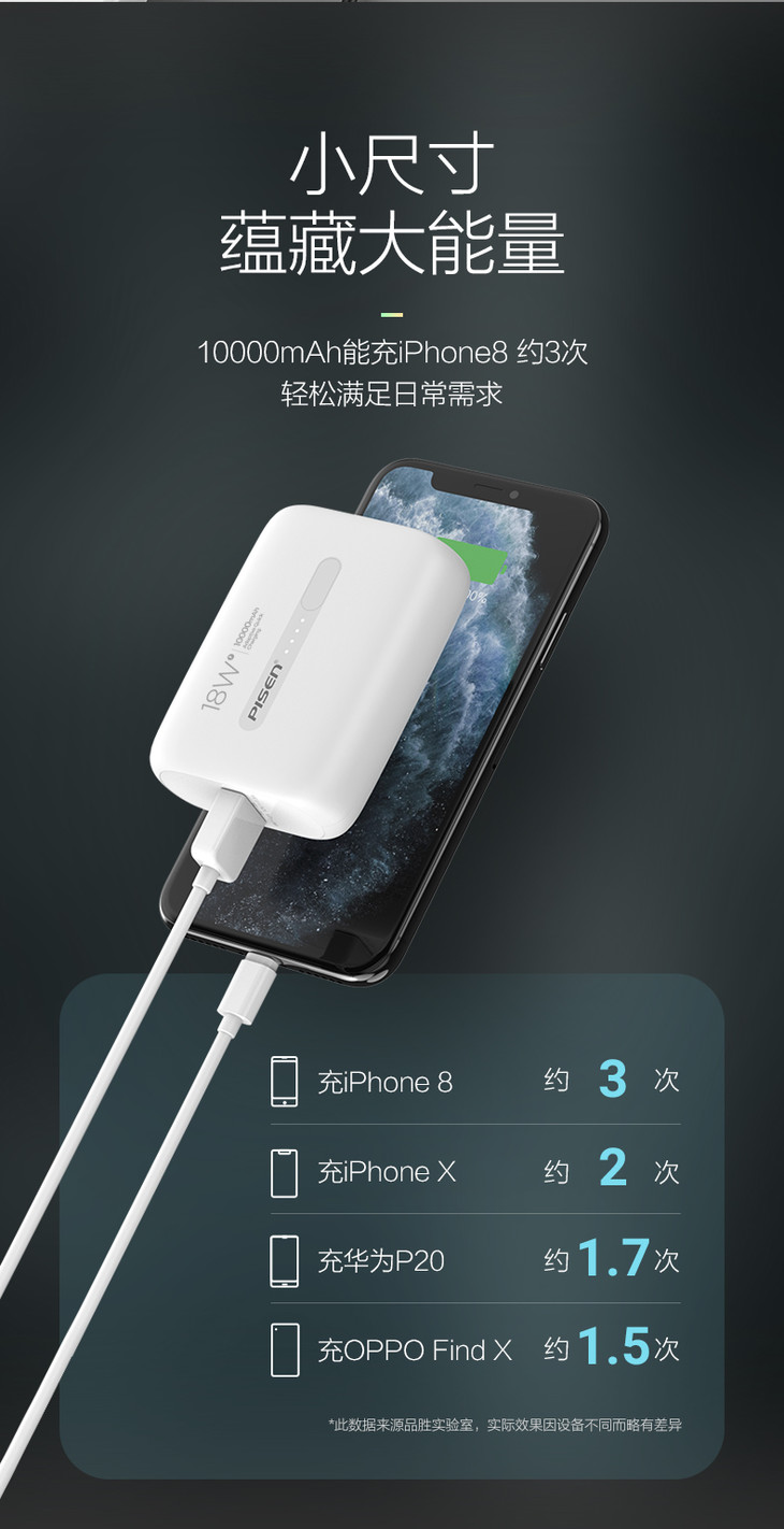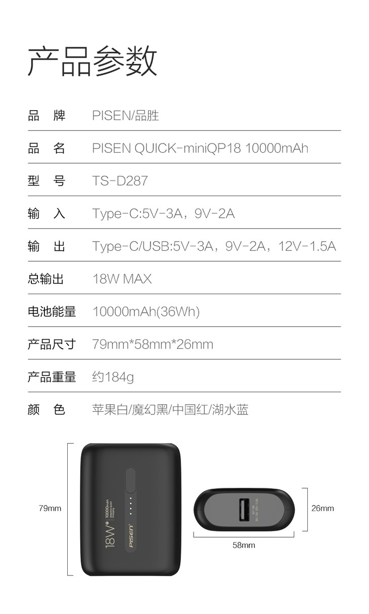 品胜 MiniQP18 迷你快充 10000毫安移动电源 Type-C双向充电 支持PD/QC18W快充协议 苹果华为小米闪充电宝