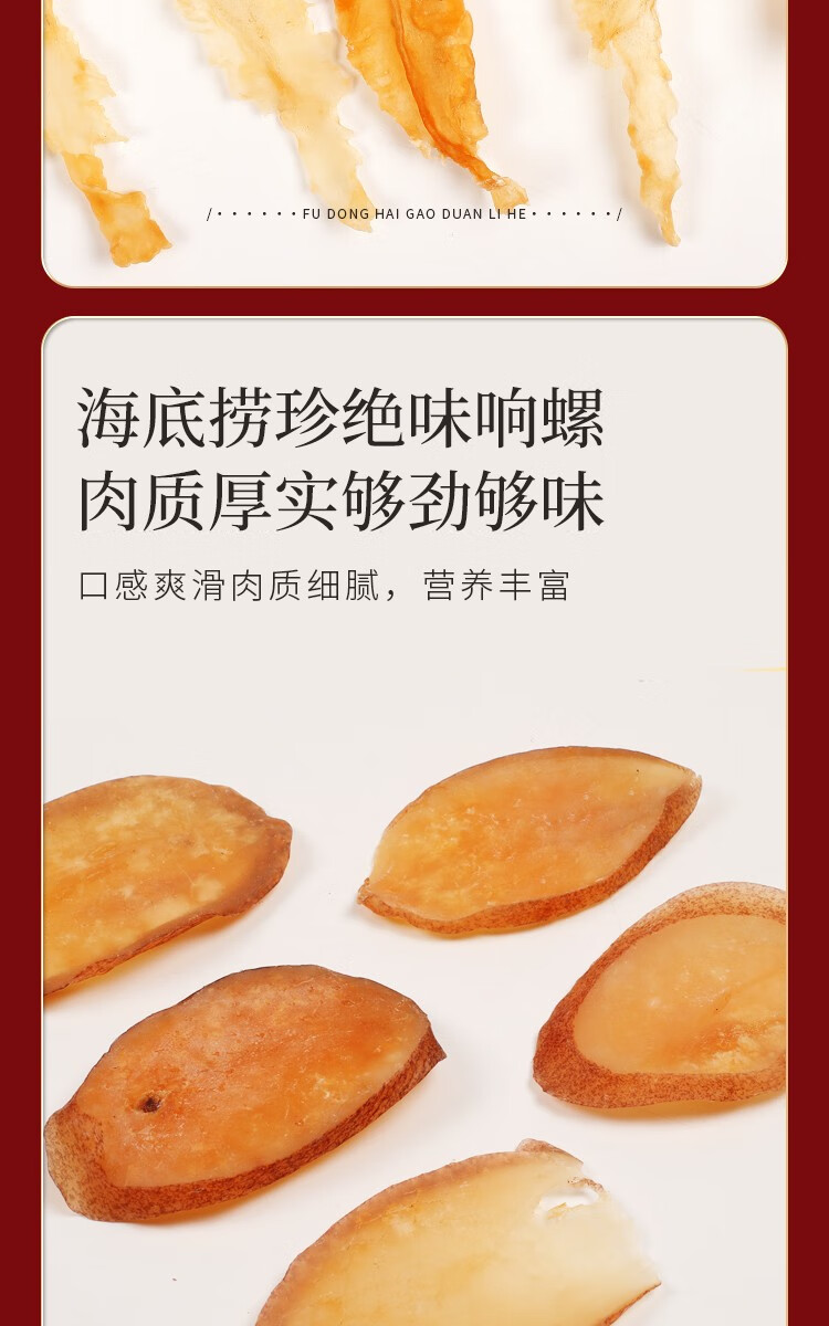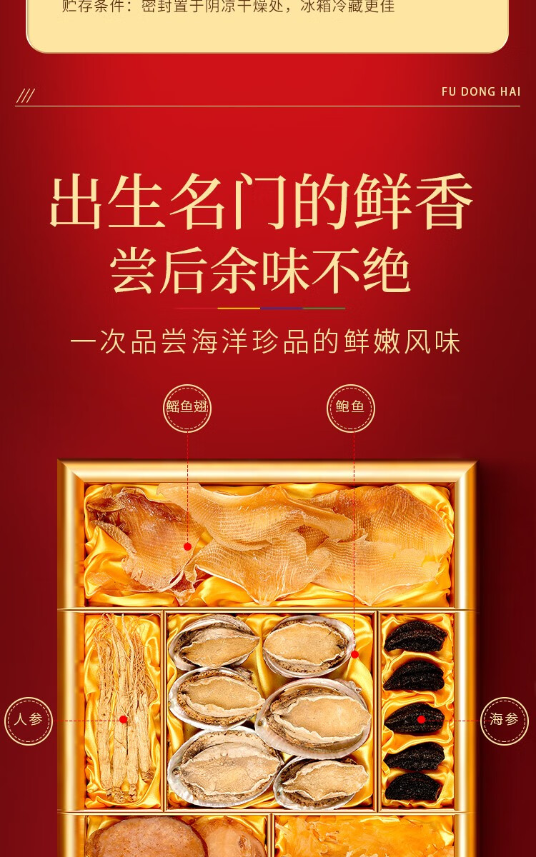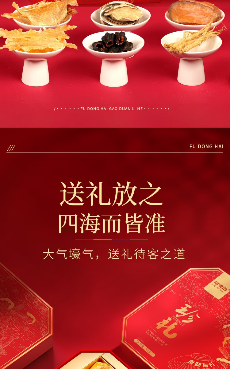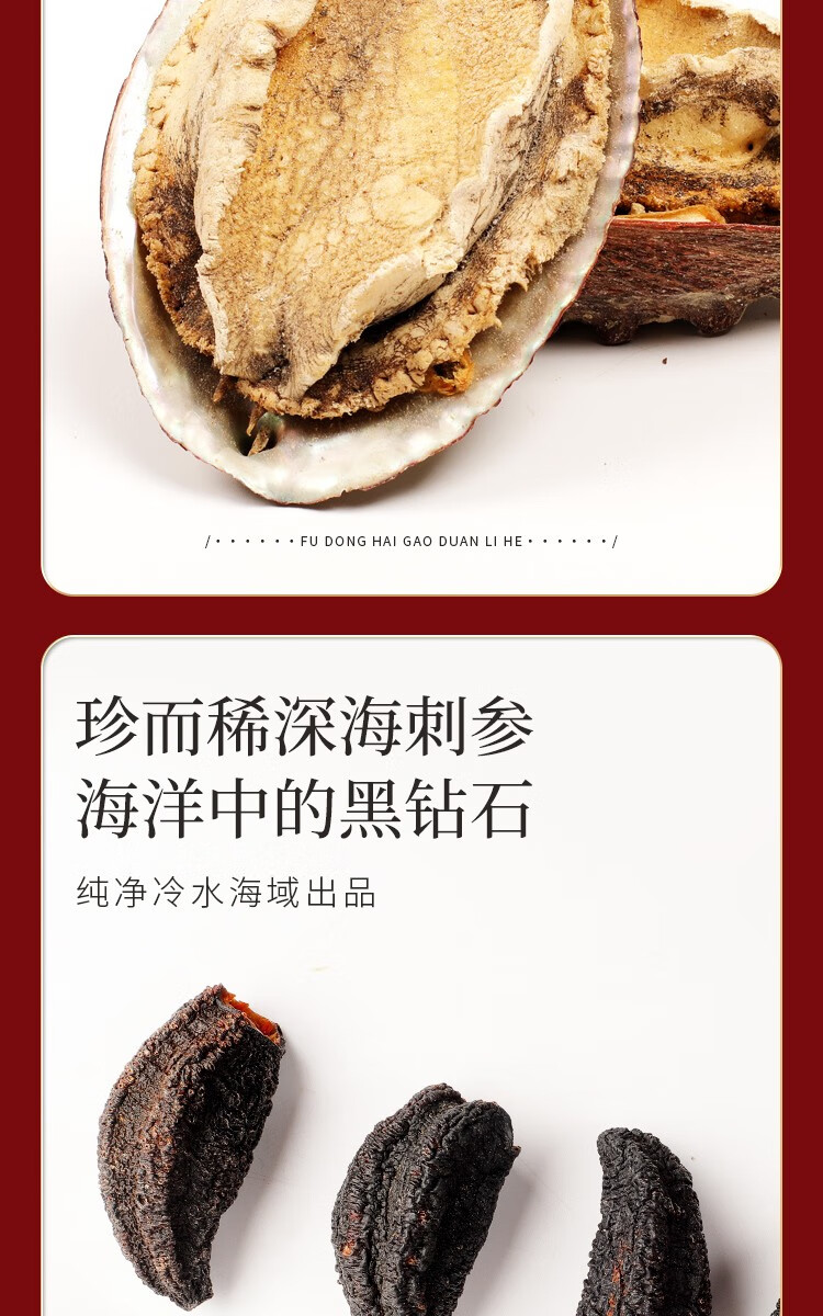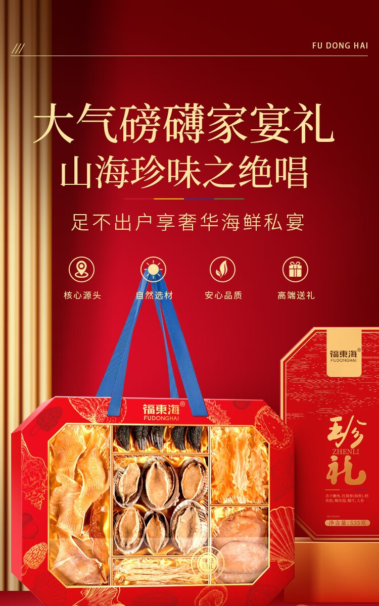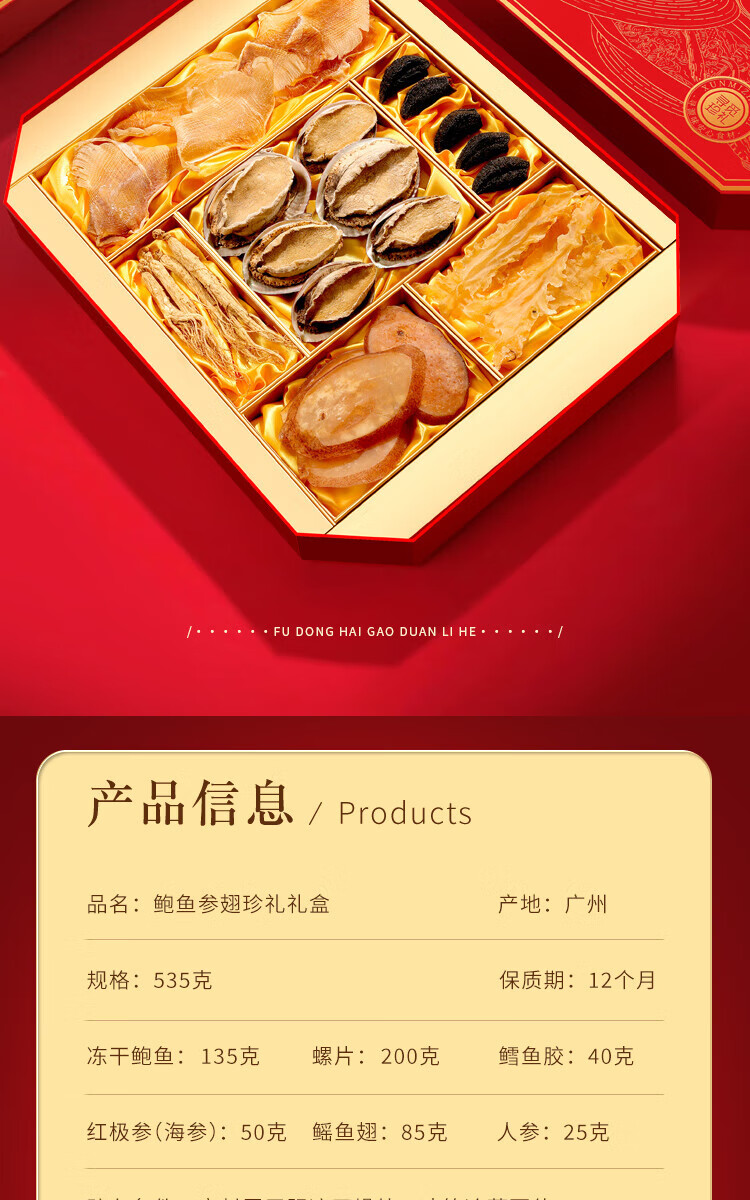 福东海 六拼珍礼礼盒-A 鲍鱼参翅-535克/礼盒 鲍鱼135克(带壳)+红极参50克+鳕鱼胶40克+鳐鱼翅85克+螺片200克+人参25克