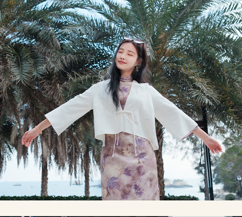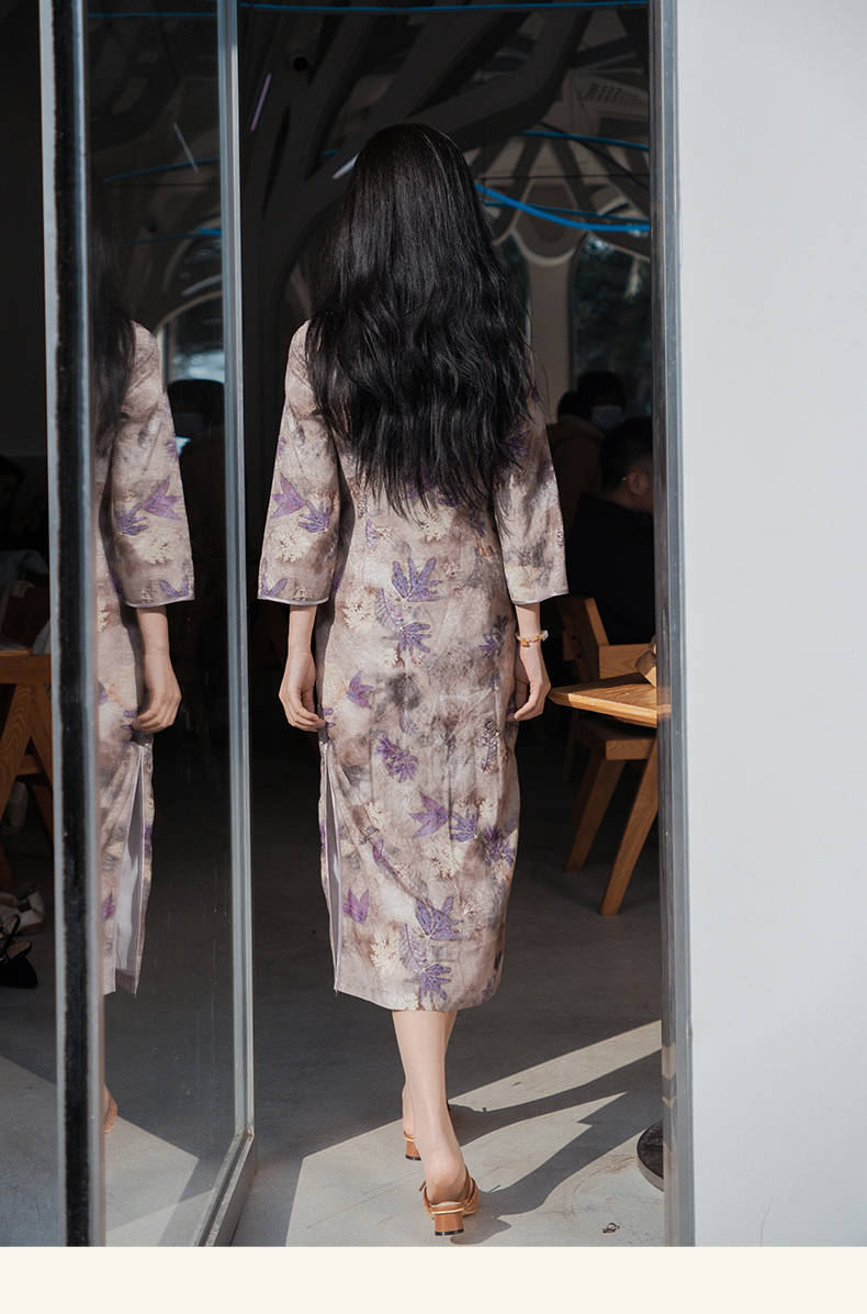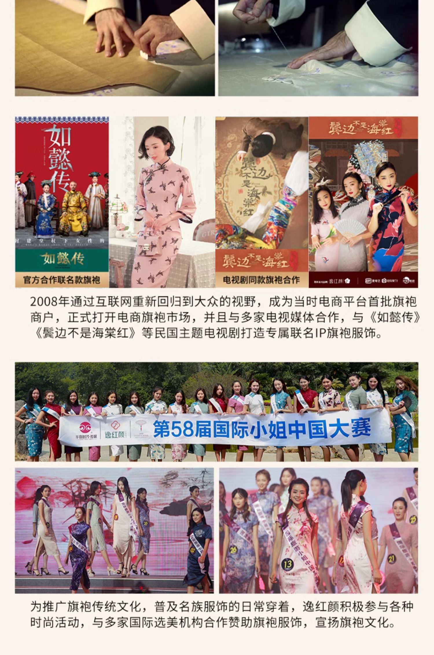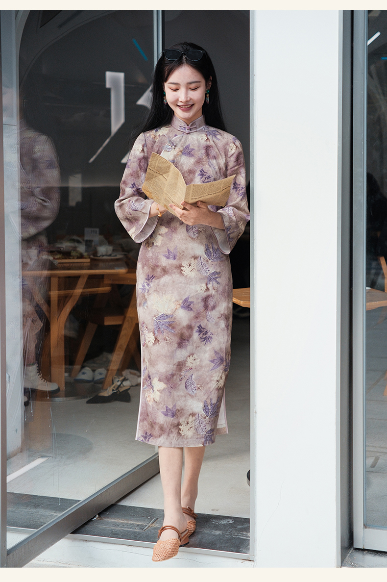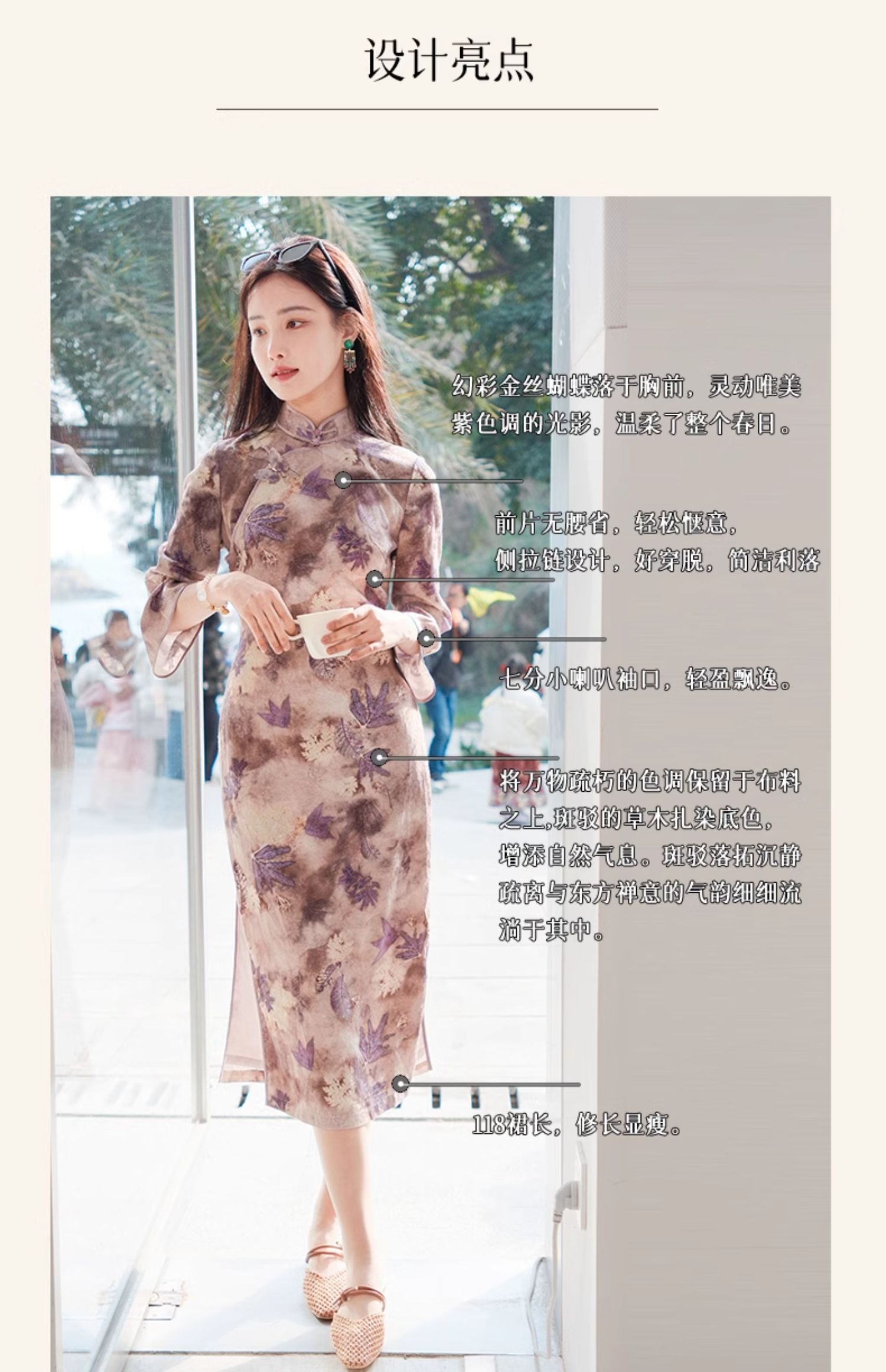 上海逸红颜叶芝2025夏季新款棉麻感提花微喇袖中长款旗袍连衣裙女