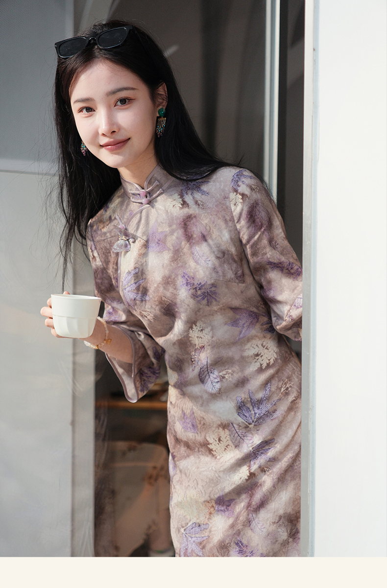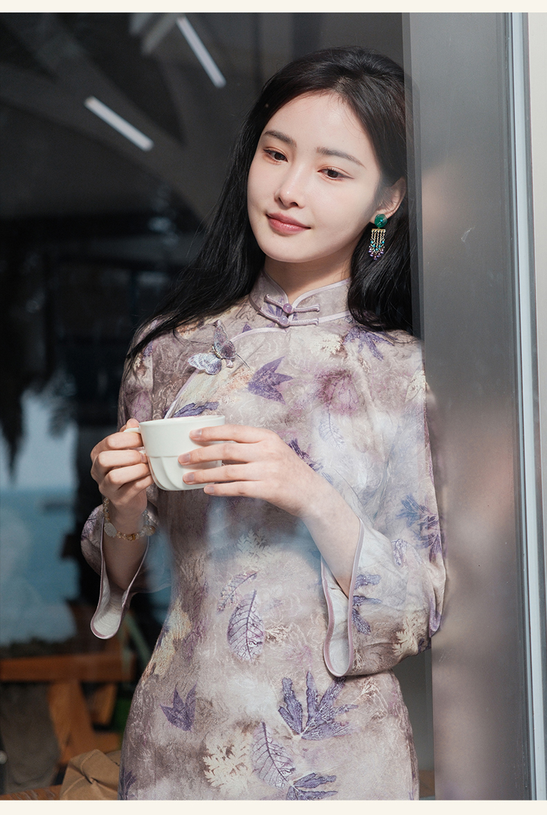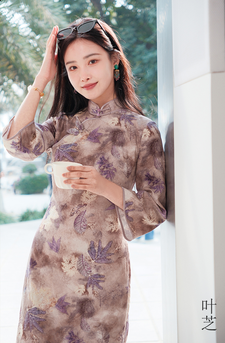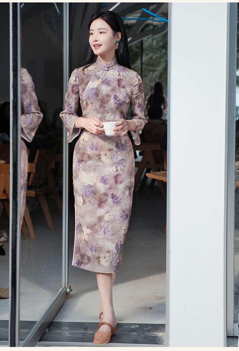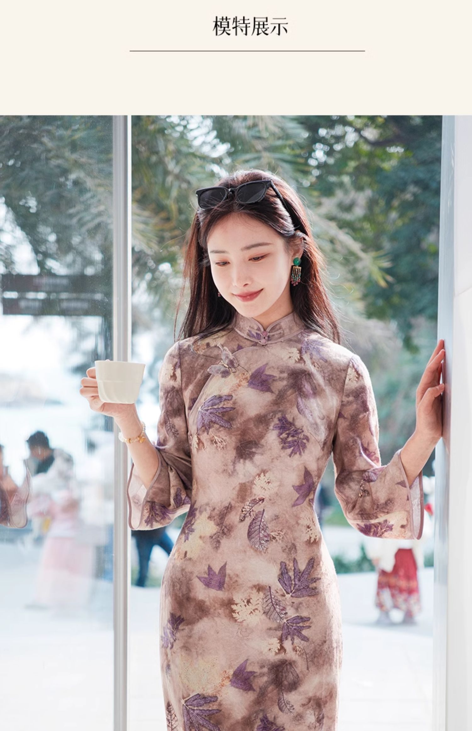 上海逸红颜叶芝2025夏季新款棉麻感提花微喇袖中长款旗袍连衣裙女