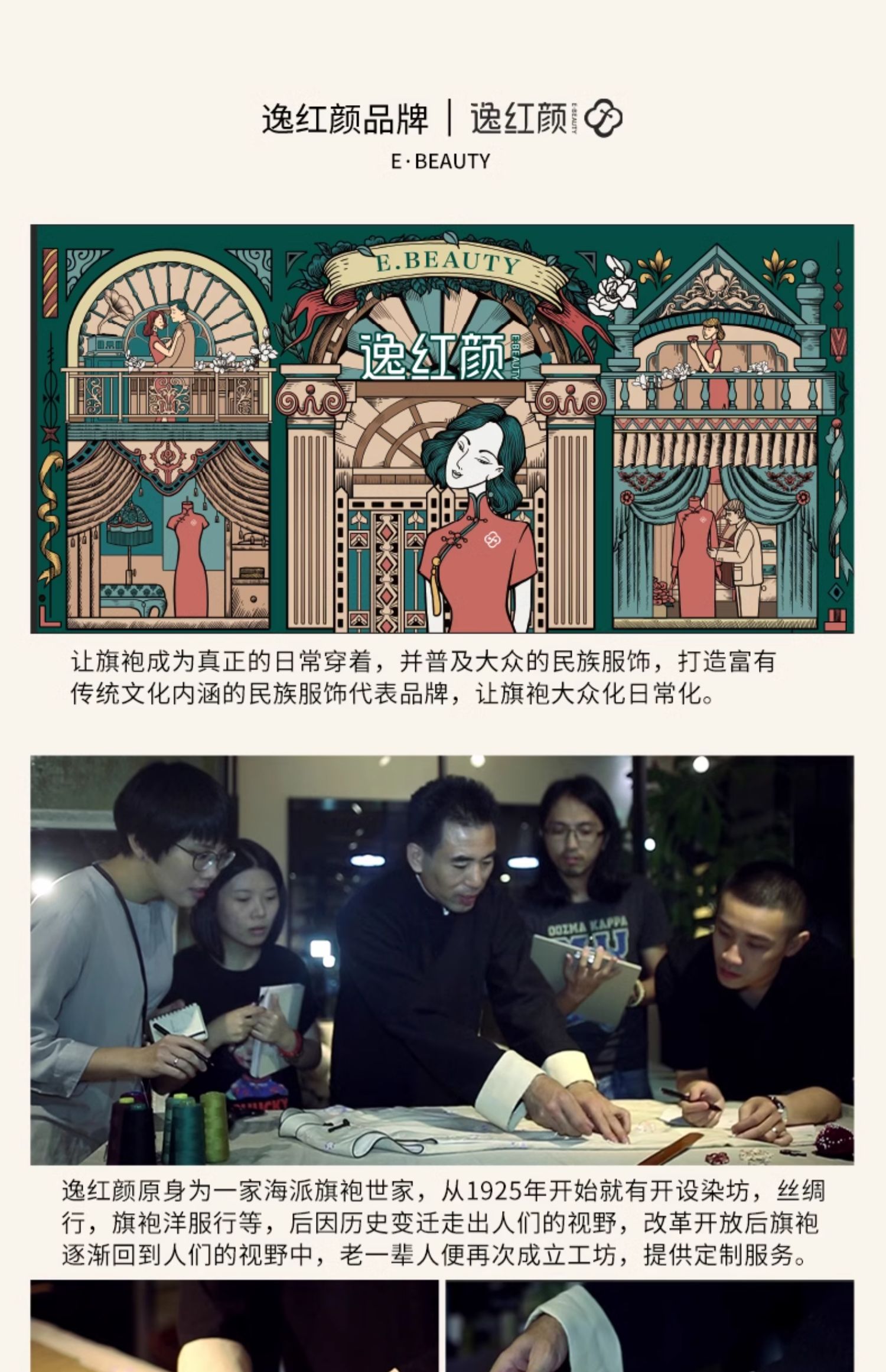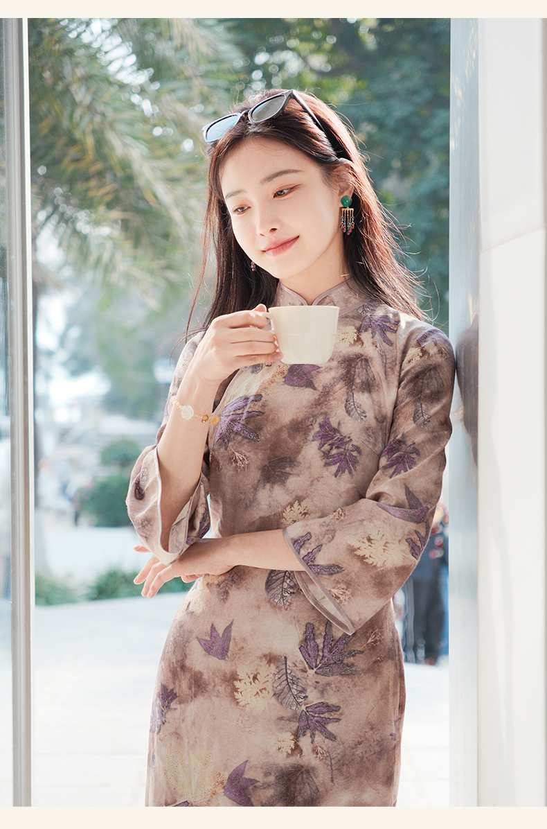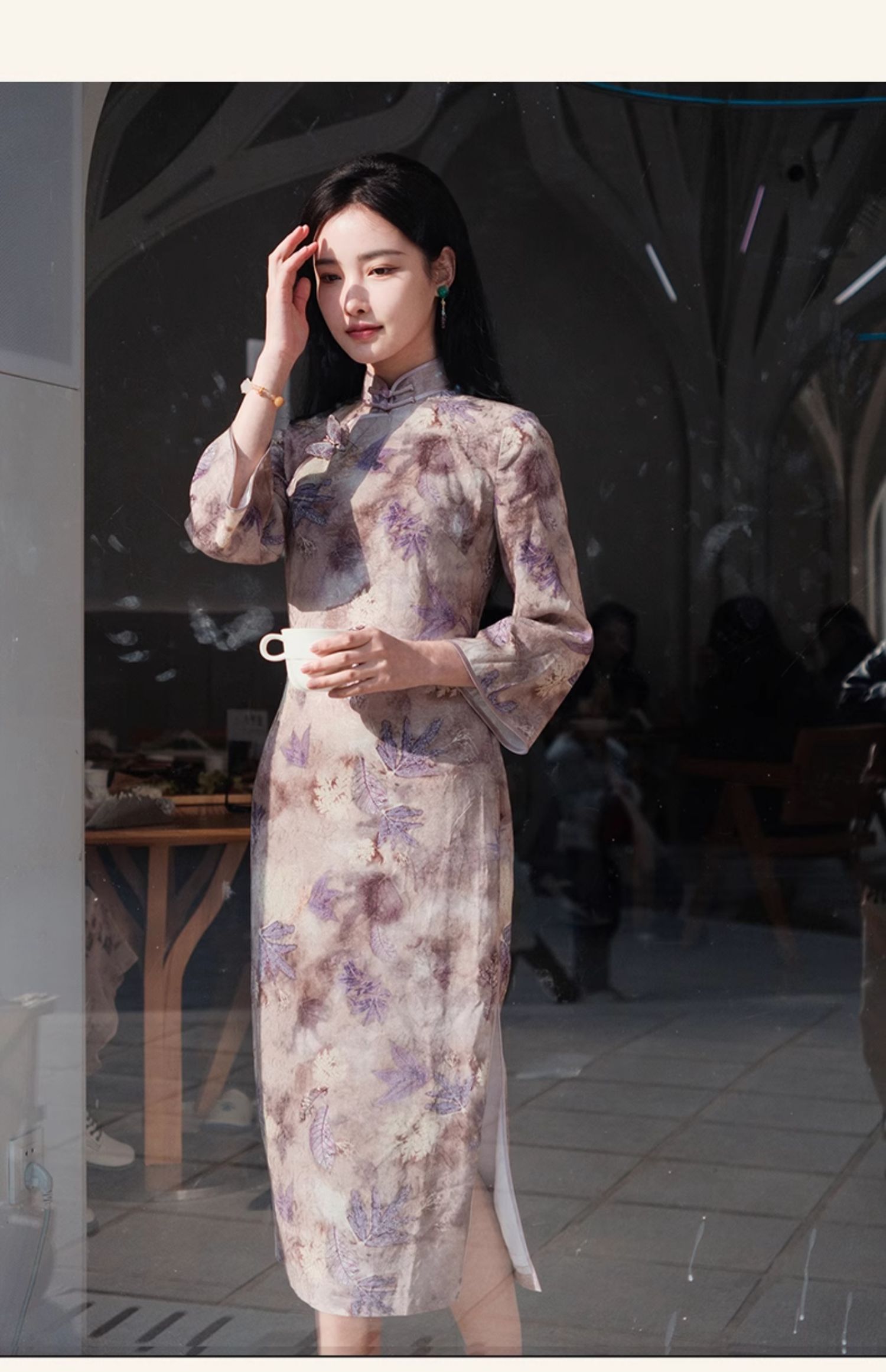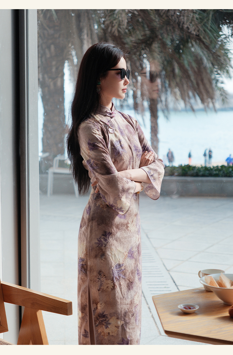 上海逸红颜叶芝2025夏季新款棉麻感提花微喇袖中长款旗袍连衣裙女