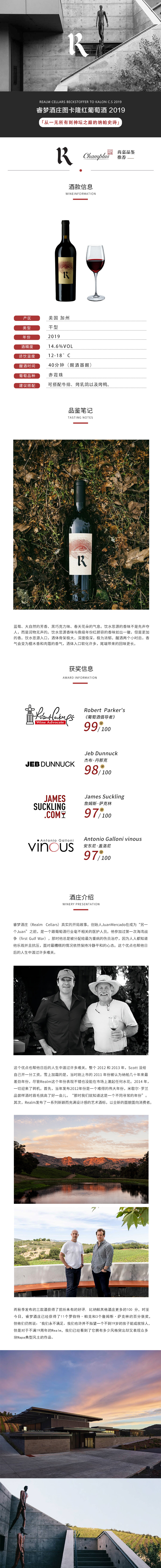 睿梦酒庄图卡隆干红葡萄酒2019年 Realm Cellars Beckstoffer To Kalon C.S2019