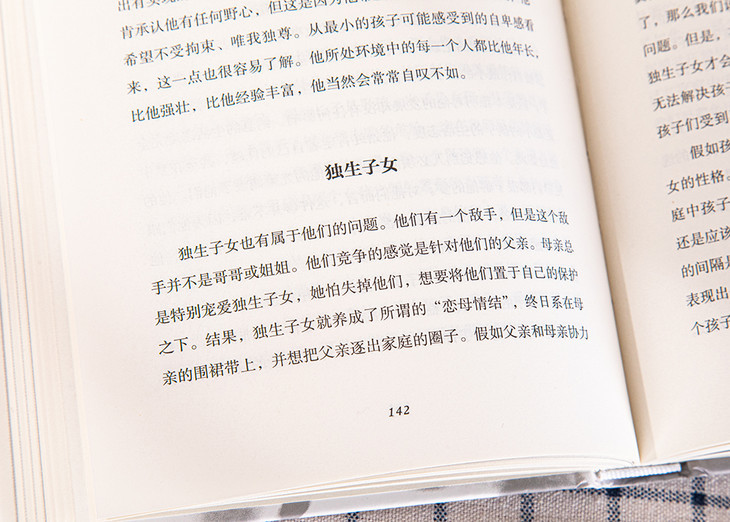 “独生子女也有属于他们的问题。他们有一个敌手,但这个敌手并不是哥哥或姐姐。他们竞争的感觉是针对他们的父亲。母亲总是特别宠爱独生子女,她怕失掉他们,想要将他们置于自己的保护之下。结果,独生子女就养成了所谓的“恋母情结”,终日系在母亲的围裙带上,并想把父亲逐出家庭的圈子。”