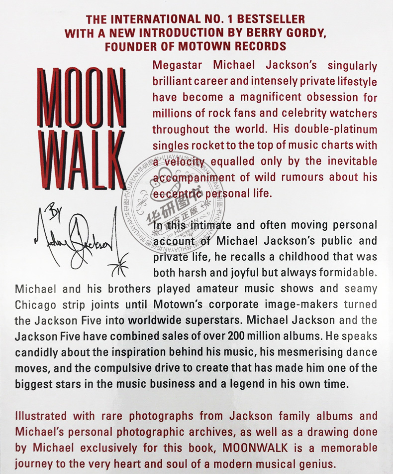 MOONWALK is illustrated with rare photographs from Jackson family albums and Michael's personal photographic archives, as well as a drawing done by Michael exclusively for the book. It reveals and celebrates, as no other book can, the life of this exceptional and beloved musician.